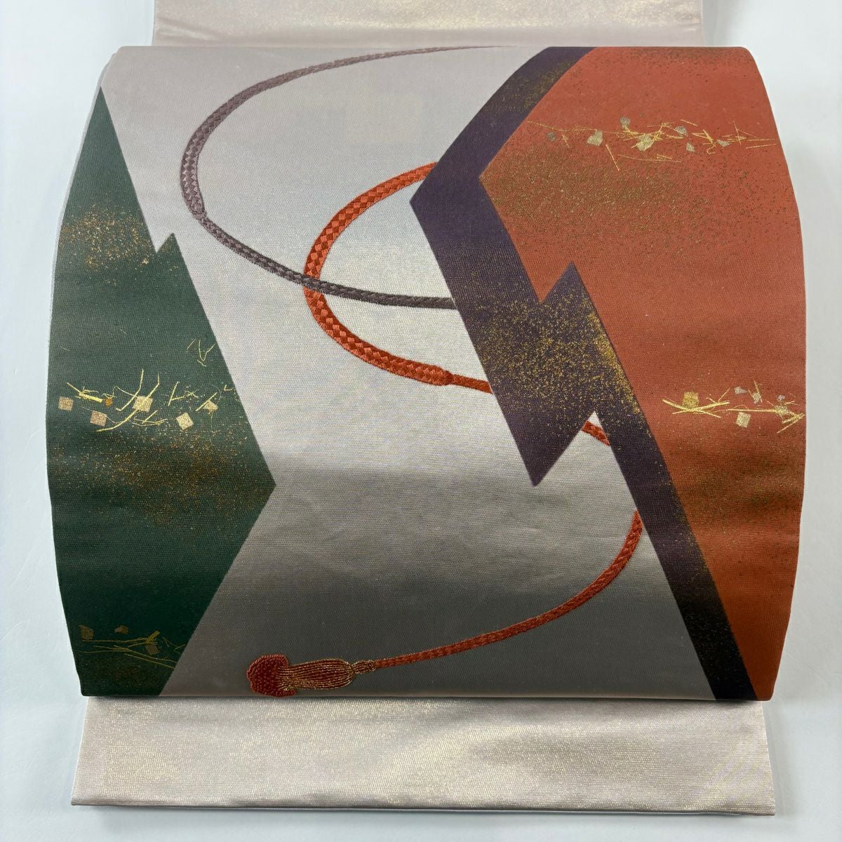【在庫一掃】 袋帯 秀品 箔散らし柄 組紐 金彩 刺繍 薄小豆 お太鼓柄 正絹
