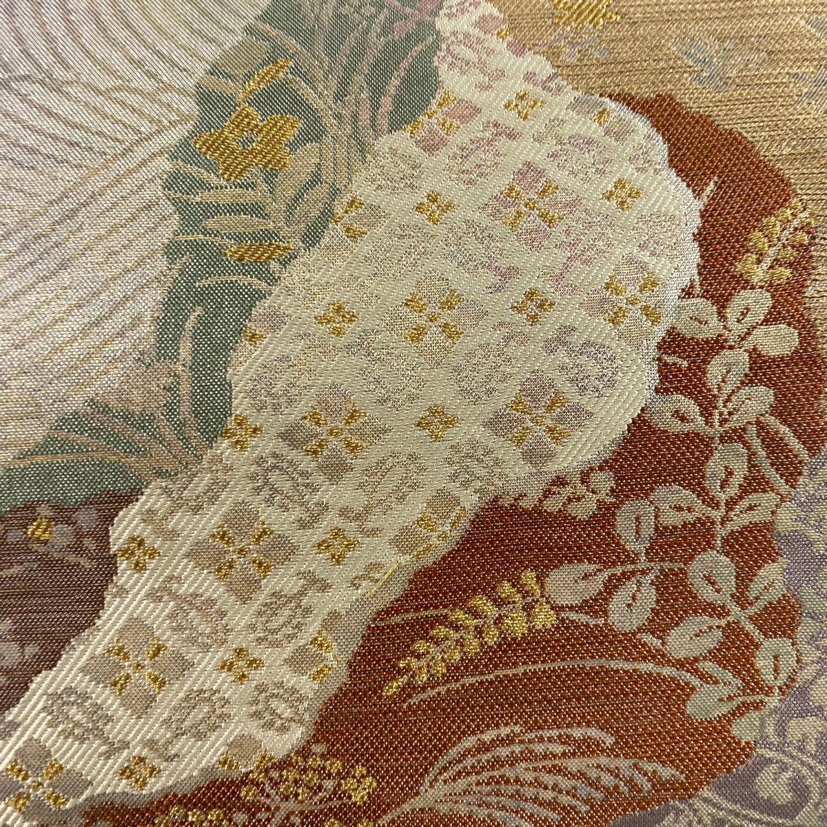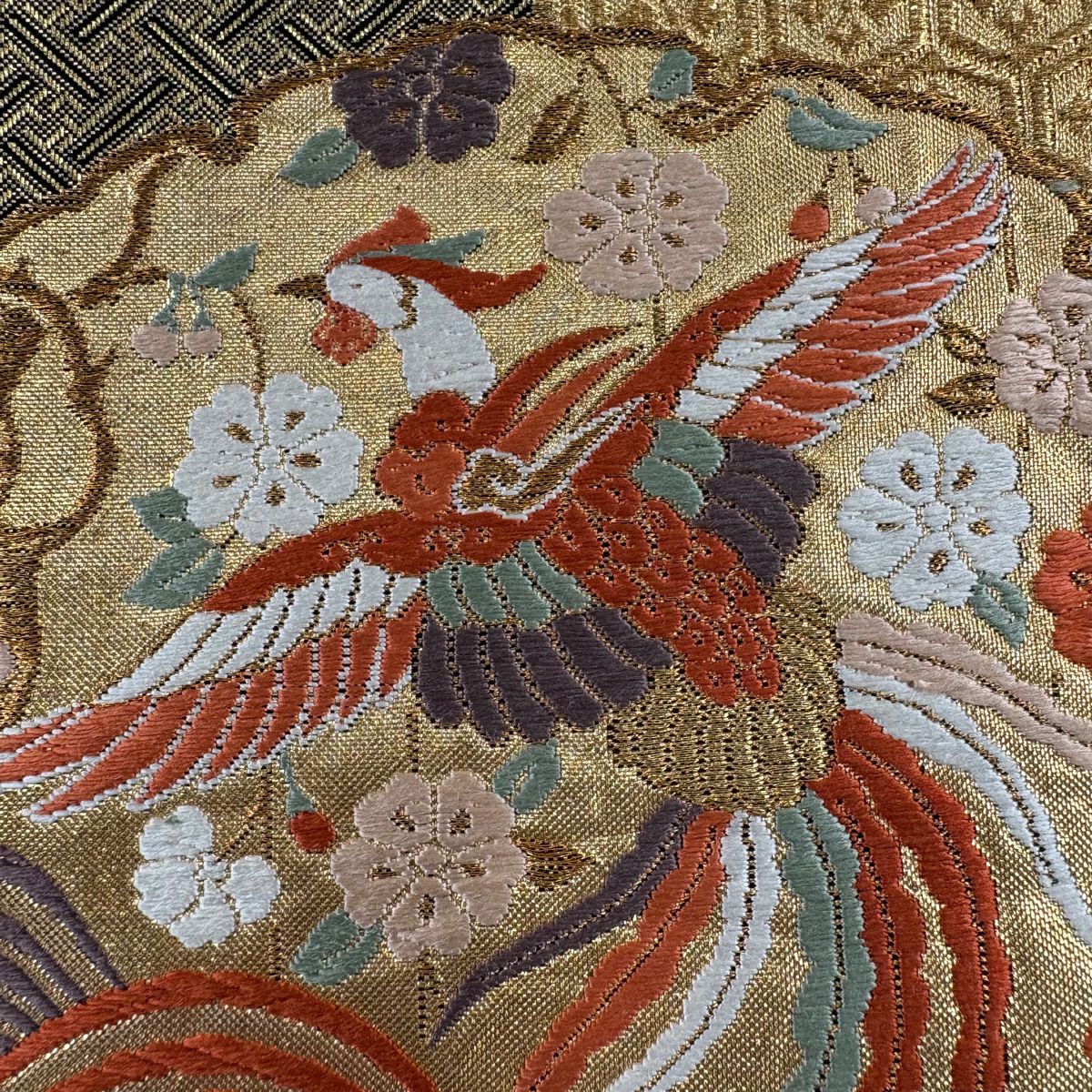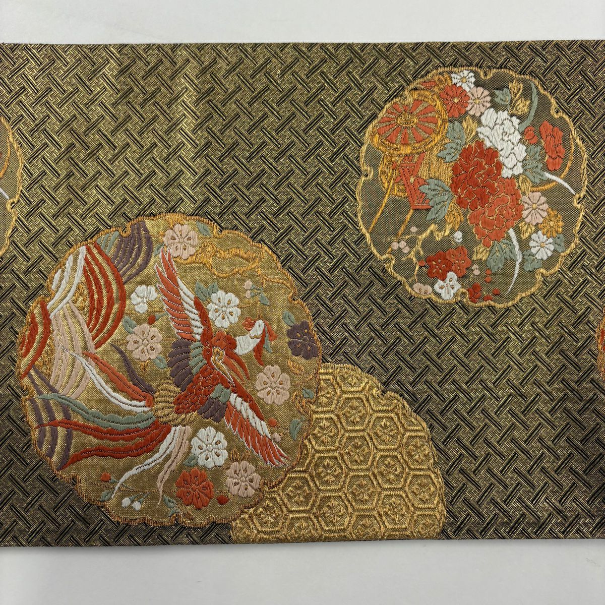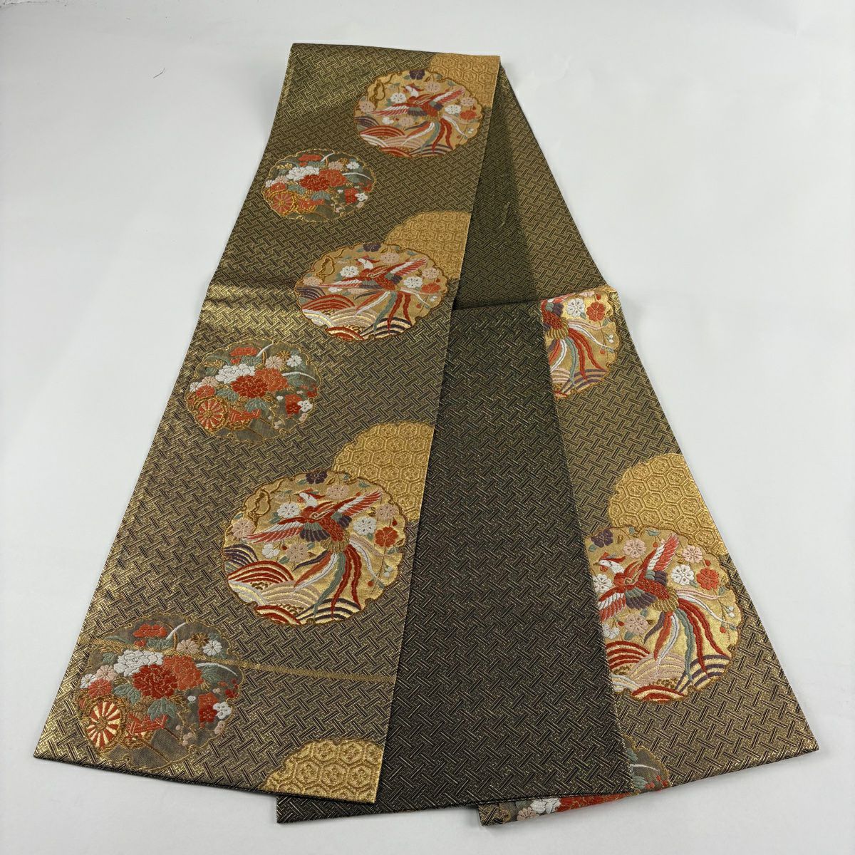 【在庫一掃】 袋帯 秀品 関西仕立て 笠松 尾長鳥 箔 唐織 金色 六通 正絹