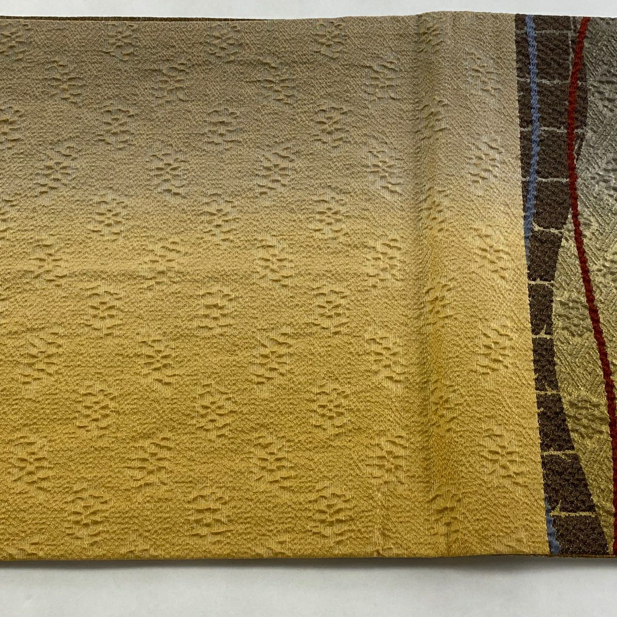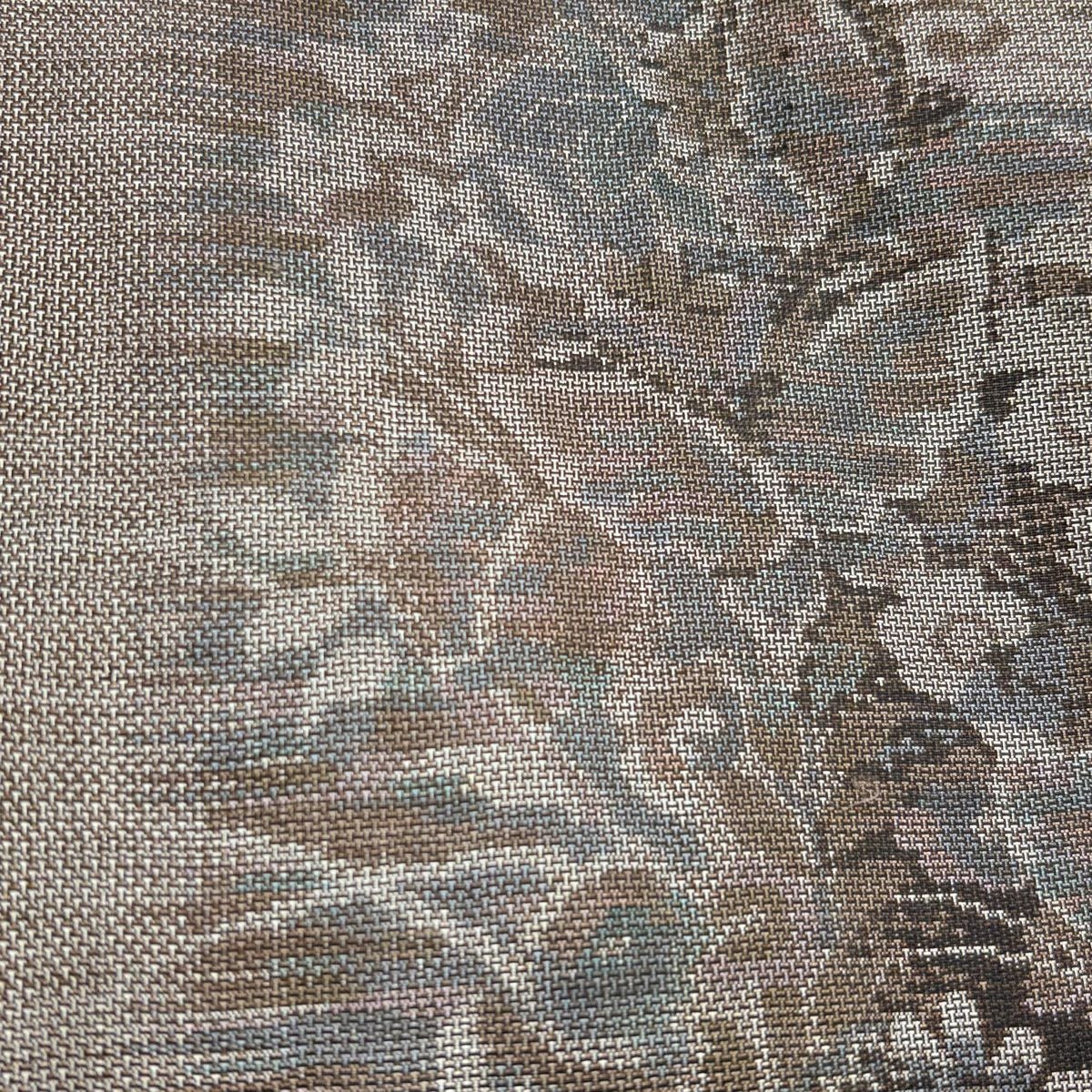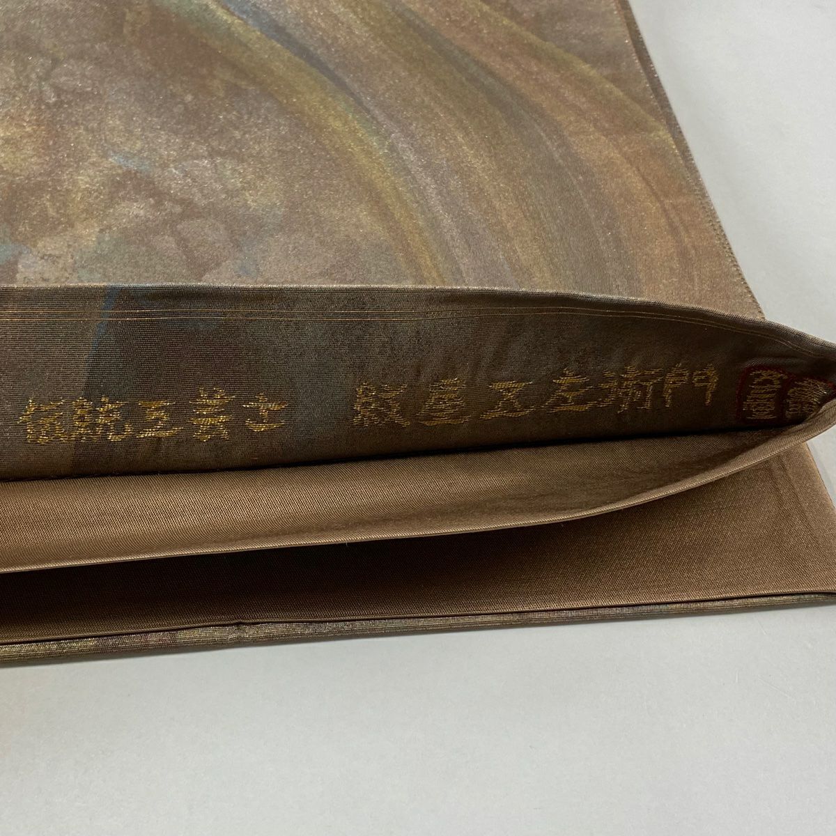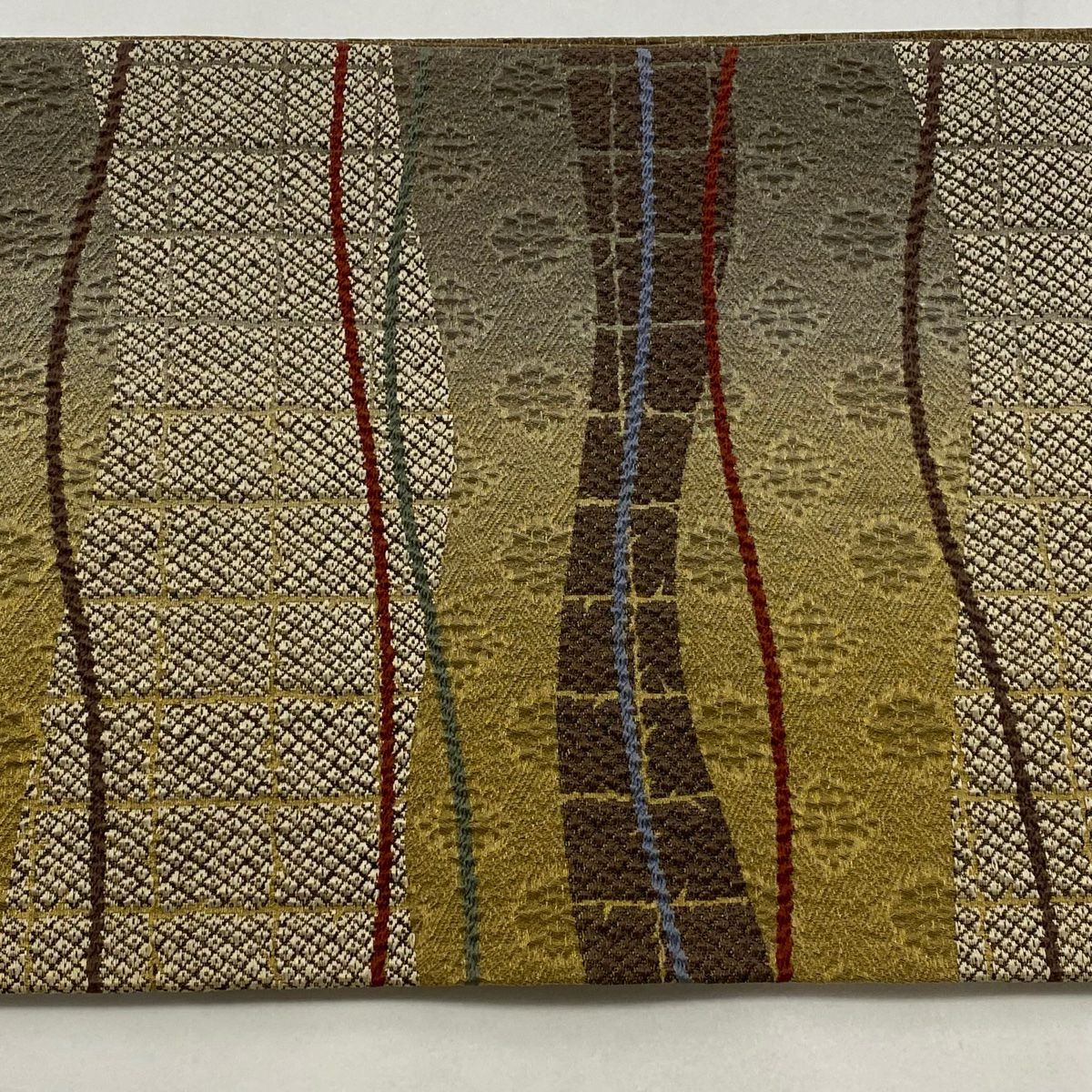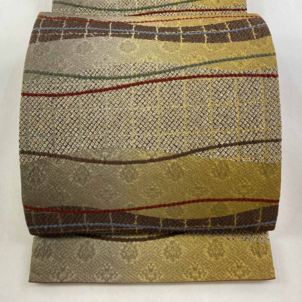 【在庫一掃】 【美品】 袋帯 秀品 格子 紗綾型 箔 ぼかし 薄茶色 六通 正絹
