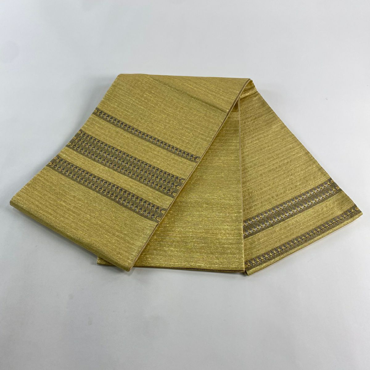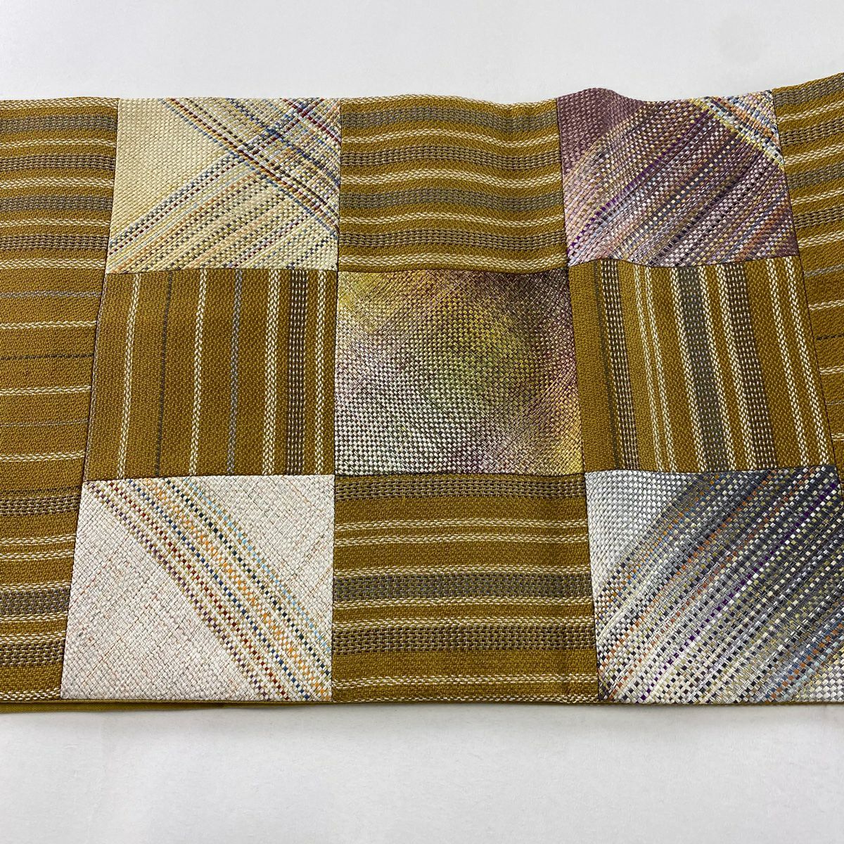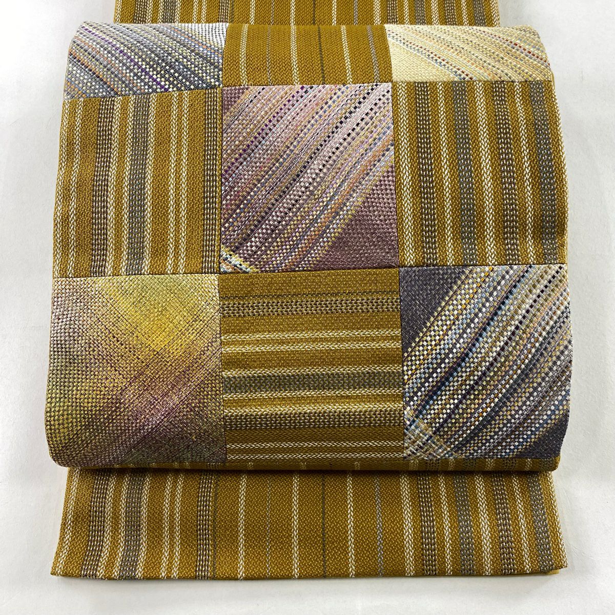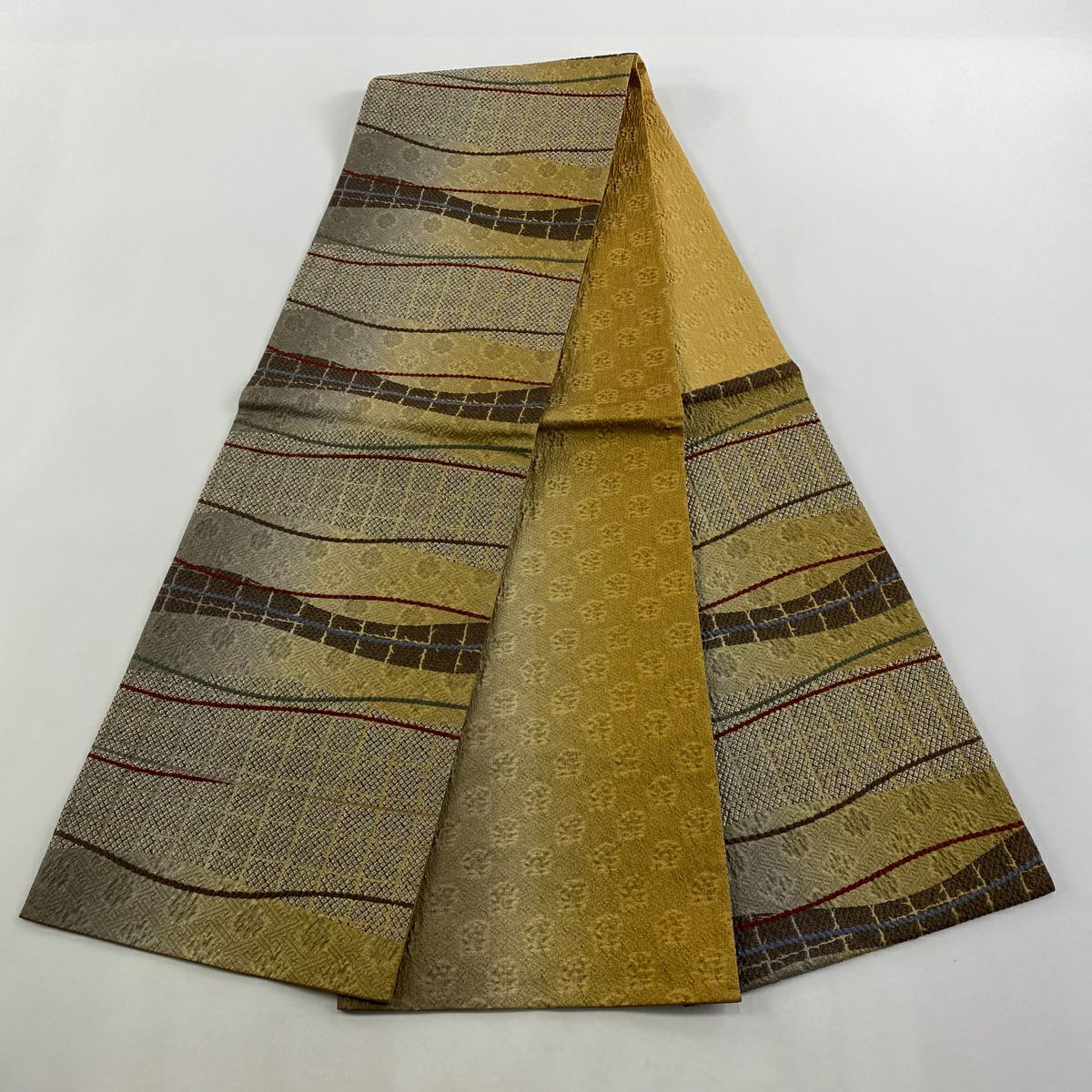 【在庫一掃】 【美品】 袋帯 秀品 市松市 縞 金銀糸 山吹茶色 お太鼓柄 正絹