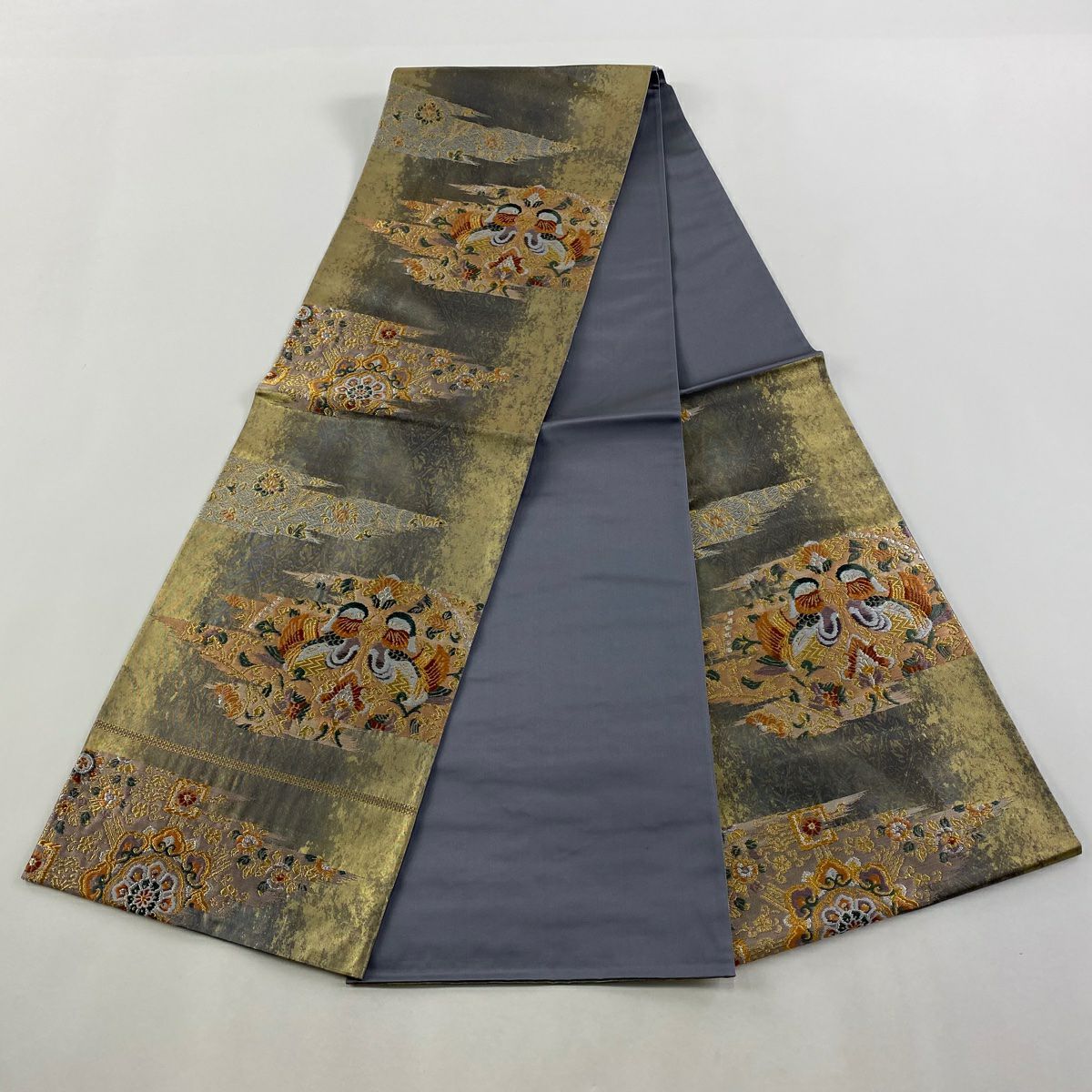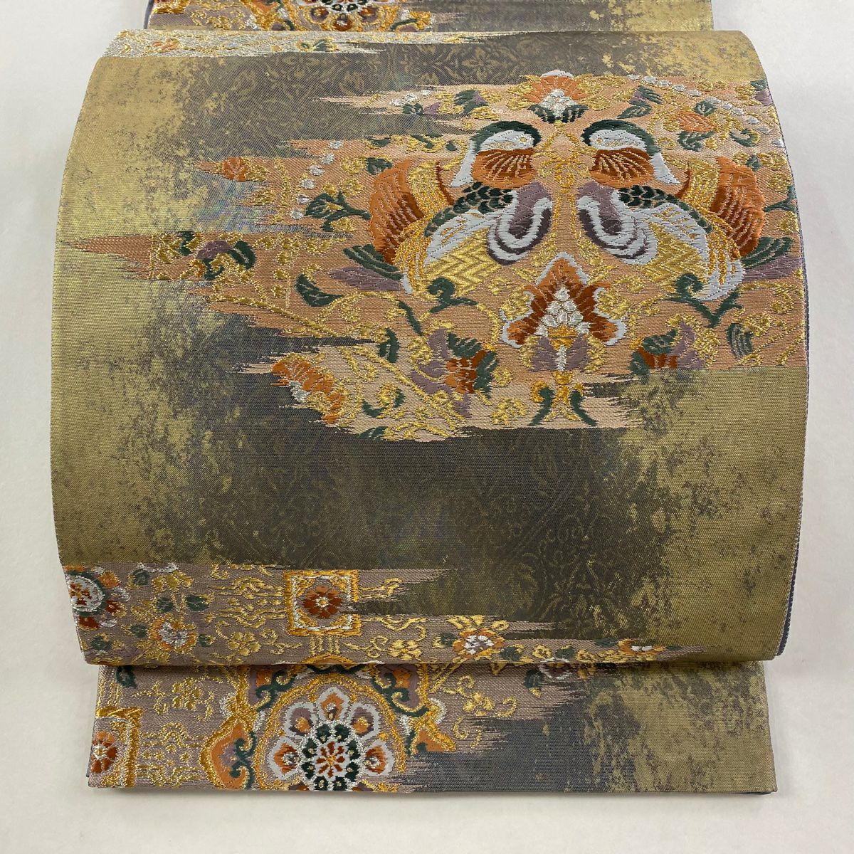 【在庫一掃】 【美品】 袋帯 秀品 向かい鳥 草花 金銀糸 箔 灰紫 六通 正絹