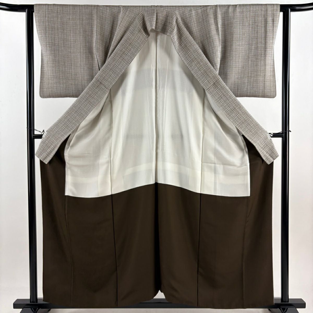 【在庫一掃】 小紋 身丈157cm 裄丈62cm S 袷 格子 灰茶 正絹 秀品