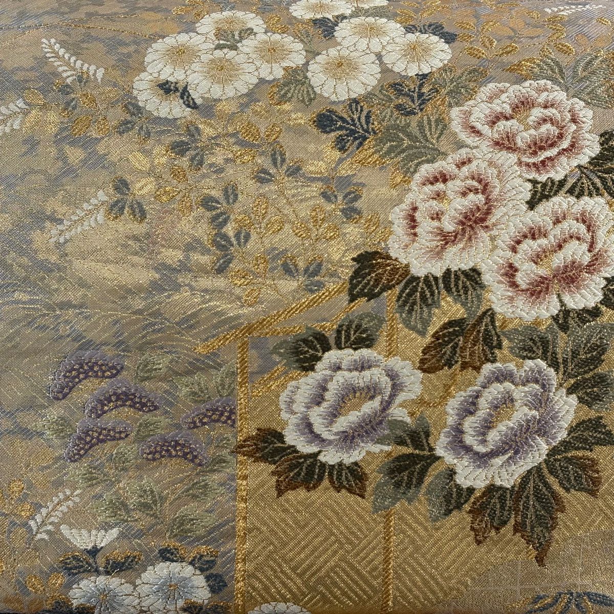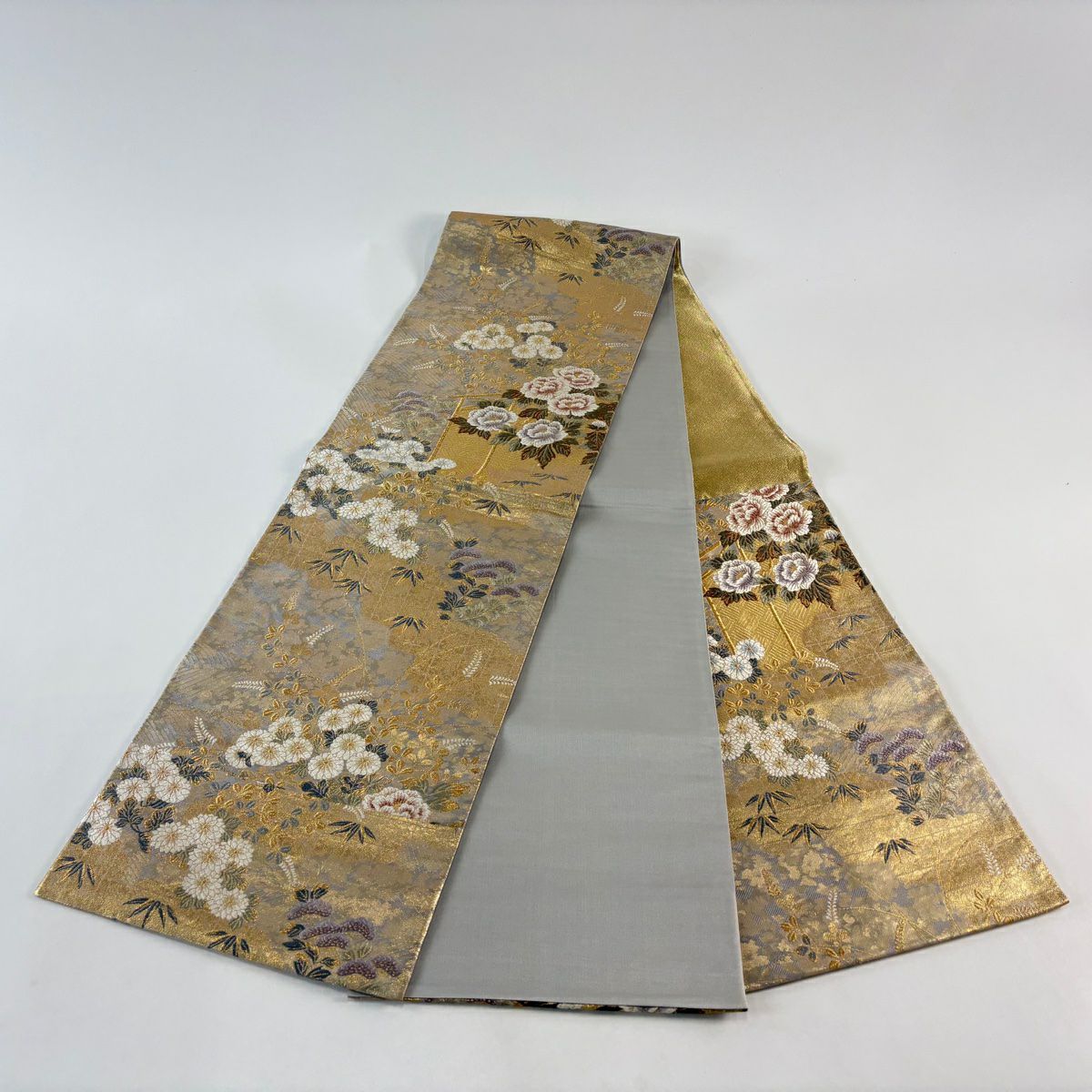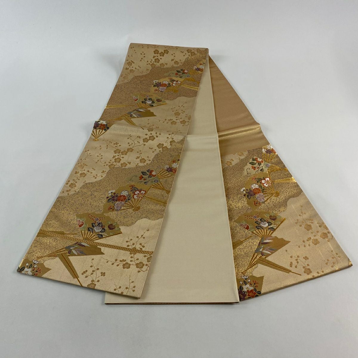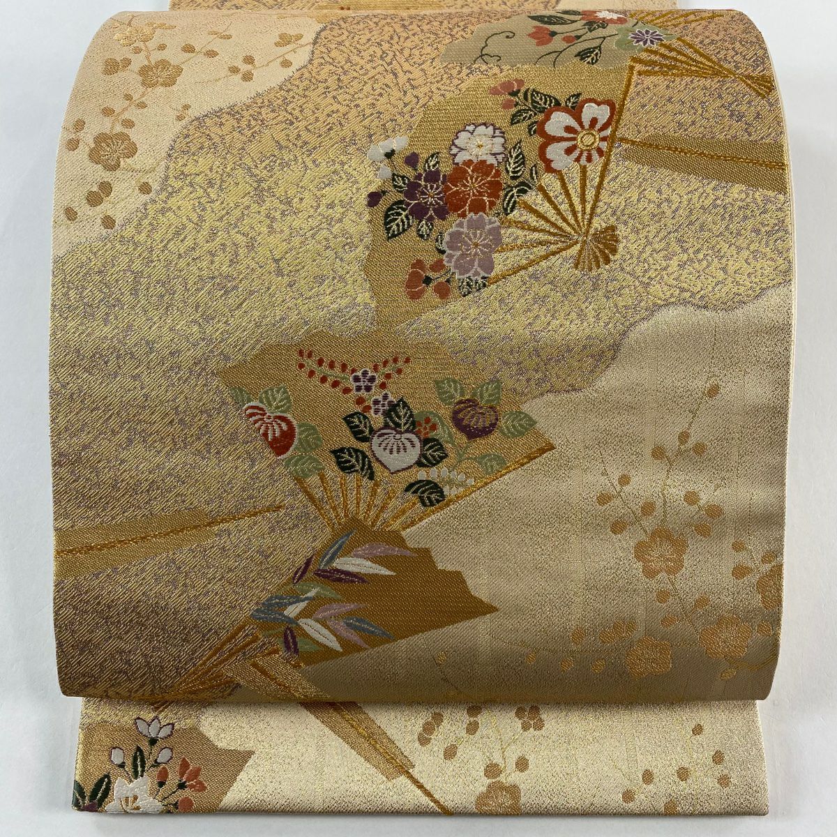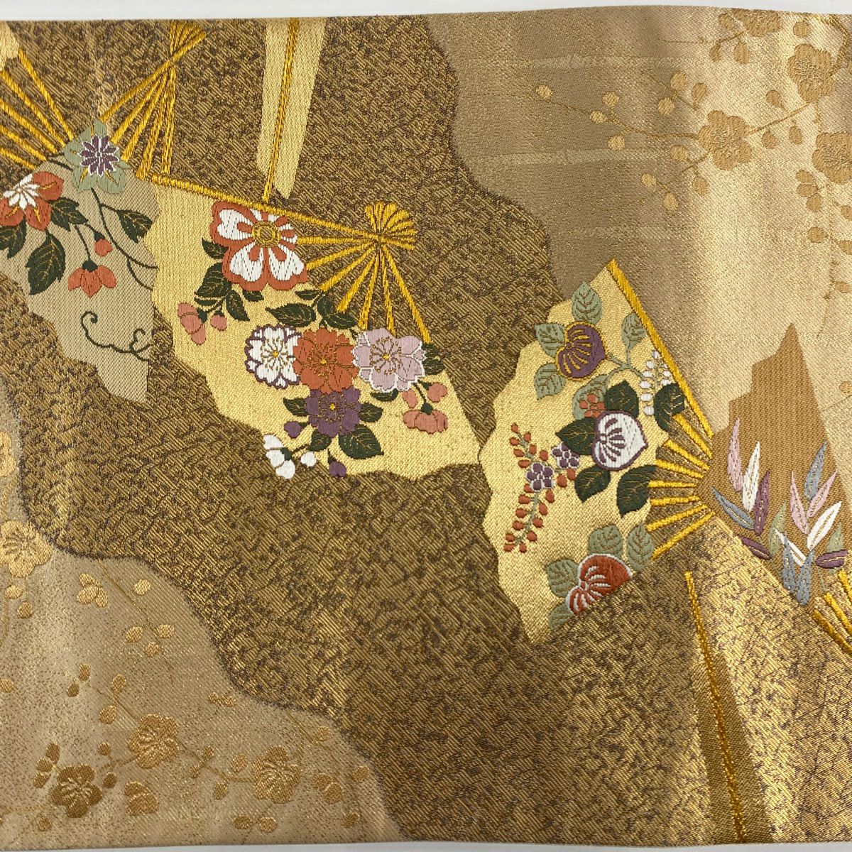 【在庫一掃】 【美品】 袋帯 秀品 道長桧扇散 草花 刺繍 金糸 金色 六通 正絹