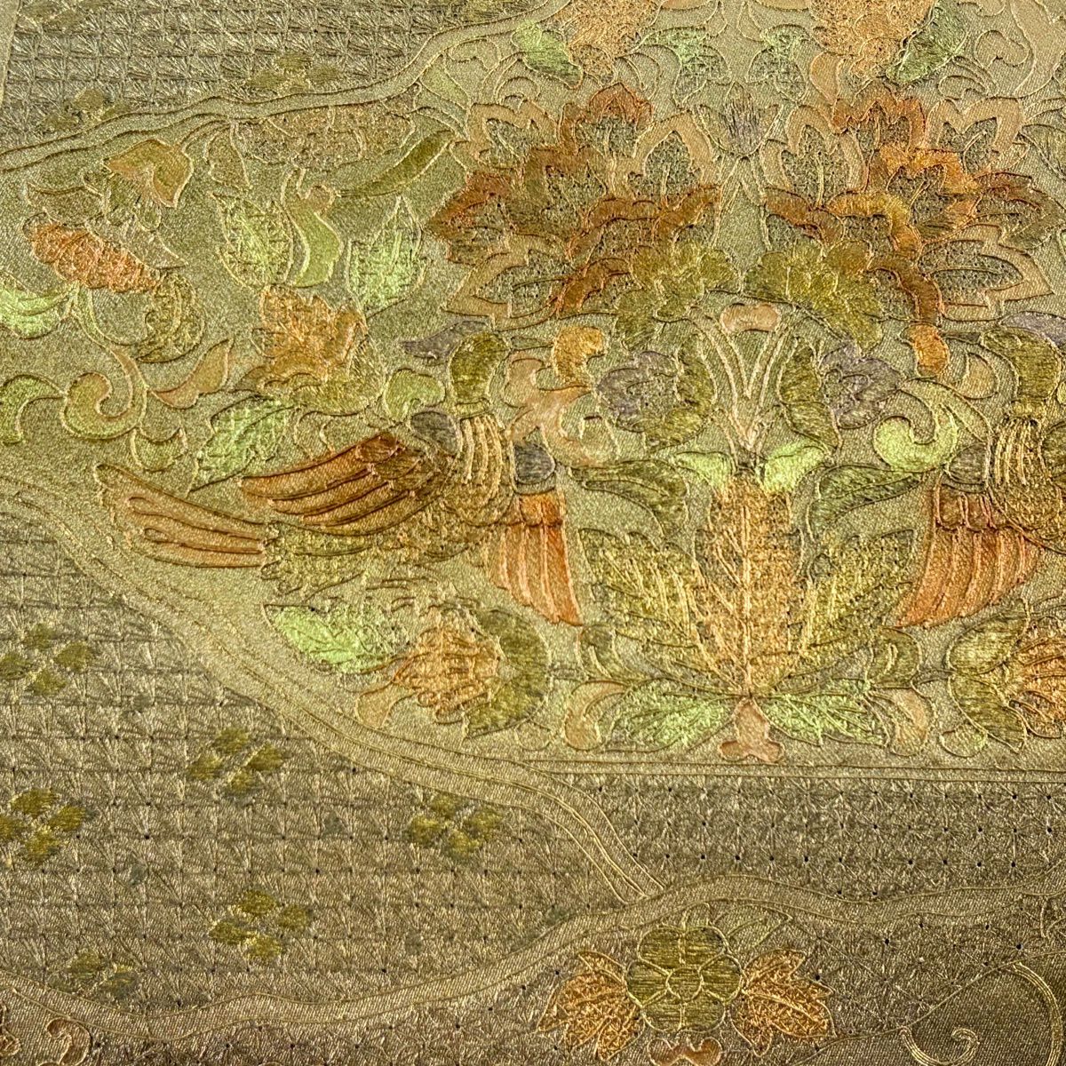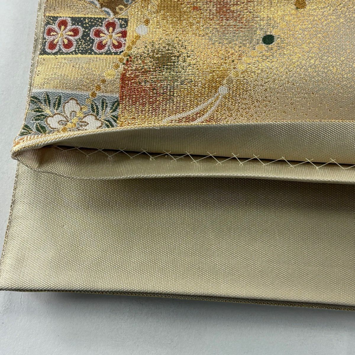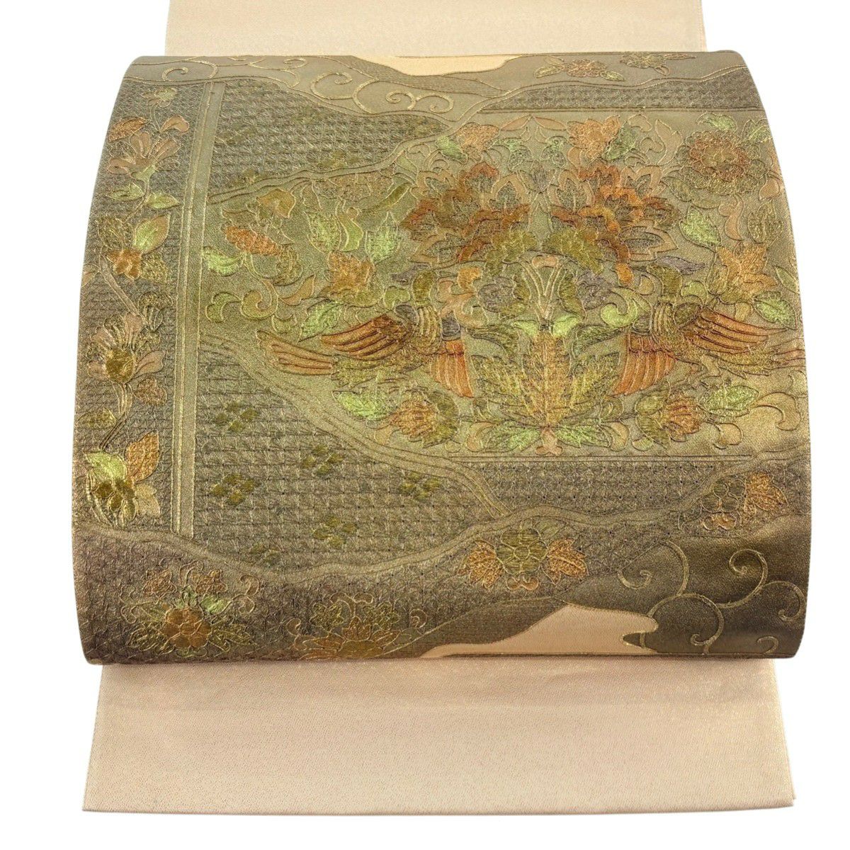 【美品】 袋帯 秀品 関西仕立て 鬘帯 花鳥 箔 金糸 ベージュ 六通 正絹