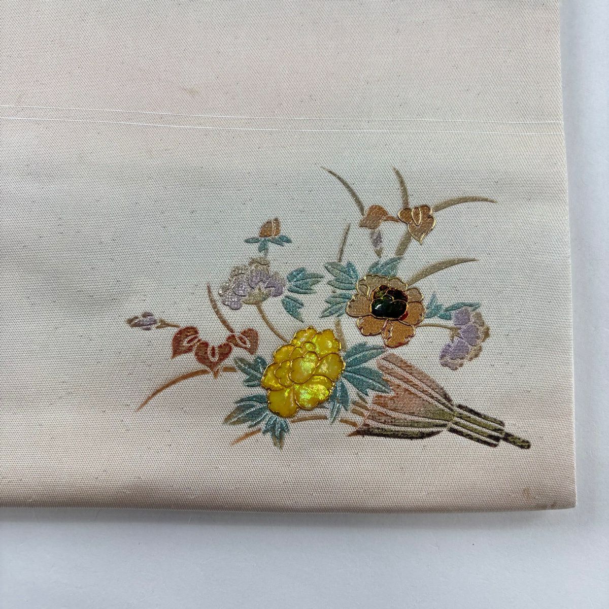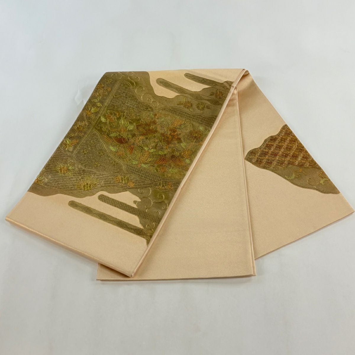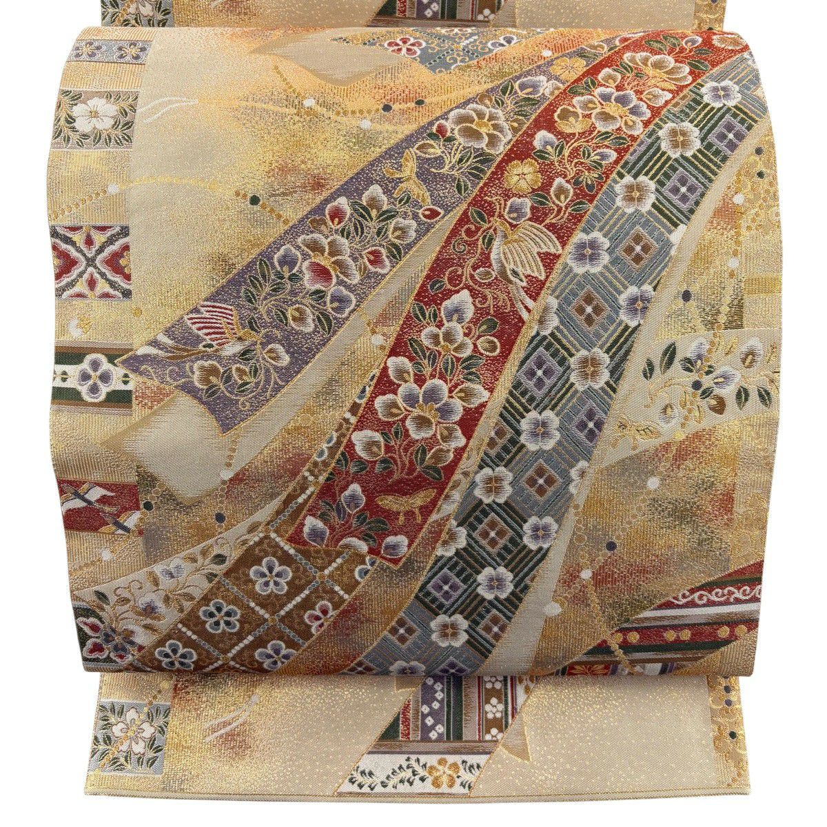 【美品】 袋帯 秀品 関西仕立て 鬘帯 花鳥 箔 金糸 ベージュ 六通 正絹