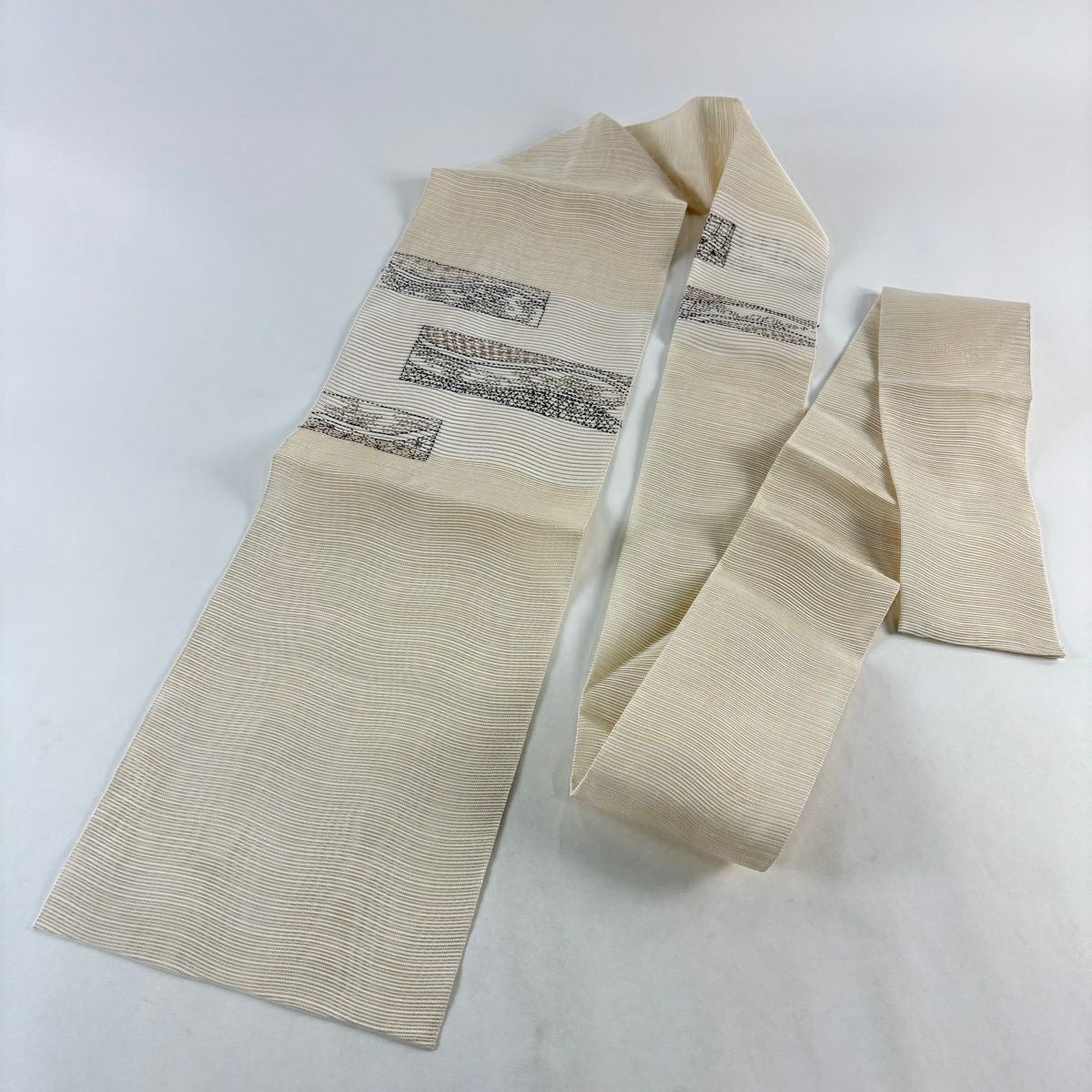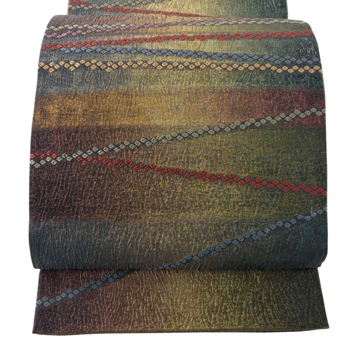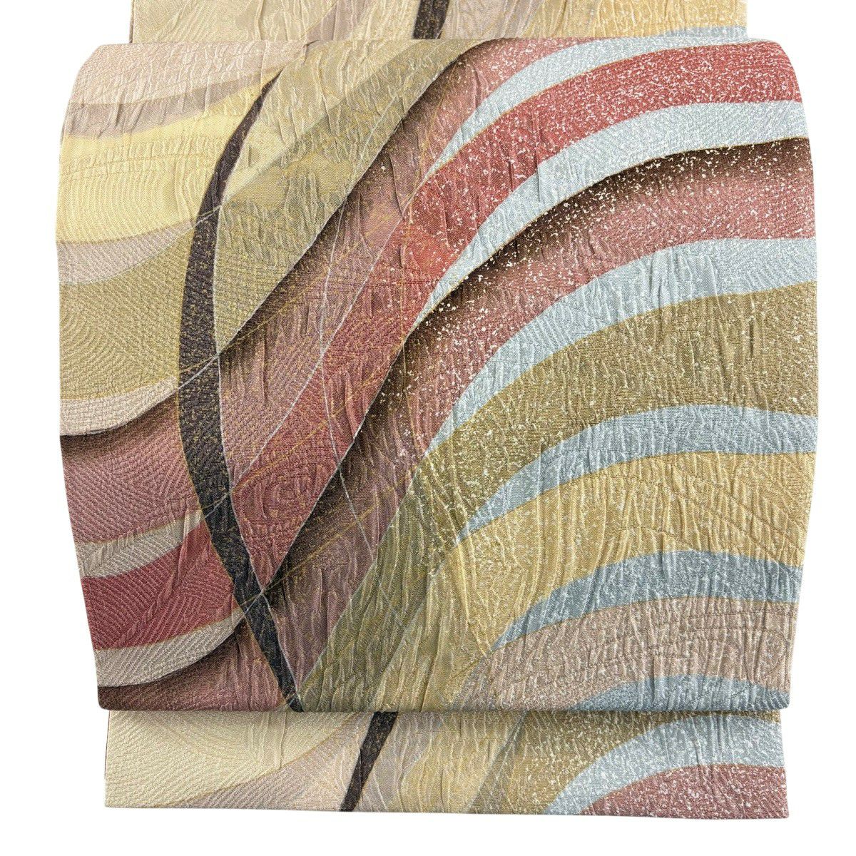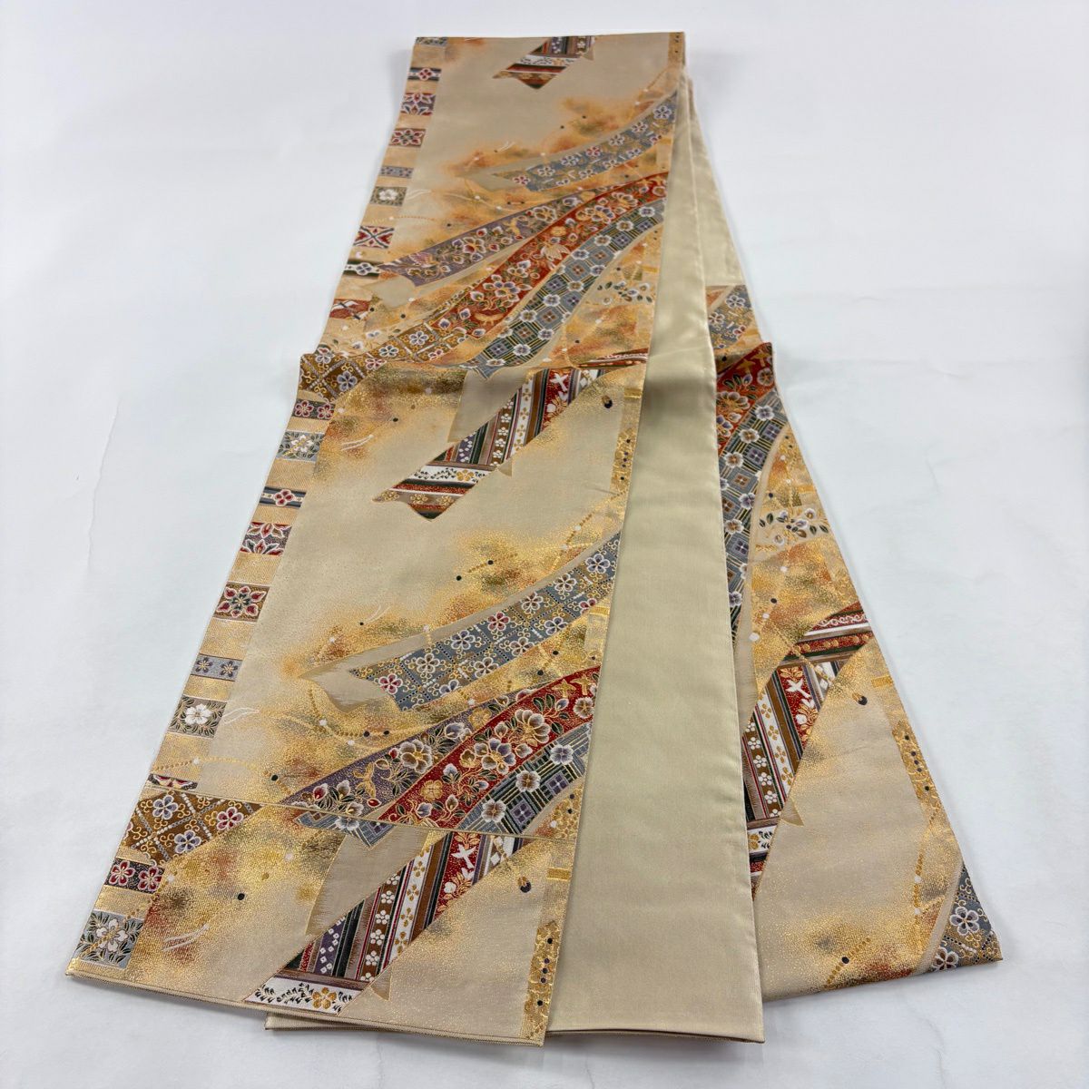 【美品】 袋帯 秀品 落款あり 鵬翔 よろけ縞 金銀彩 ベージュ 全通 正絹