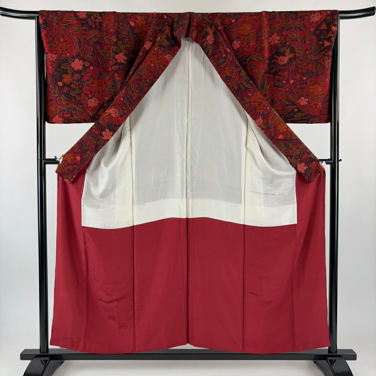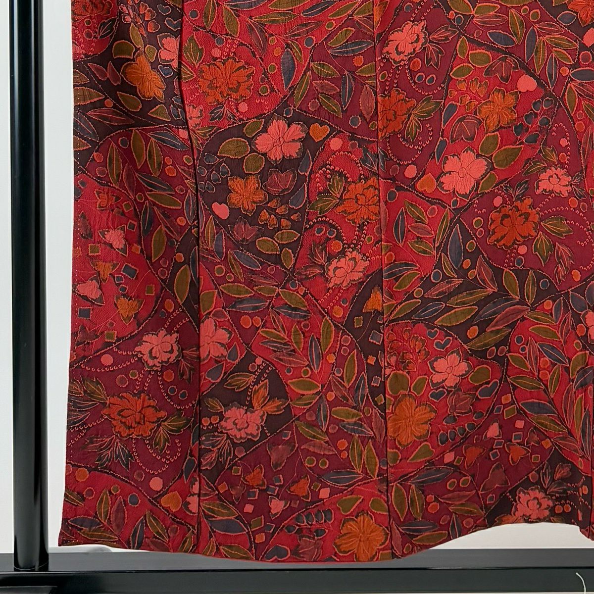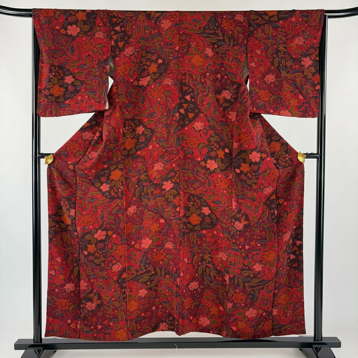 【美品】 小紋 身丈156cm 裄丈65cm M 袷 草花 絞り 赤黒 正絹 秀品