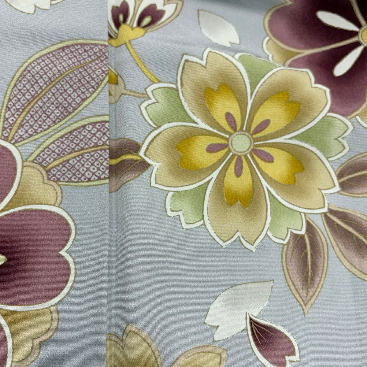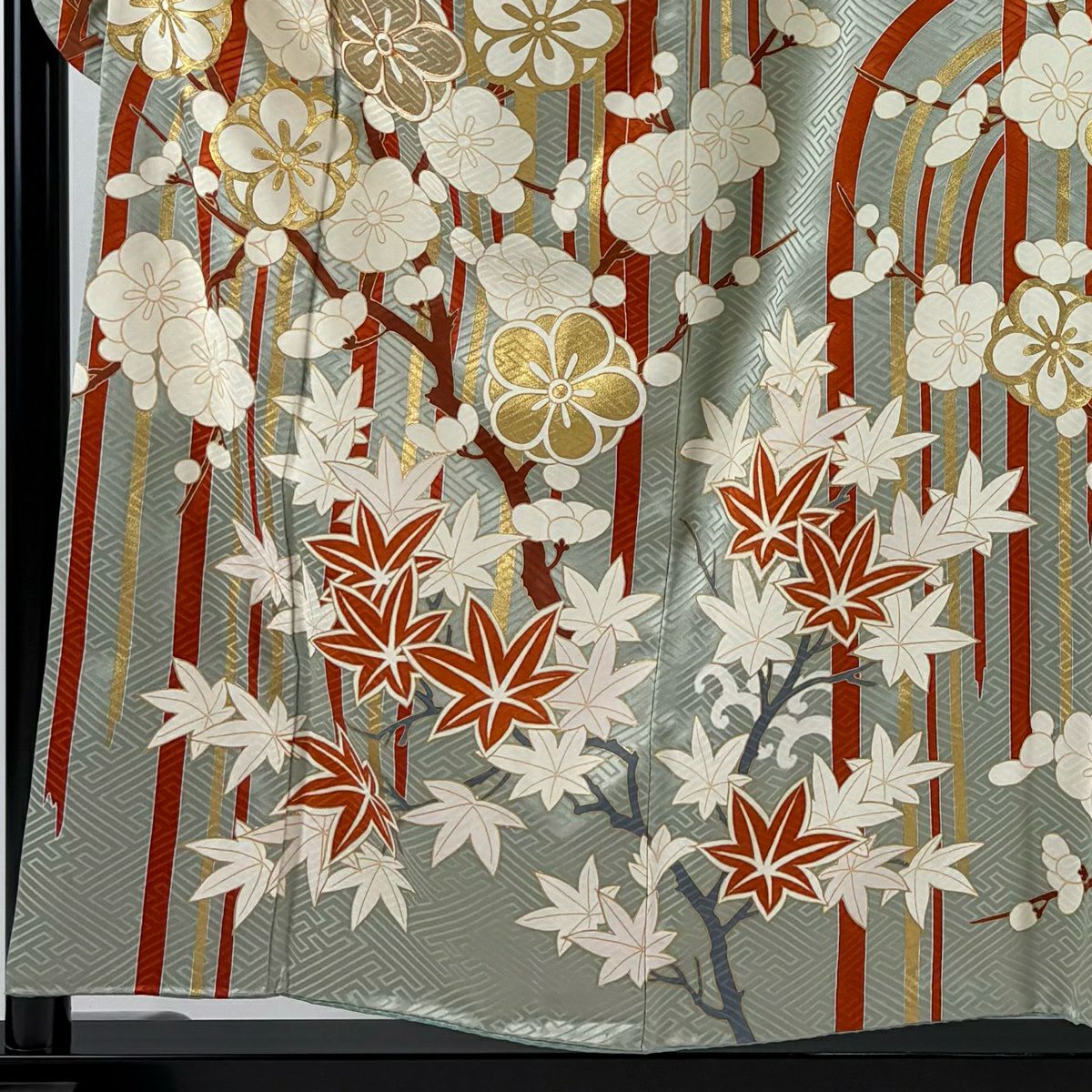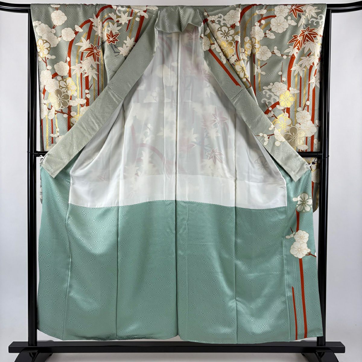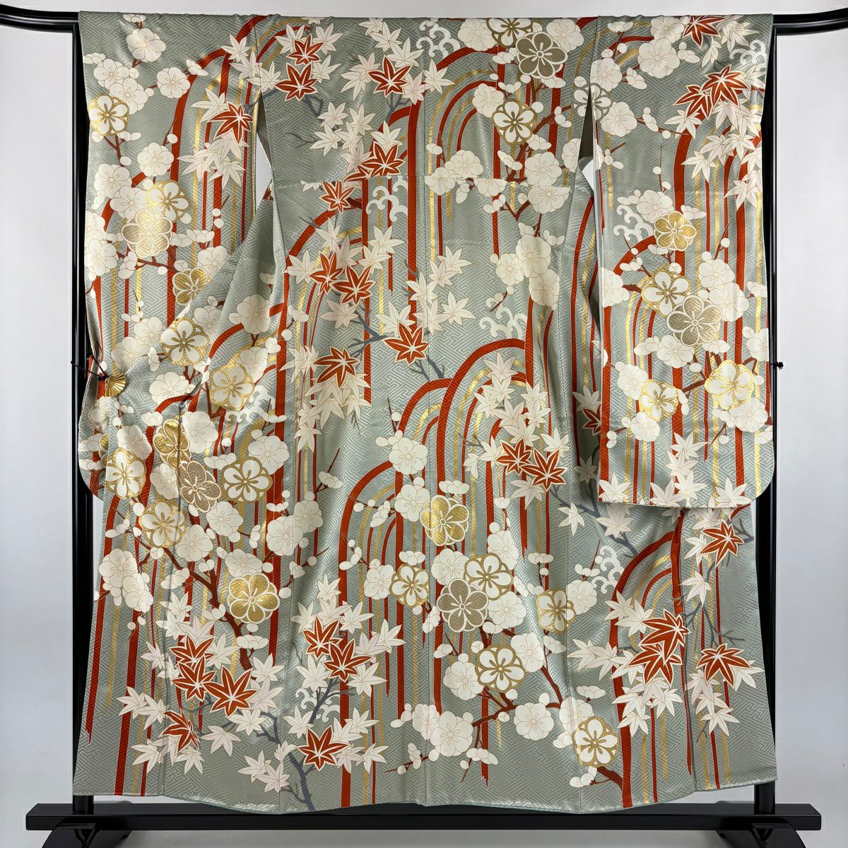 振袖 身丈155.5cm 裄丈65cm M 袷 枝梅 楓 金糸 金彩 灰緑 正絹 秀品