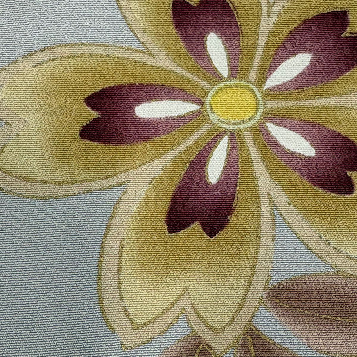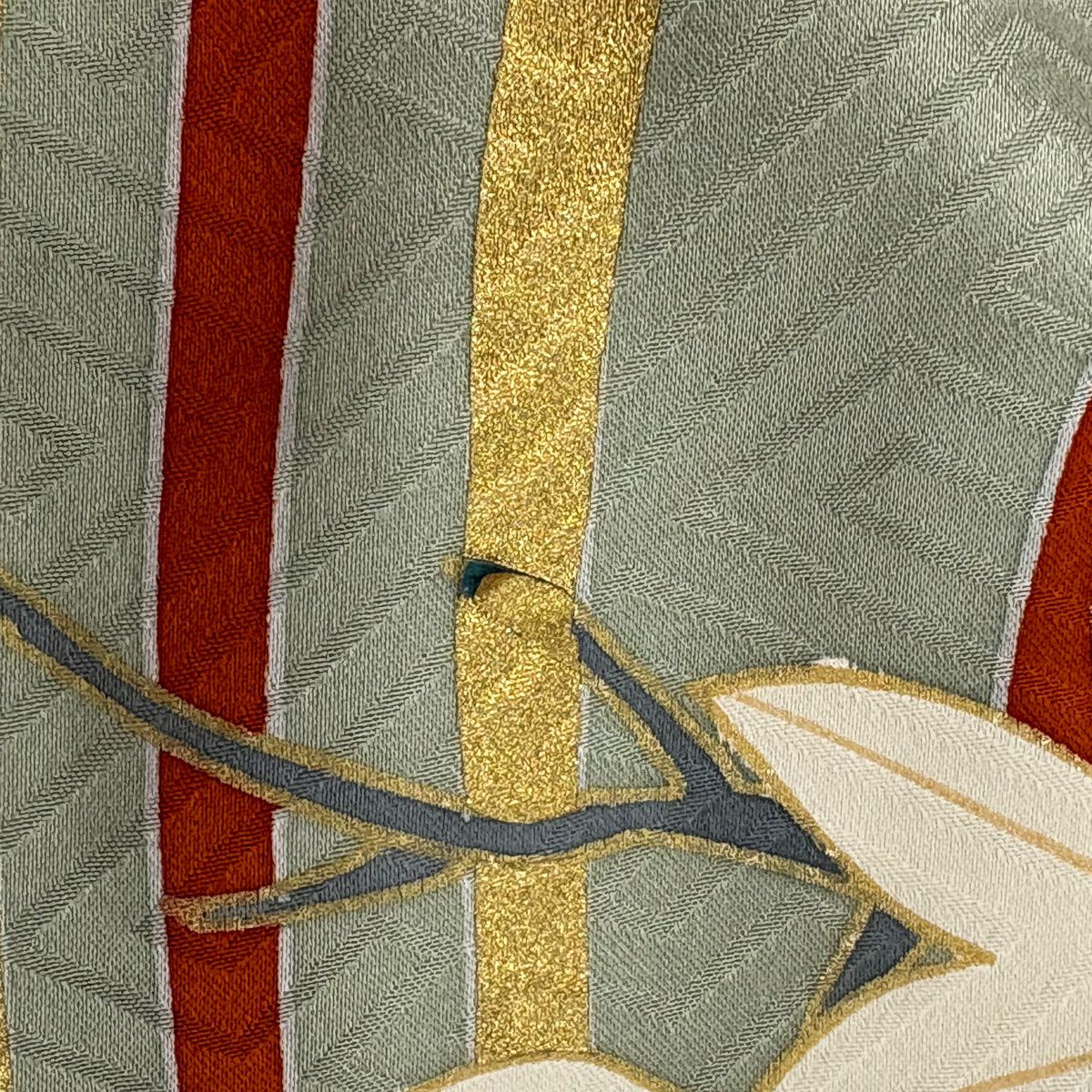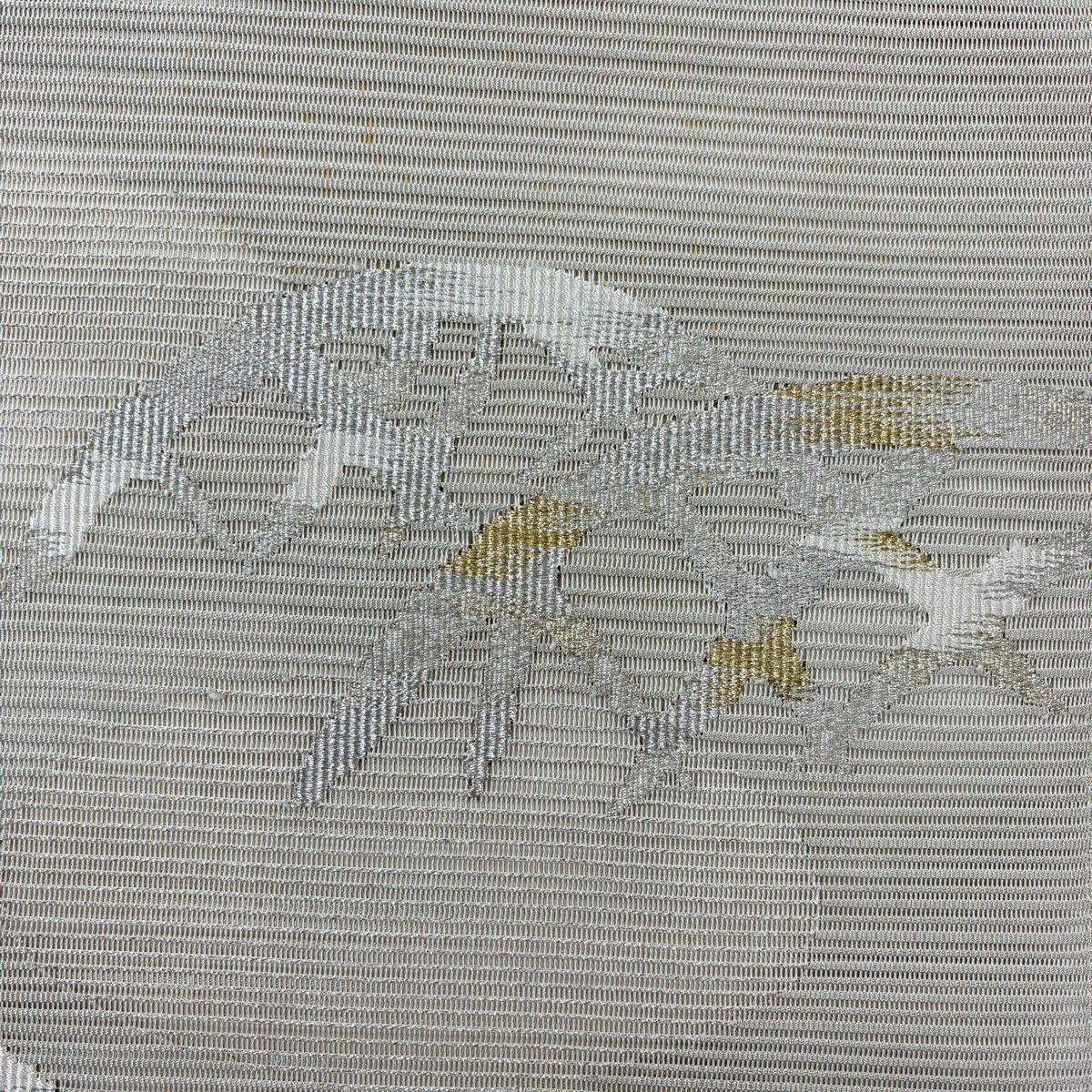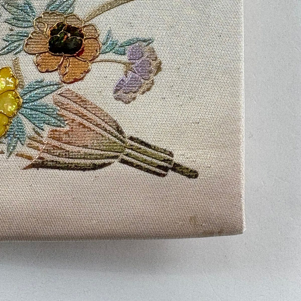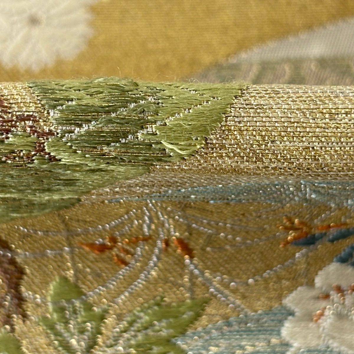 袋帯 秀品 落款あり 笹岡秀水 琳派写 巻物 草花 刺繍 金糸 銀色 六通 正絹