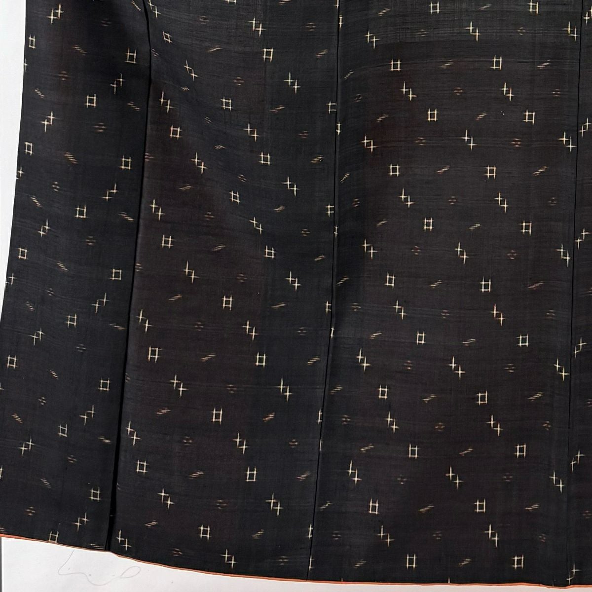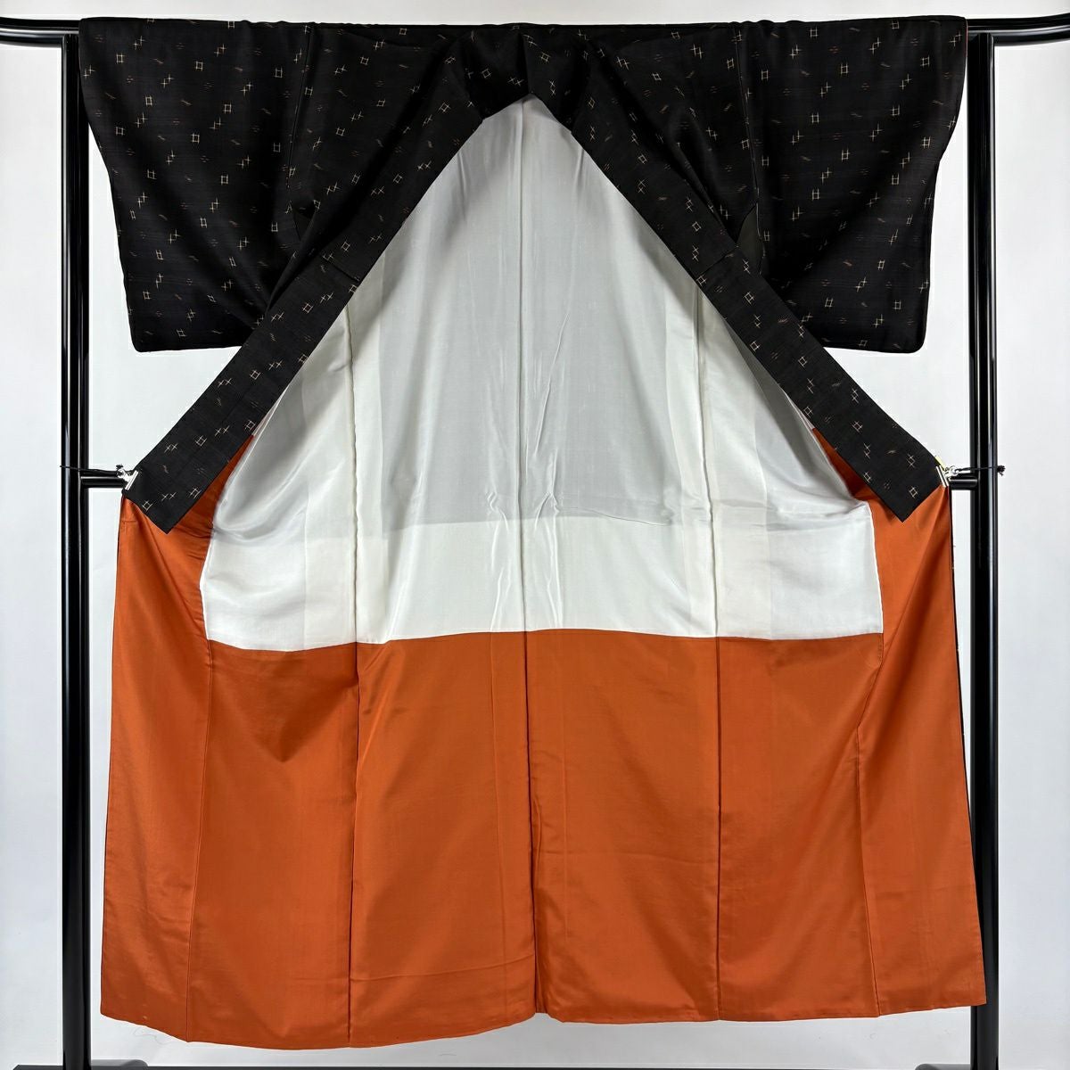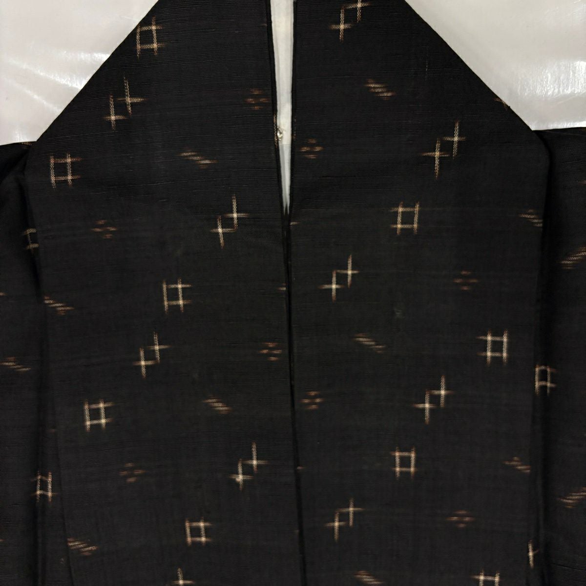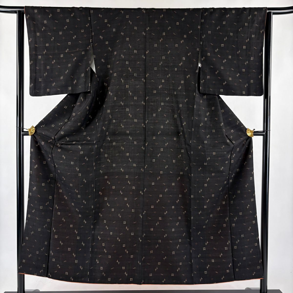 紬 身丈152cm 裄丈63.5cm S 袷 井桁絣 幾何学模様 墨色 正絹 秀品