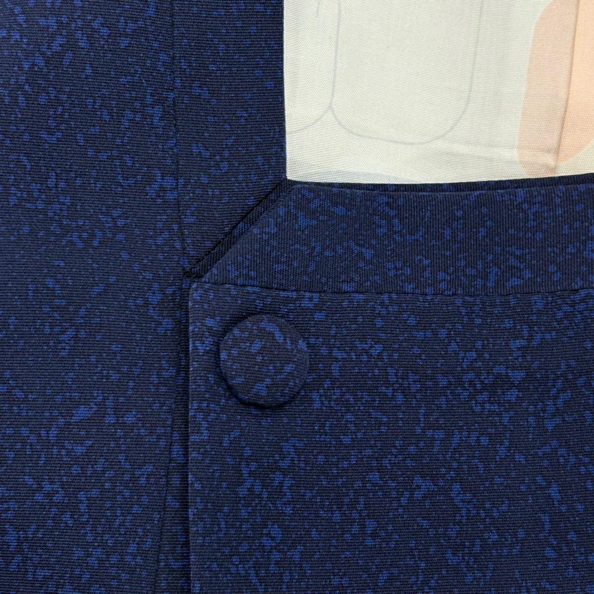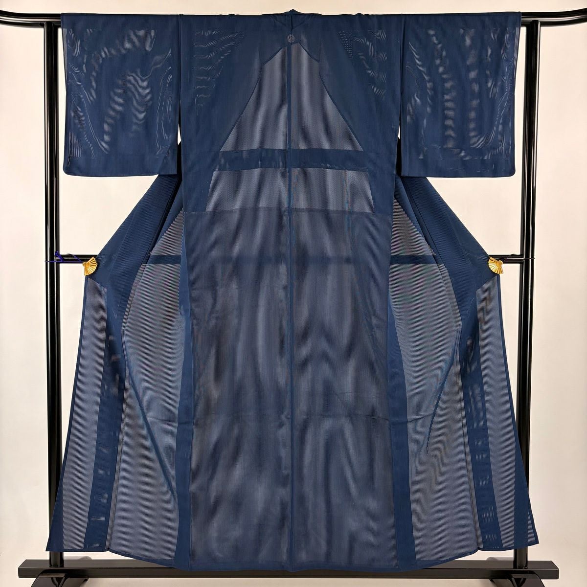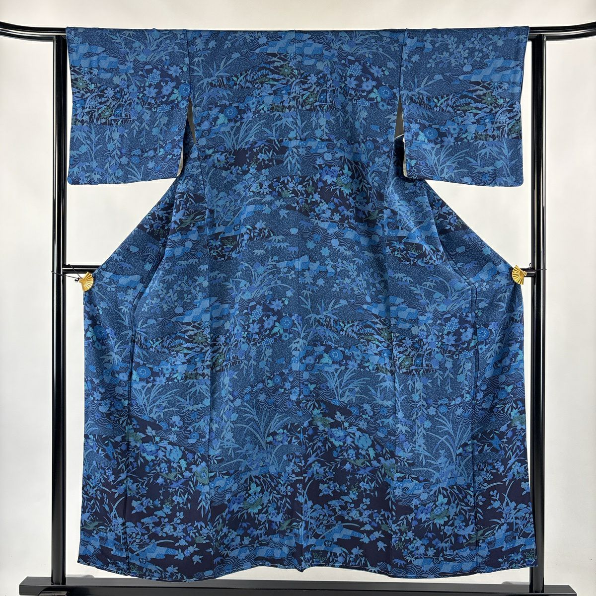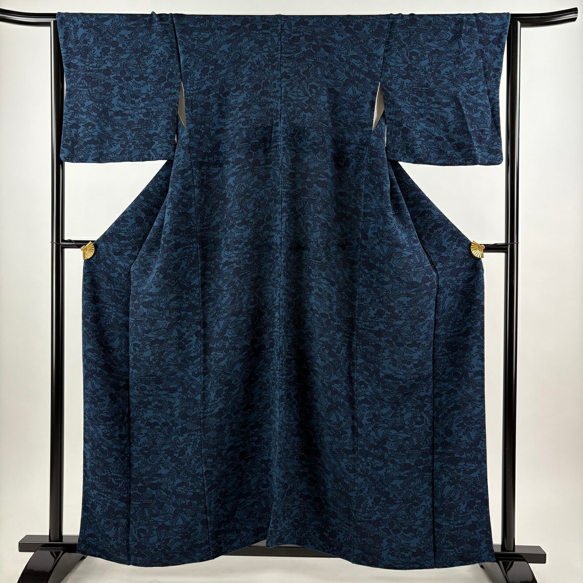 小紋 身丈157.5cm 裄丈65.5cm M 袷 建物 草花 縮緬 藍色 正絹 秀品