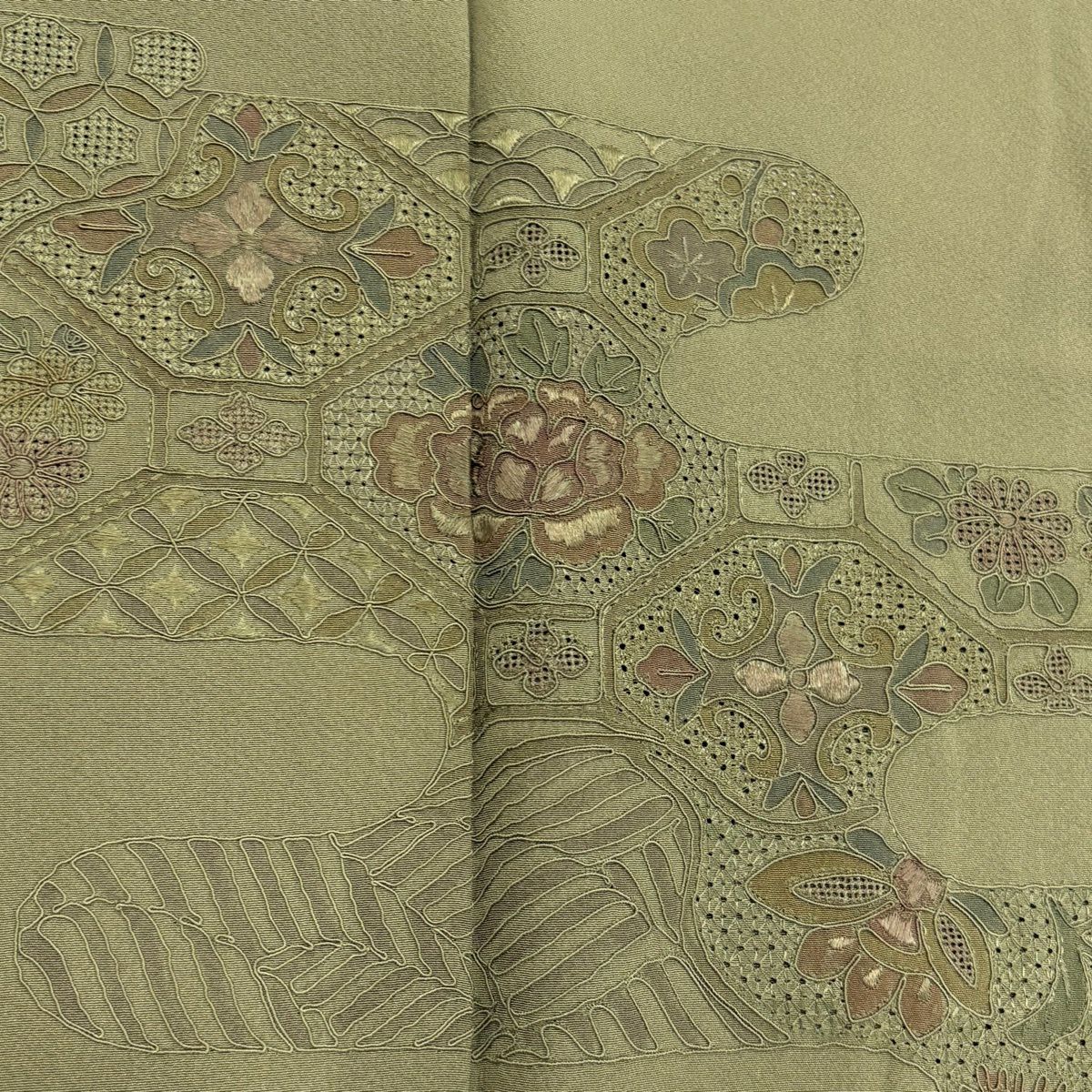 付下げ 身丈161cm 裄丈65cm M 袷 蜀江文 ヱ霞 刺繍 灰緑 正絹 秀品