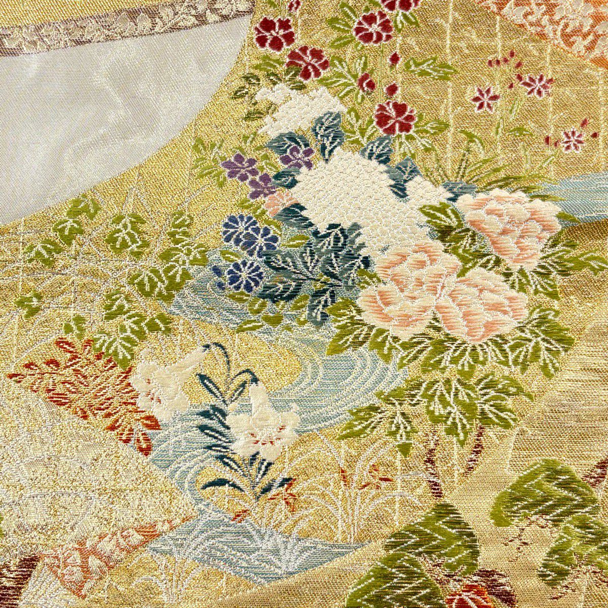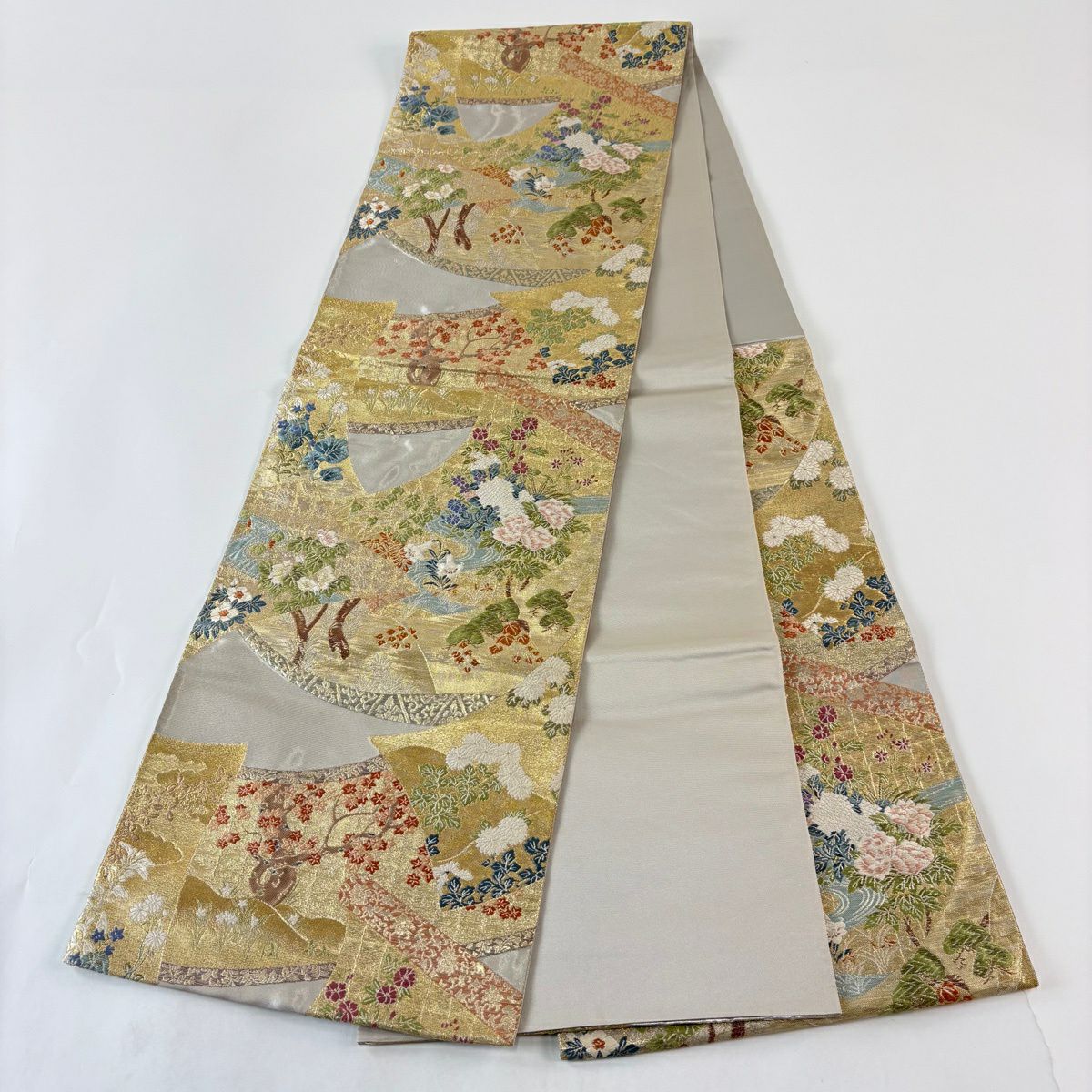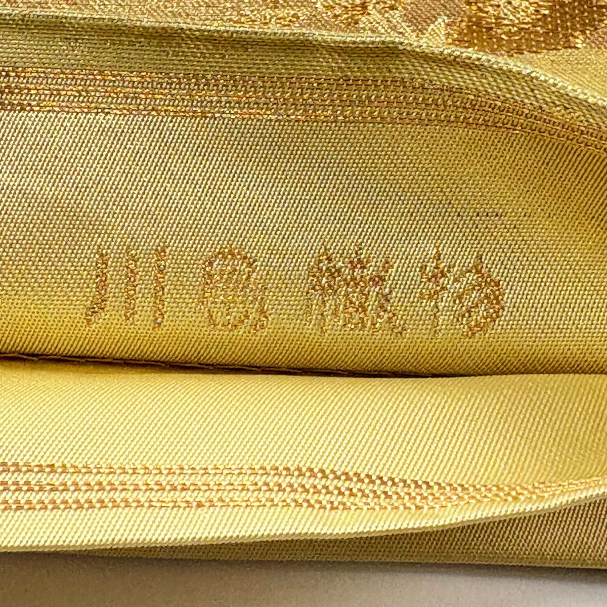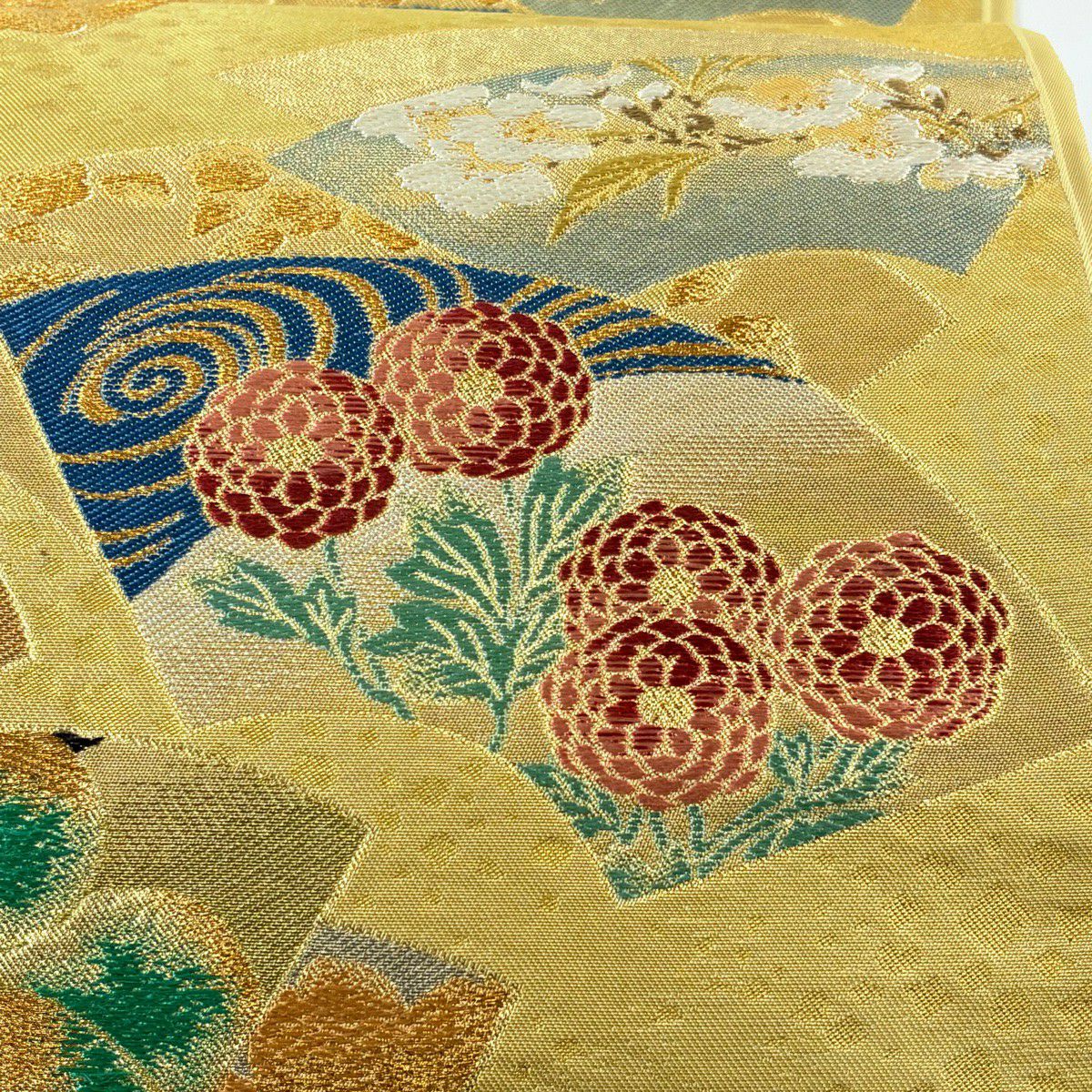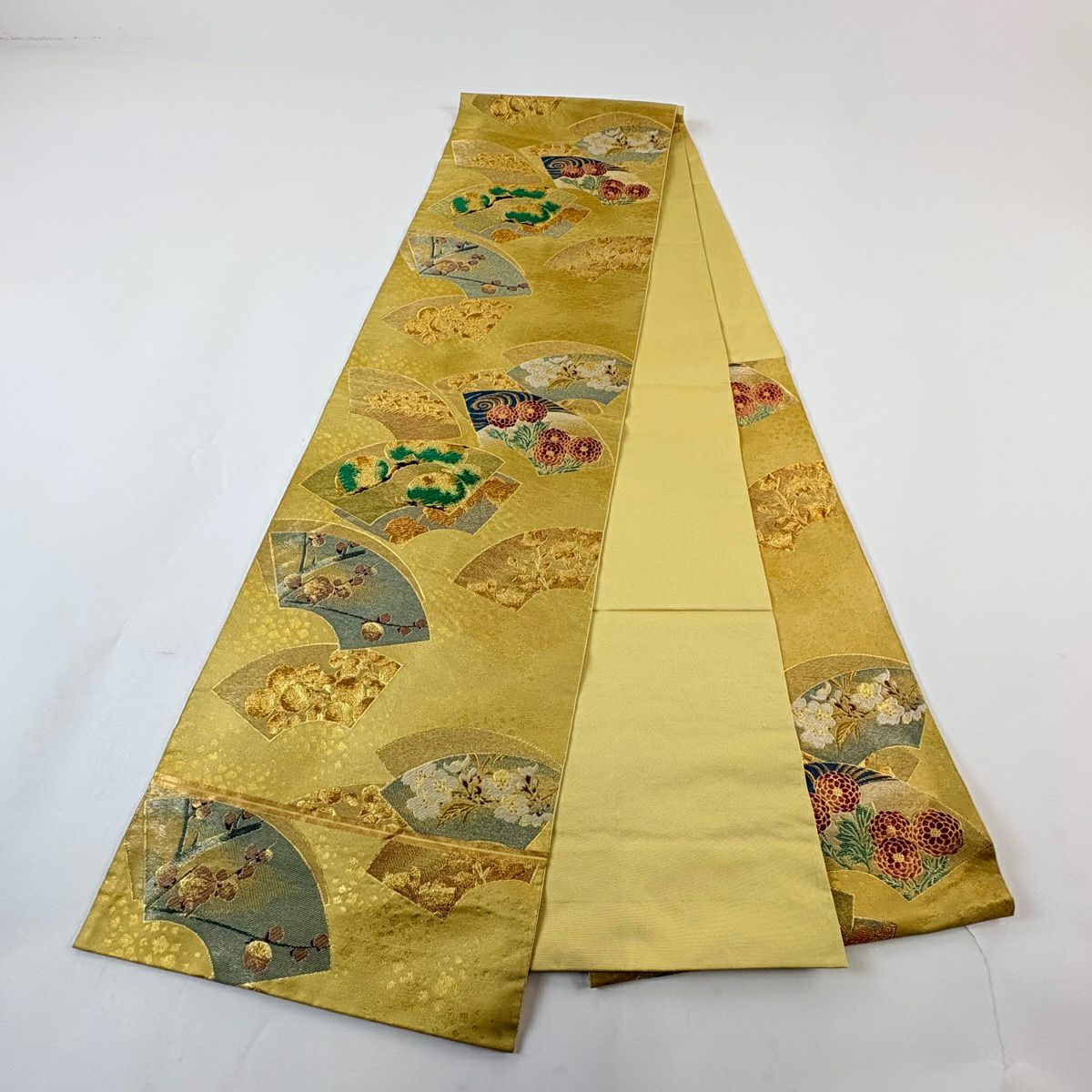 【美品】 袋帯 秀品 川島織物 落款あり 扇面 草花 金糸 からし色 六通 正絹