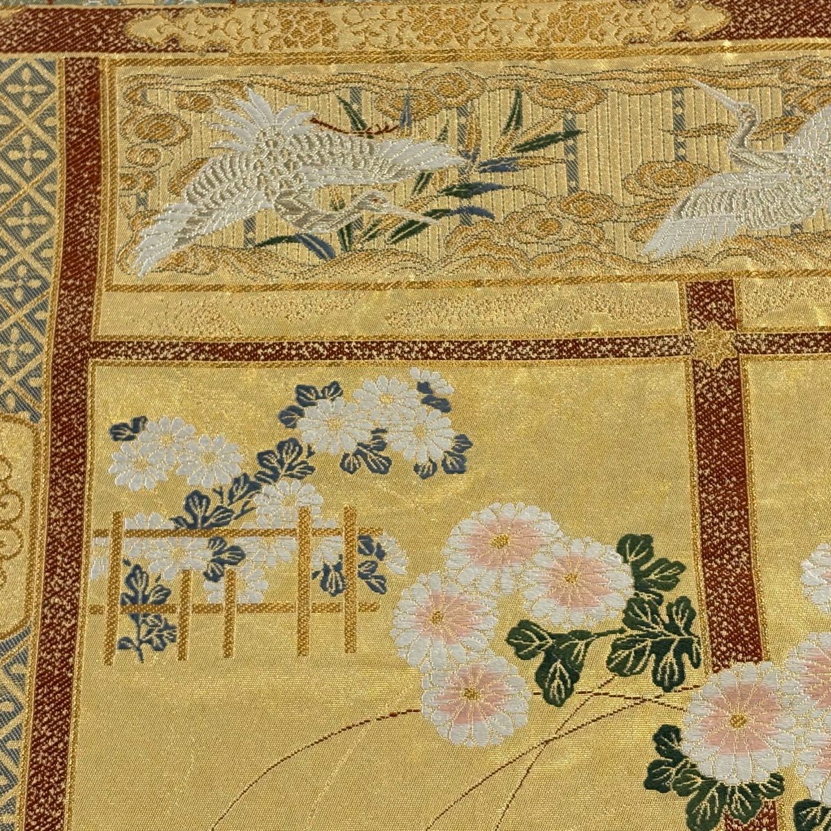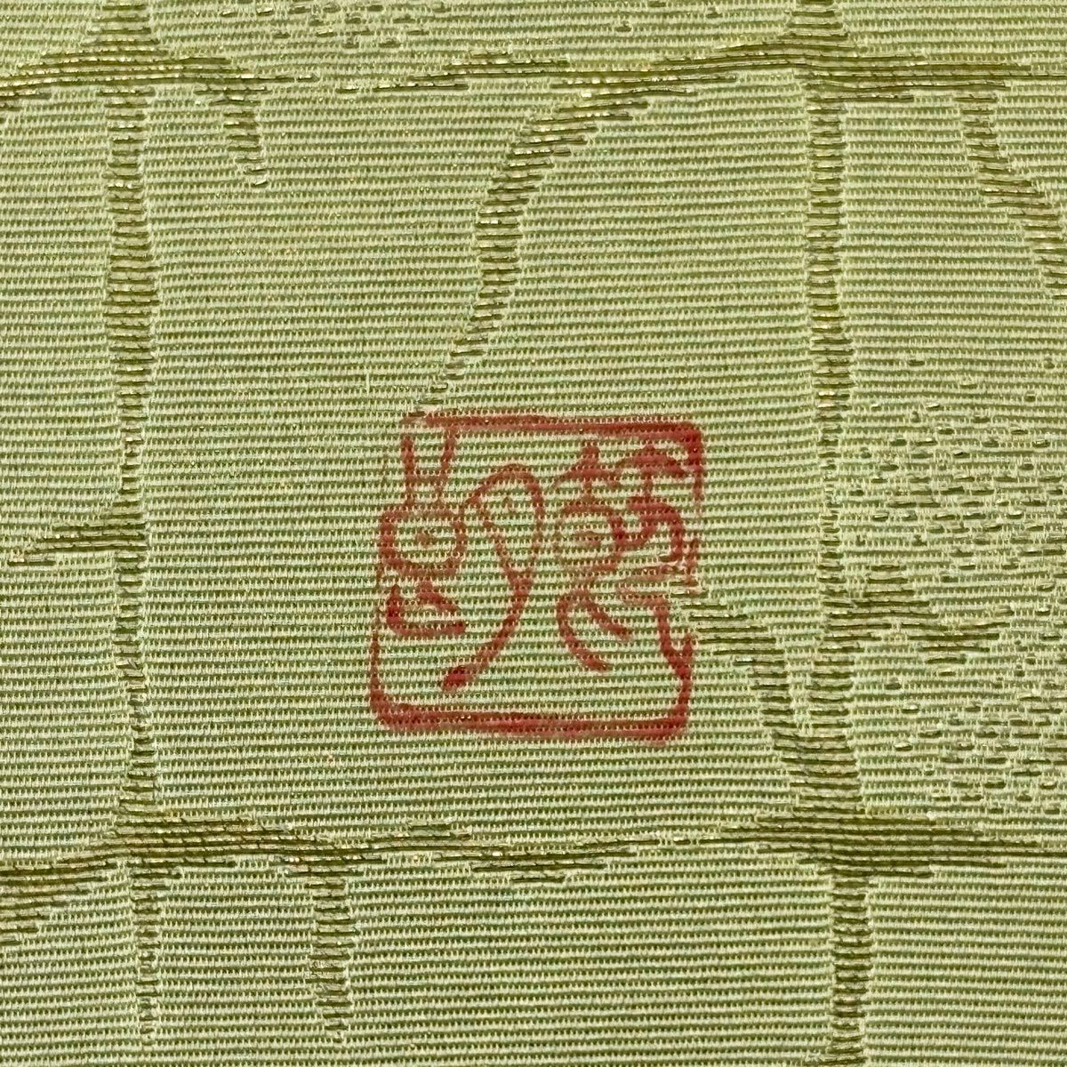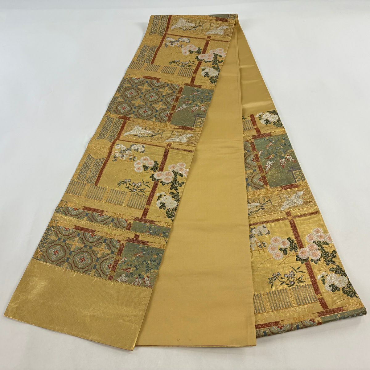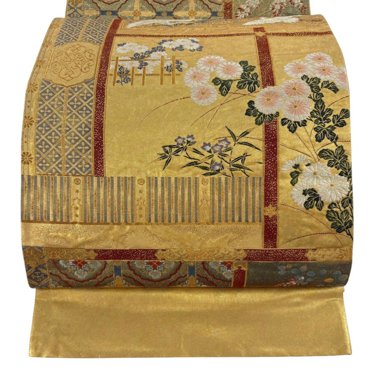 【美品】 袋帯 秀品 川島織物 落款あり 扇面 草花 金糸 からし色 六通 正絹
