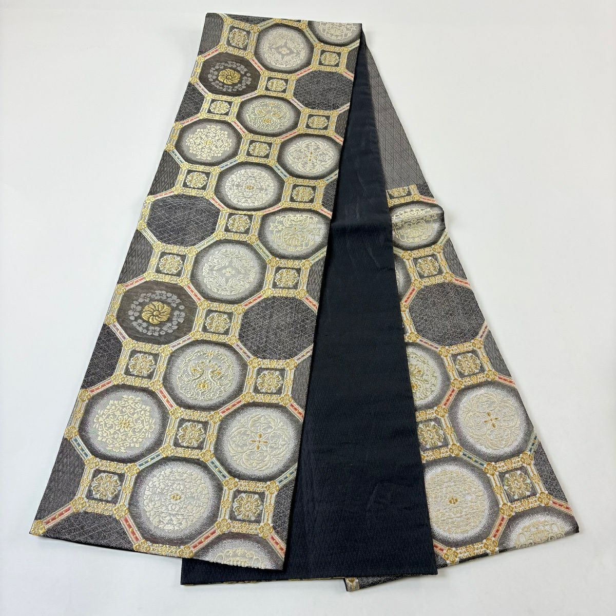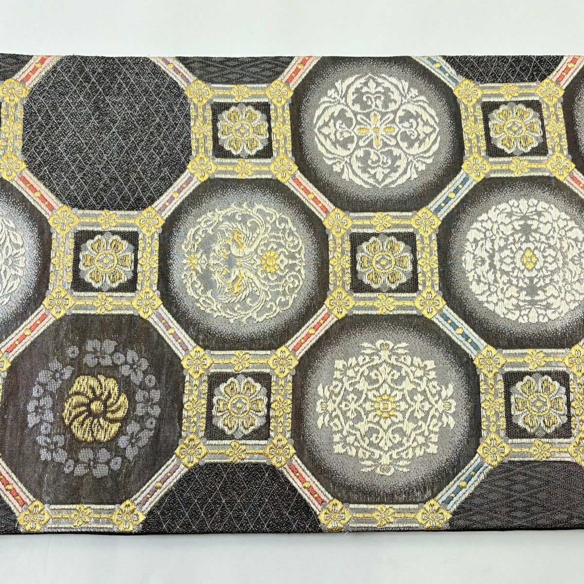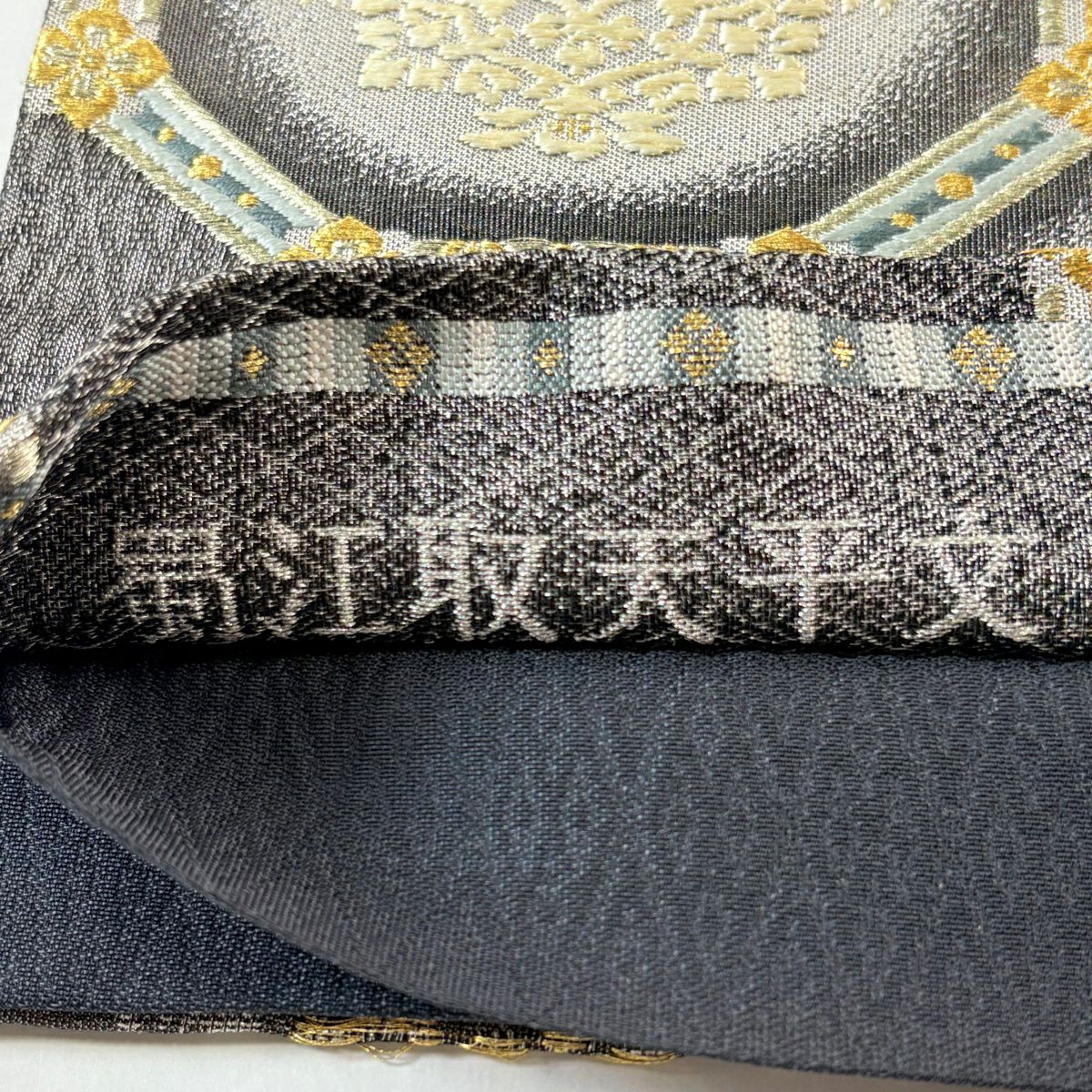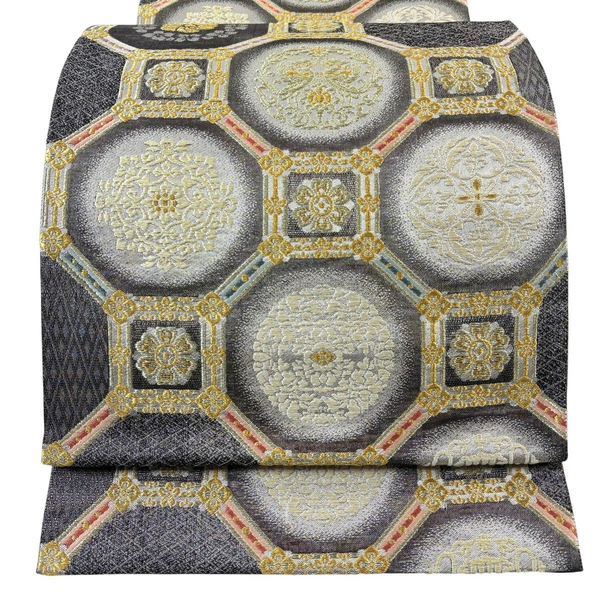 【美品】 袋帯 秀品 蜀江取天平文 向かい鳥 華文 金銀糸 箔 墨色 六通 正絹