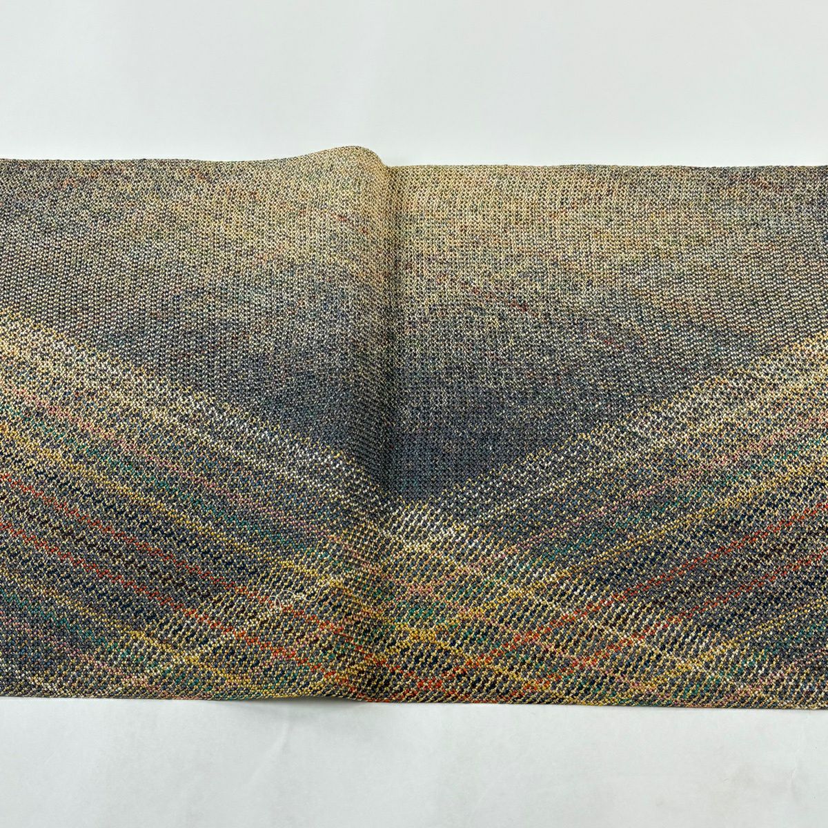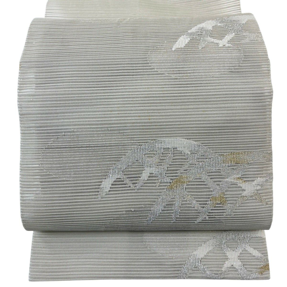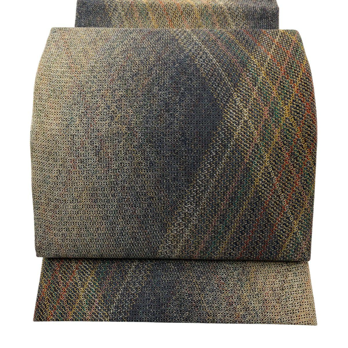 【美品】 名古屋帯 秀品 松葉仕立て 八寸名古屋帯 斜縞 幾何学 金銀糸 青灰色 正絹