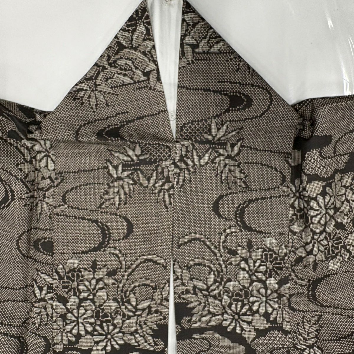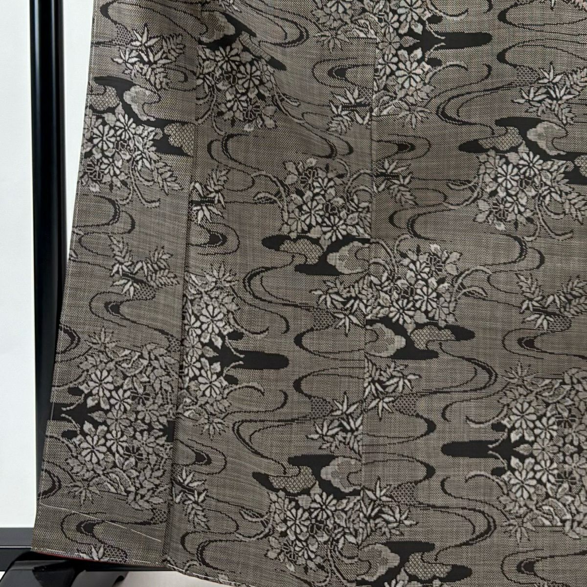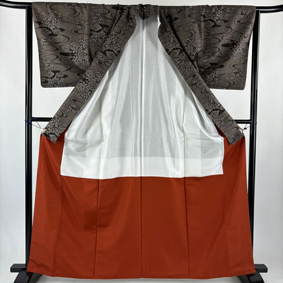 【美品】 紬 身丈164cm 裄丈62cm S 袷 草花 流水 焦茶色 正絹 秀品