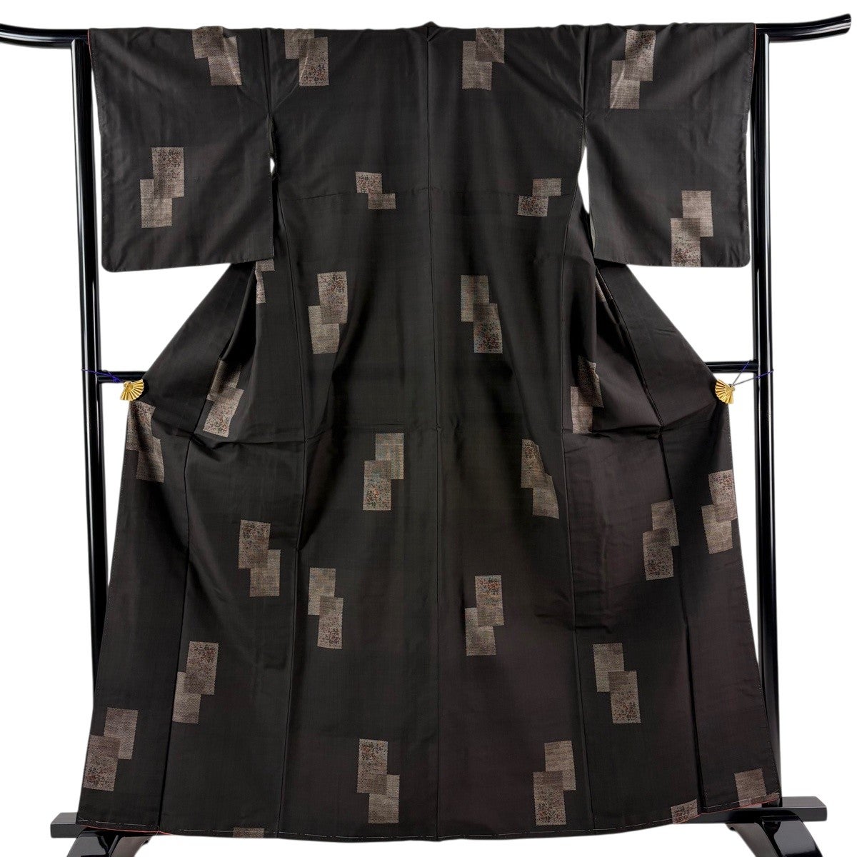 紬 身丈161cm 裄丈64cm M 袷 幾何学 短冊 焦茶色 正絹 秀品