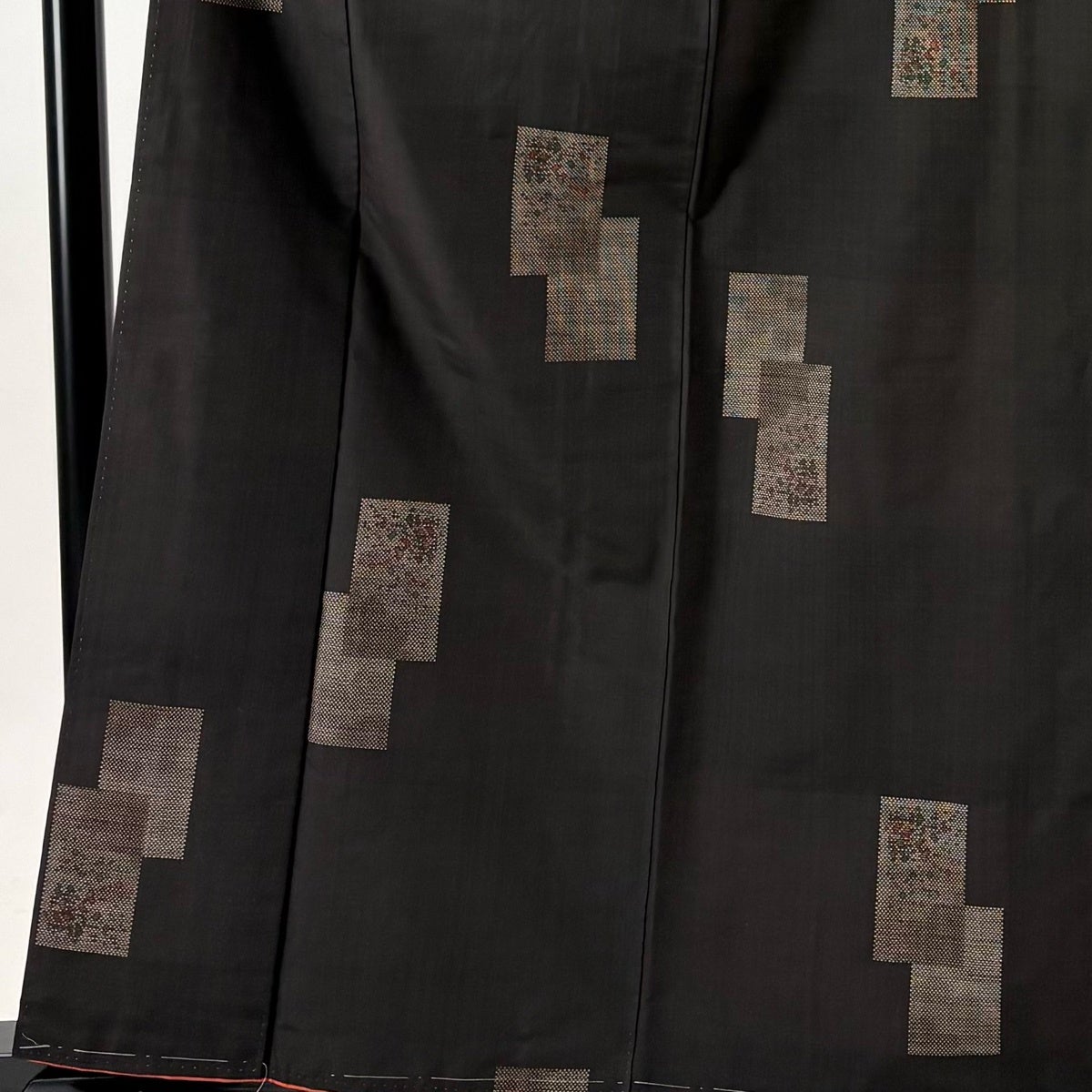 紬 身丈159.5cm 裄丈65.5cm M 単衣 幾何学模様 黒 正絹 秀品