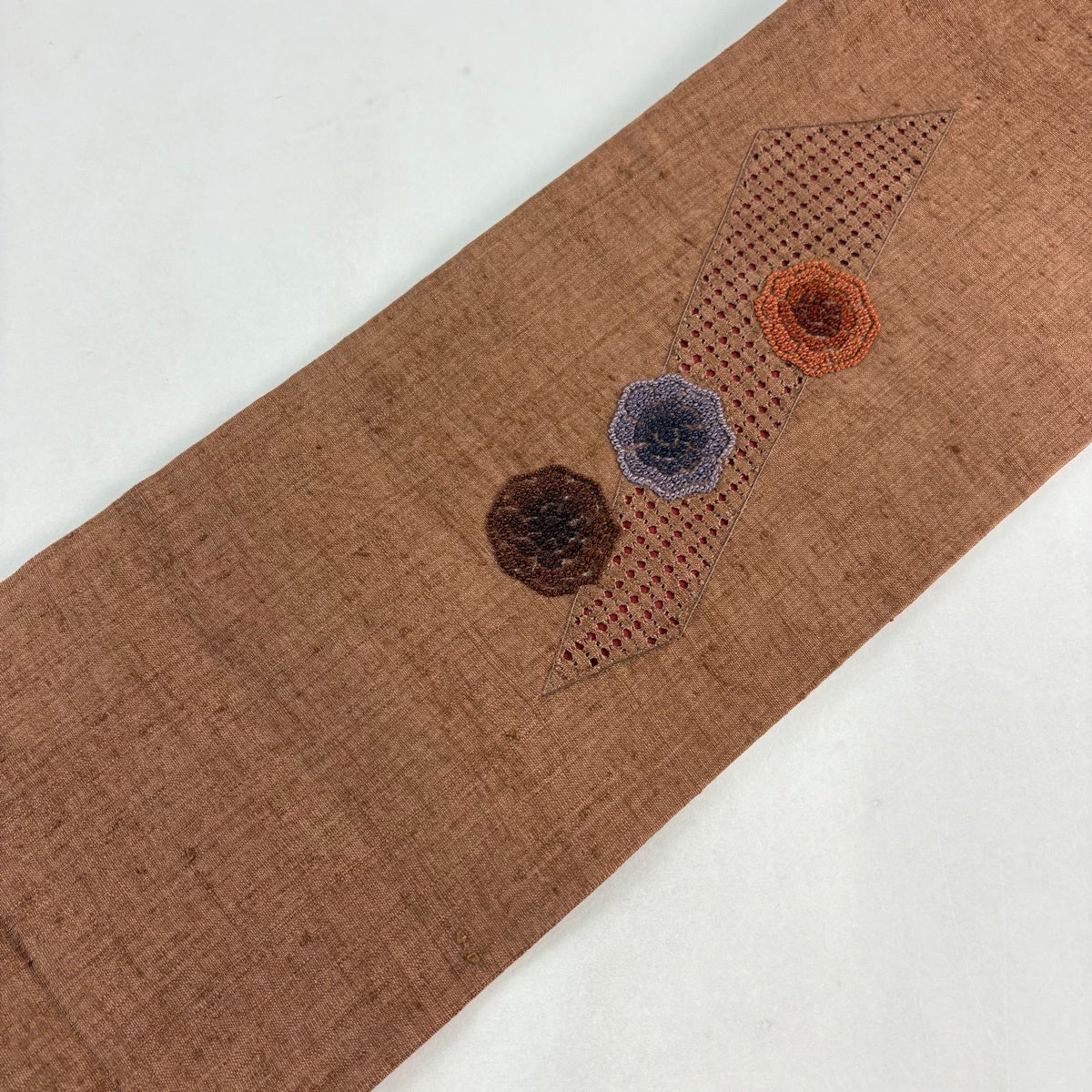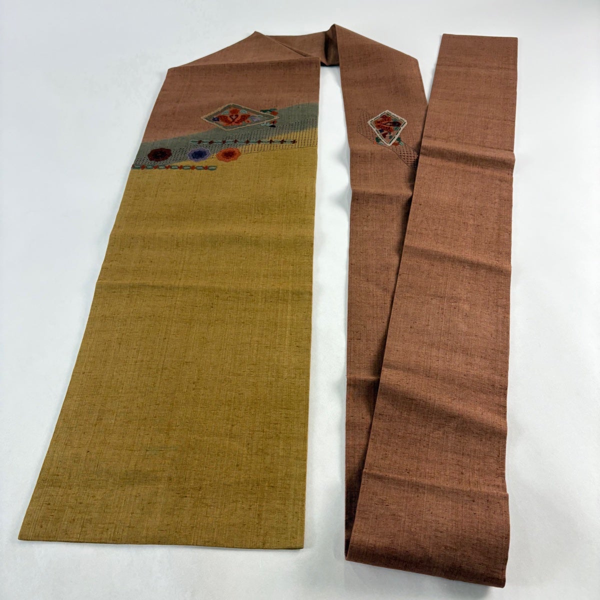 【美品】 名古屋帯 秀品 紬地 草花 蝶 相良刺繍 汕頭刺繍 黄土色 正絹