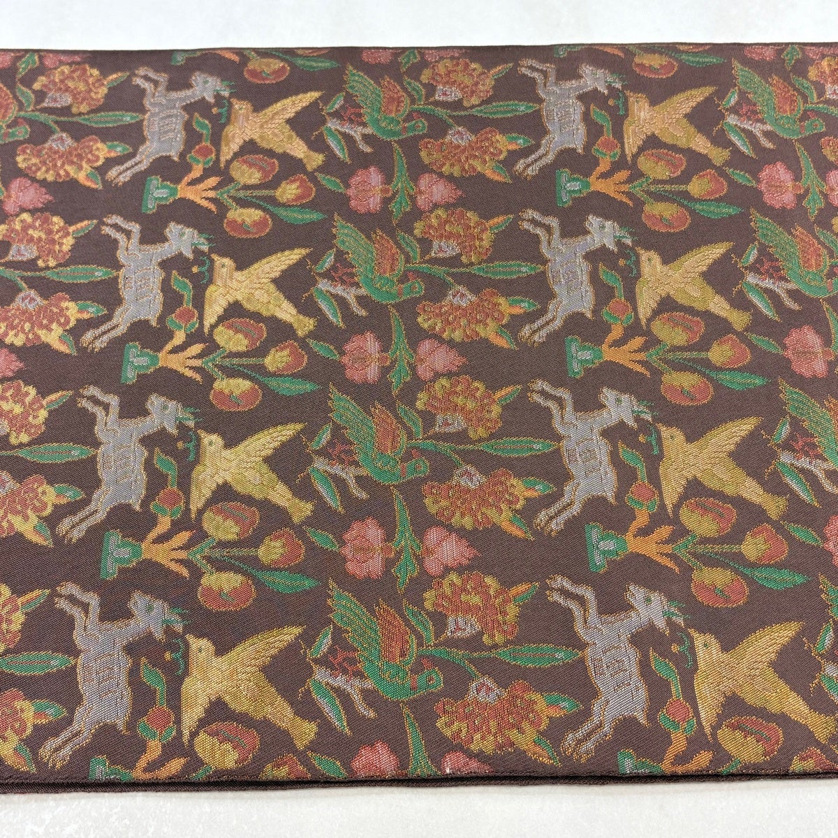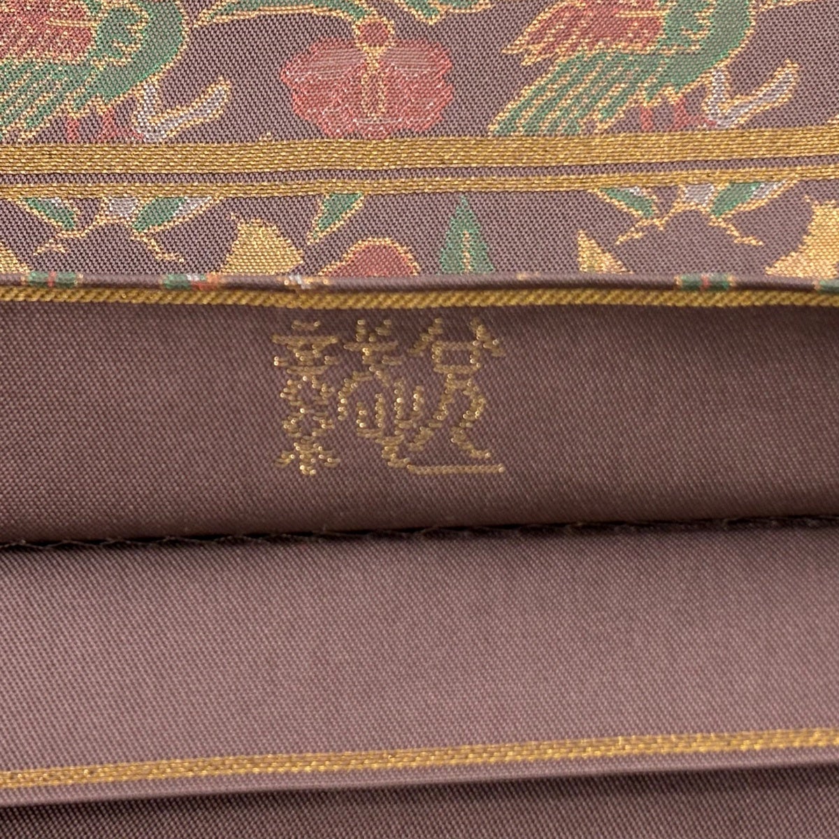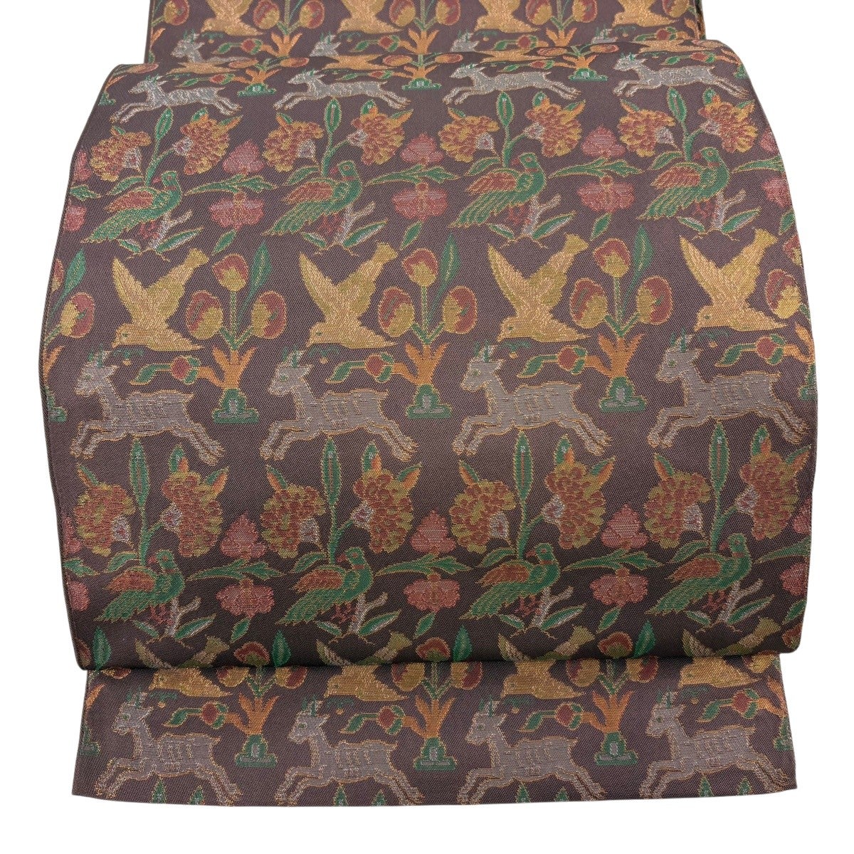 【美品】 袋帯 秀品 織悦 落款あり 動物 花鳥 箔 小豆色 全通 正絹