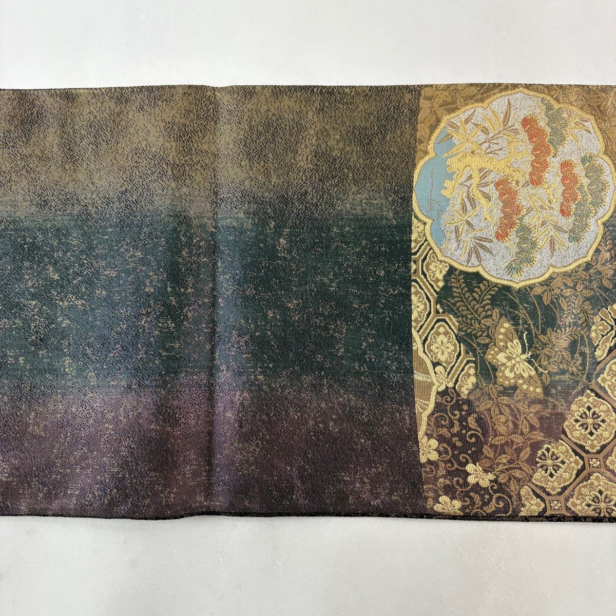 【美品】 袋帯 秀品 本金箔 飾棚花文様 唐織 金銀糸 灰緑 六通 正絹