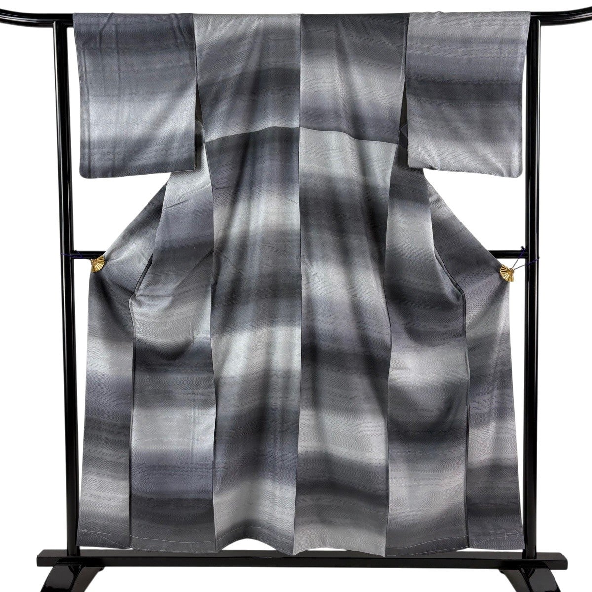 紬 身丈155.5cm 裄丈63cm S 袷 雲文 笹蔓 黒灰 正絹 秀品