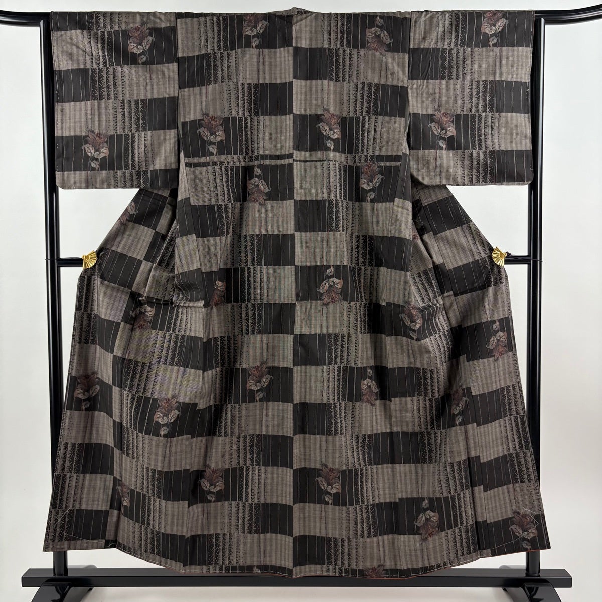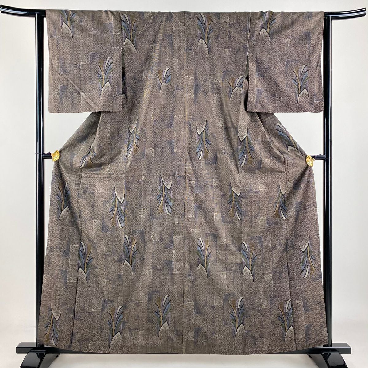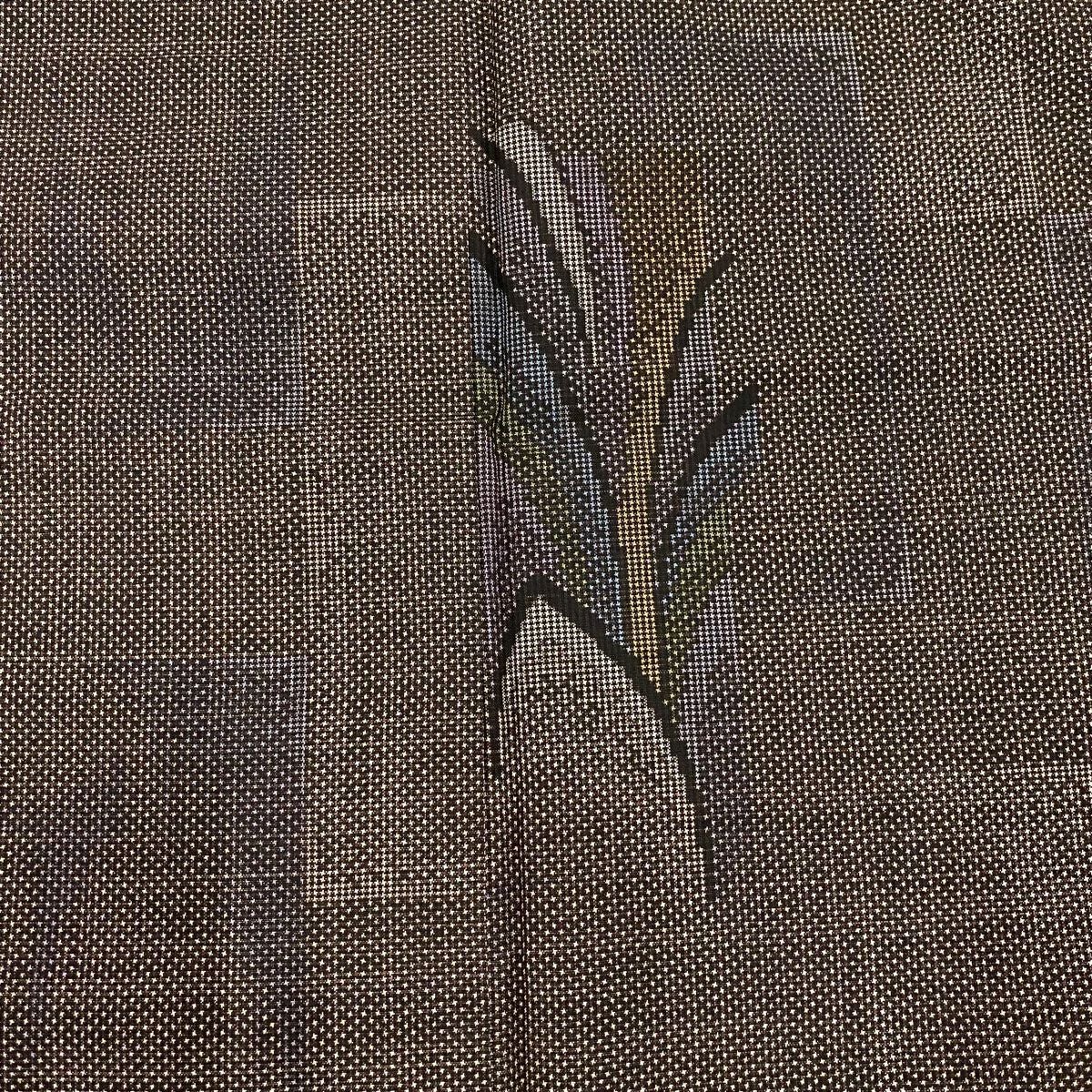 【美品】 紬 身丈156cm 裄丈64.5cm M 袷 草花 縞 焦茶色 正絹 秀品