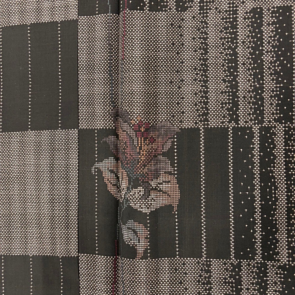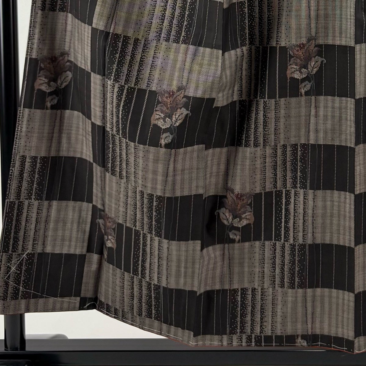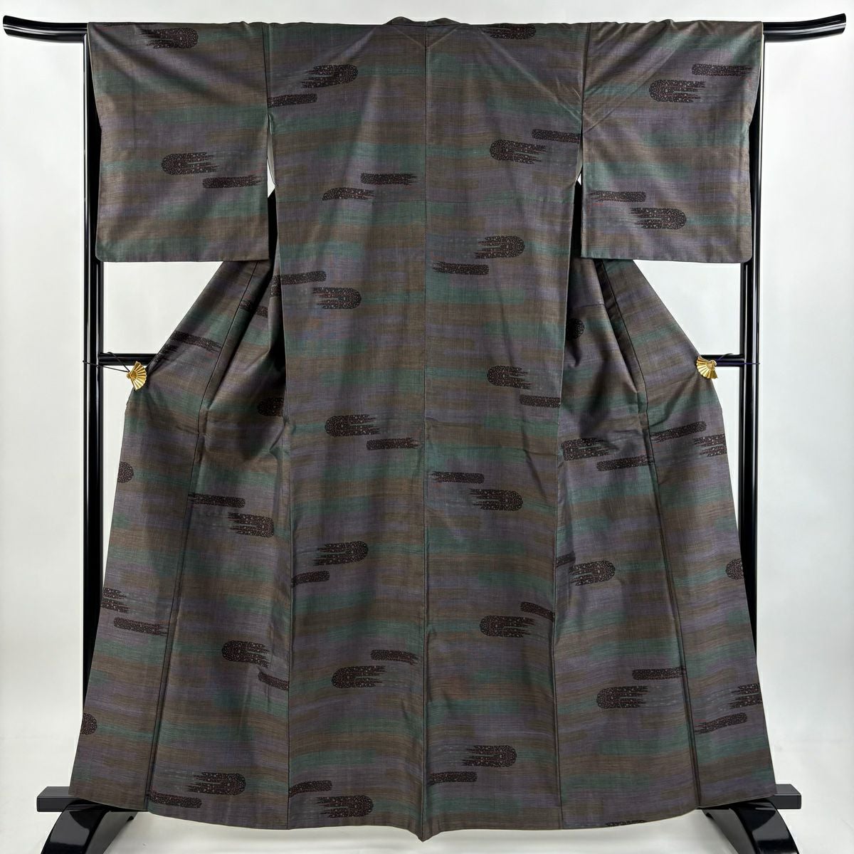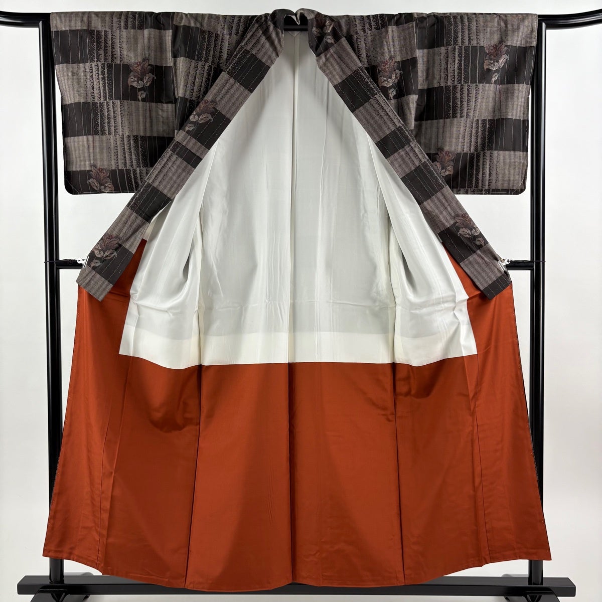 【美品】 紬 身丈156cm 裄丈64.5cm M 袷 草花 縞 焦茶色 正絹 秀品