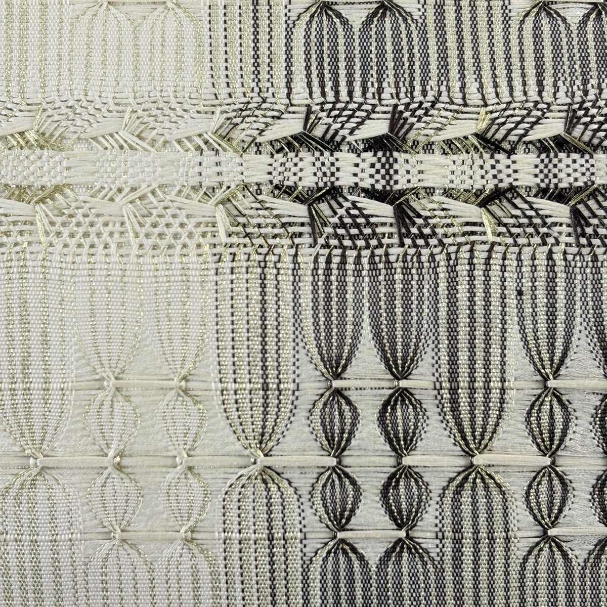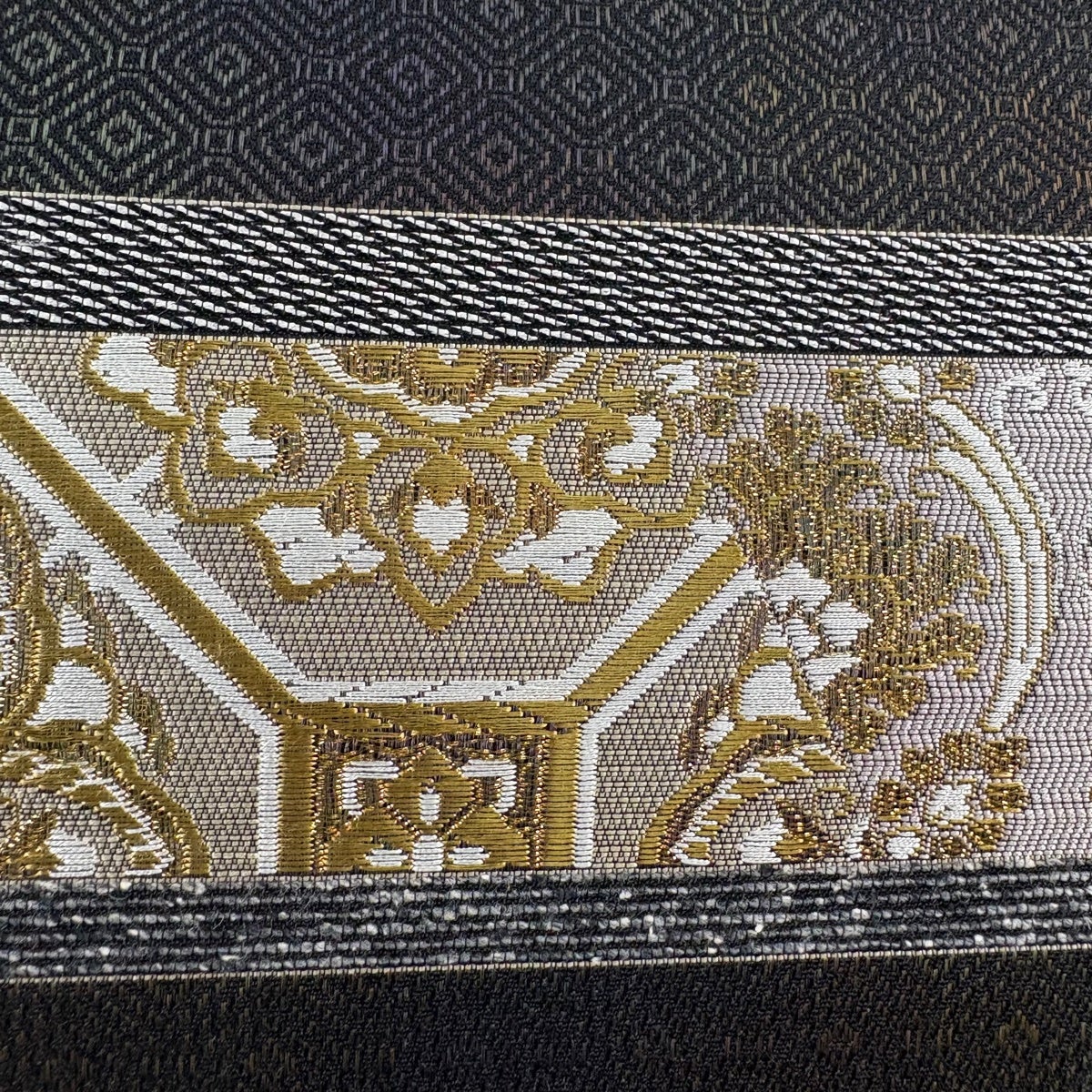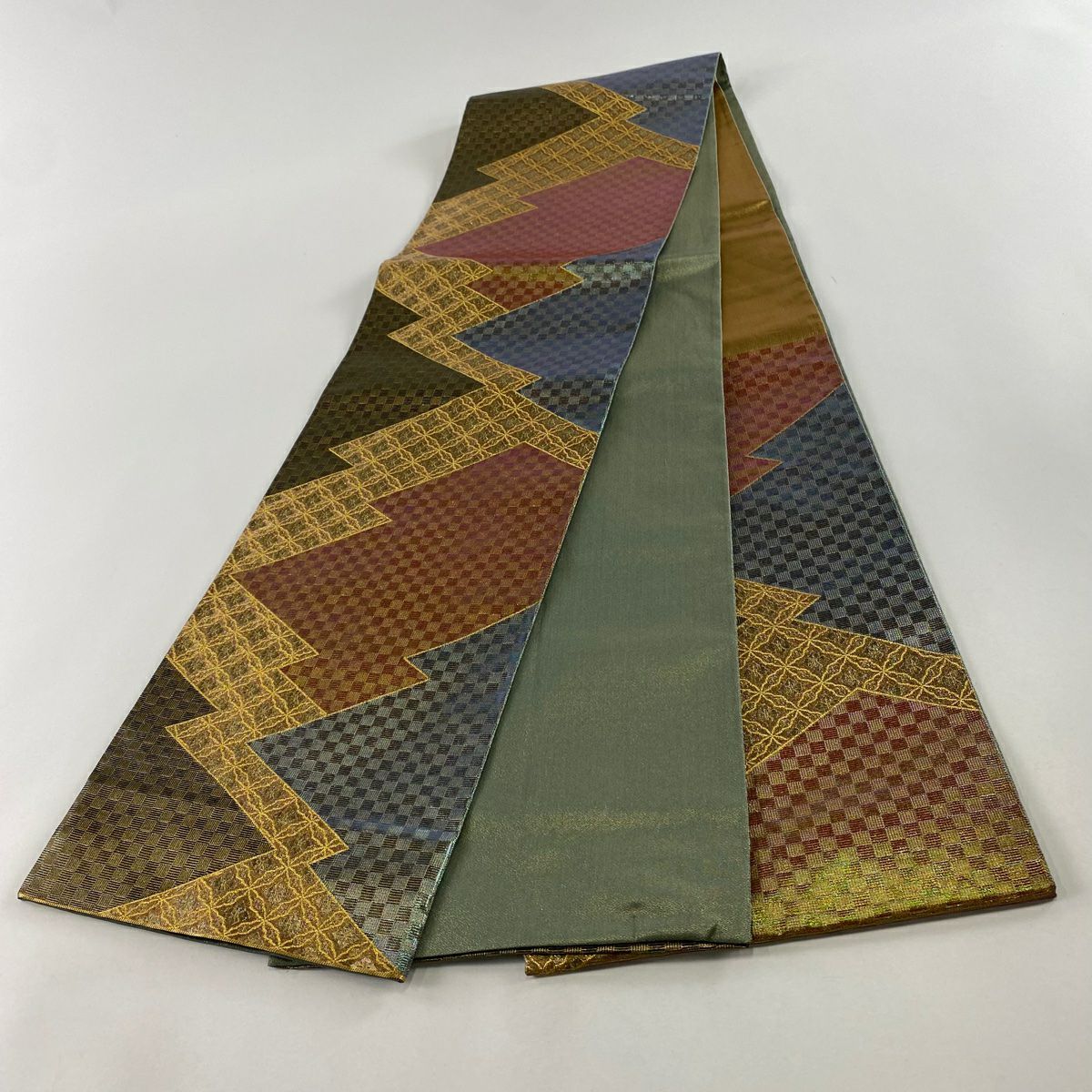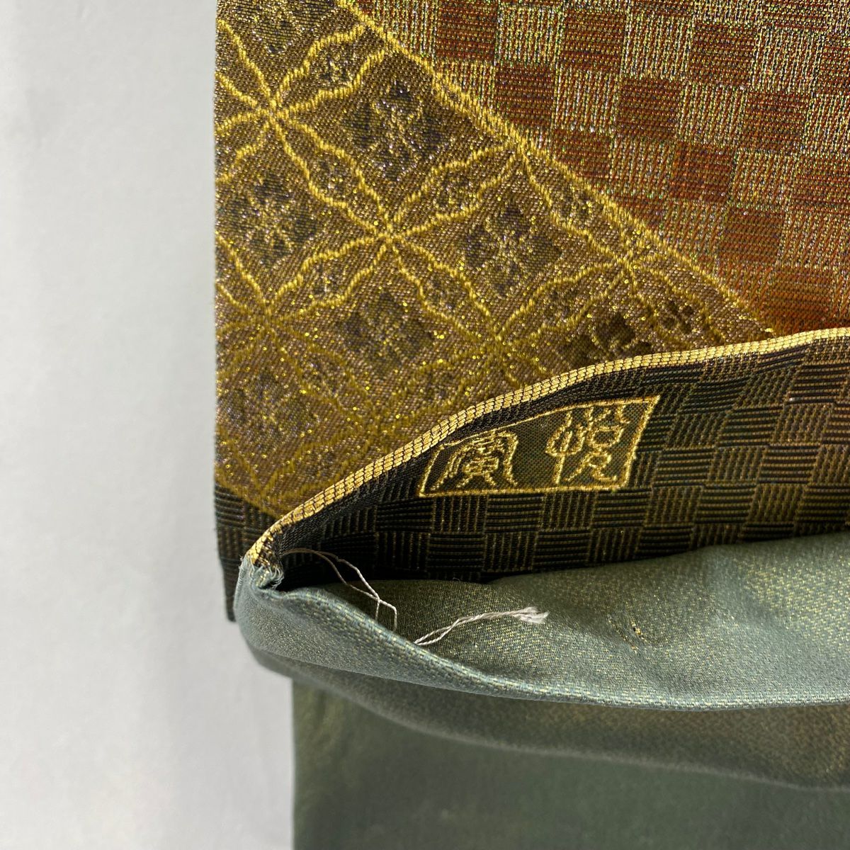 【美品】 袋帯 秀品 大久保玄才 落款あり 幾何学模様 格子 箔 金色 全通 正絹