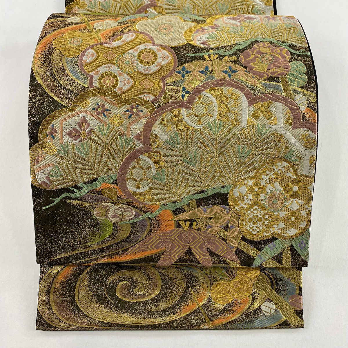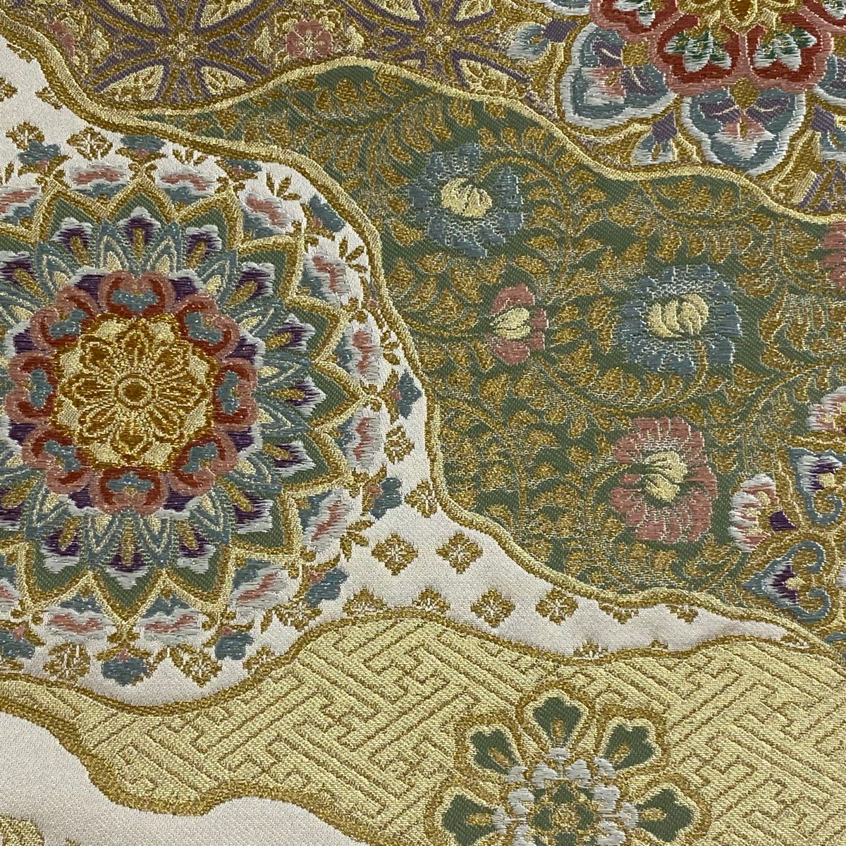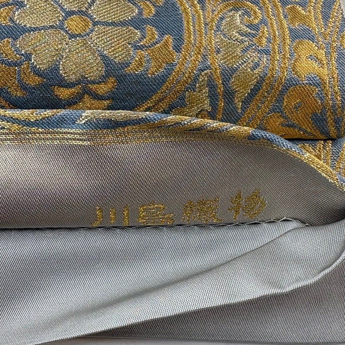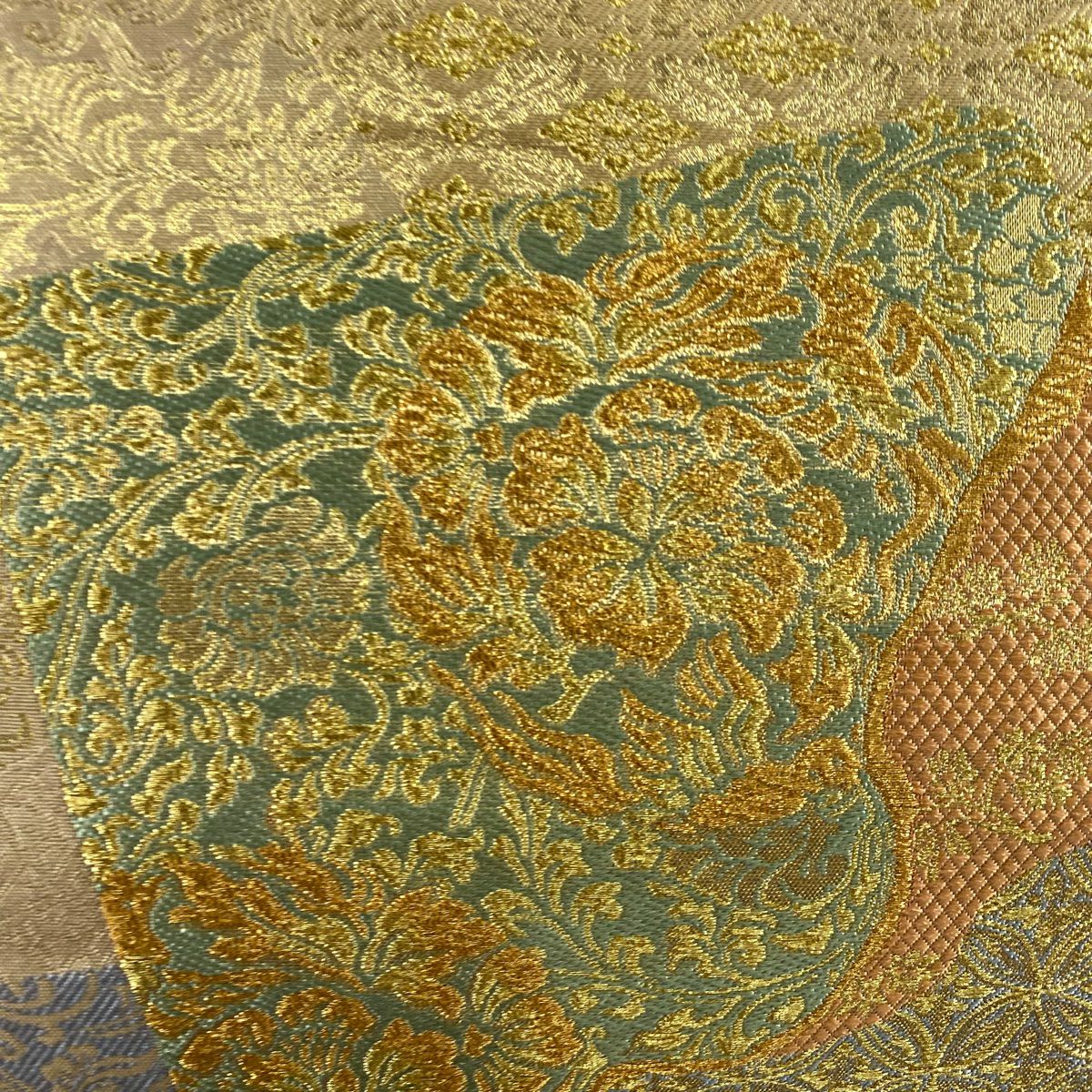 【美品】 袋帯 秀品 川島織物 落款あり 花唐草 波頭 金銀糸 箔 金色 六通 正絹