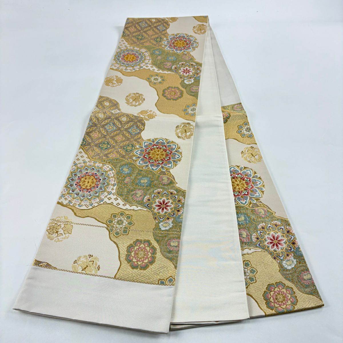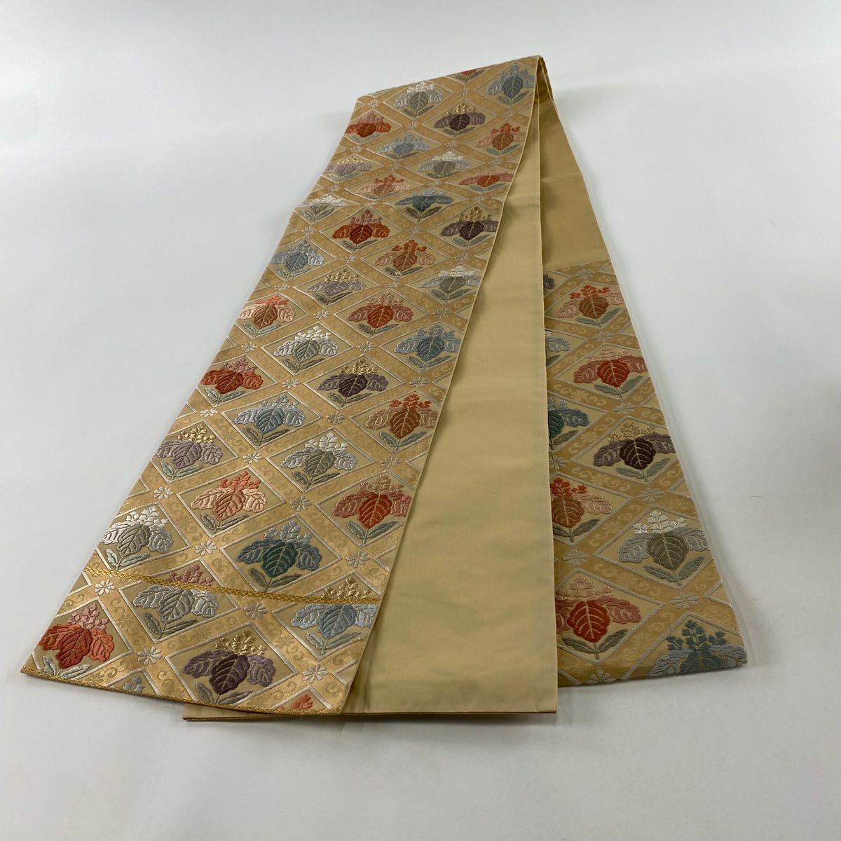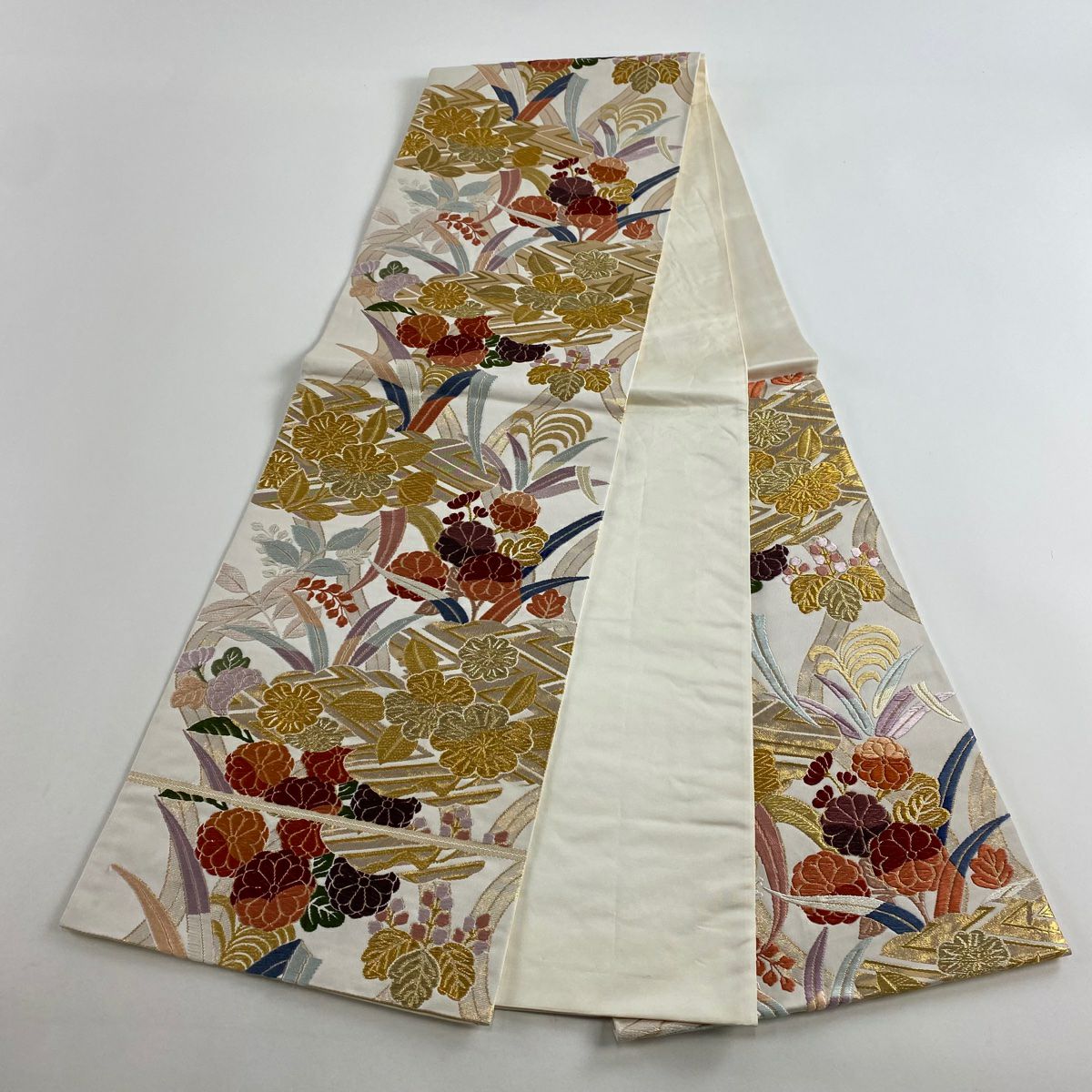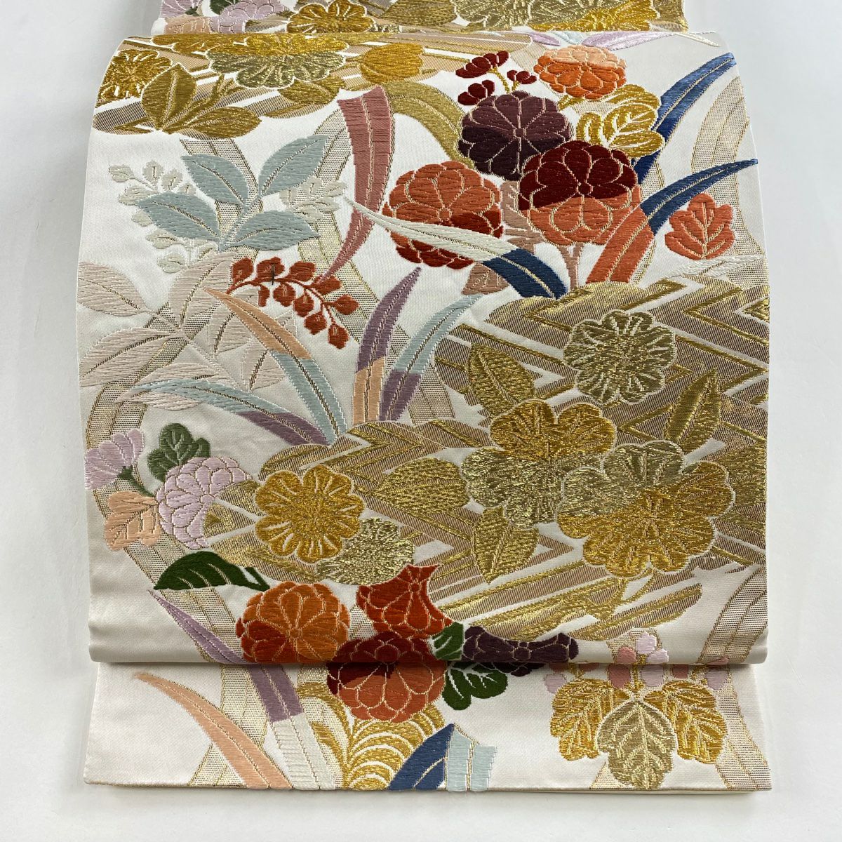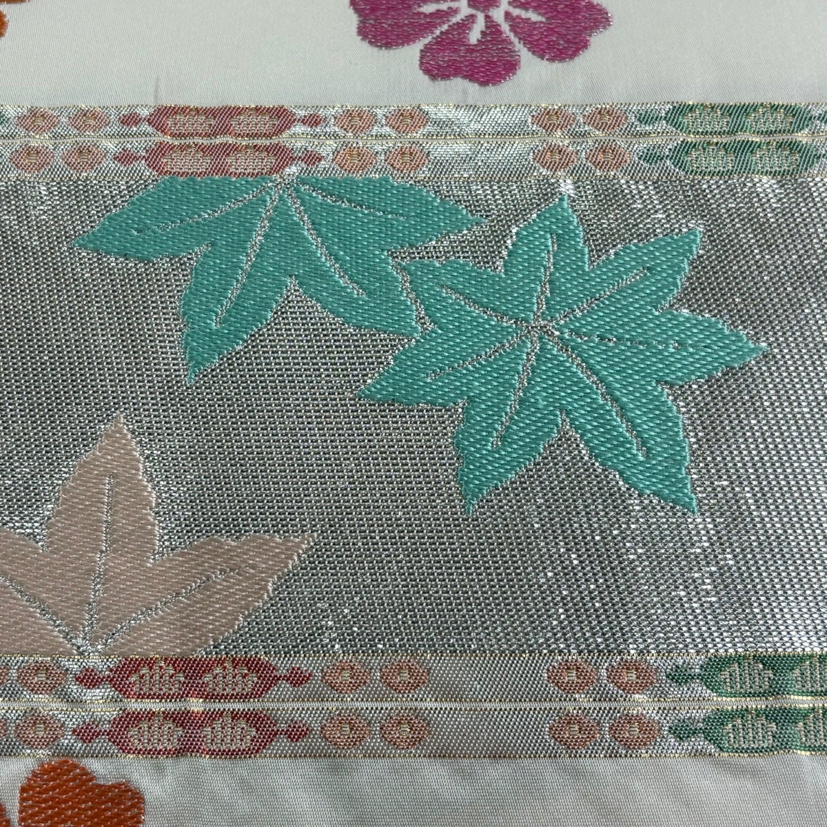 袋帯 秀品 春秋段文 関西仕立て 桜楓 横段 金銀糸 箔 クリーム お太鼓柄 正絹