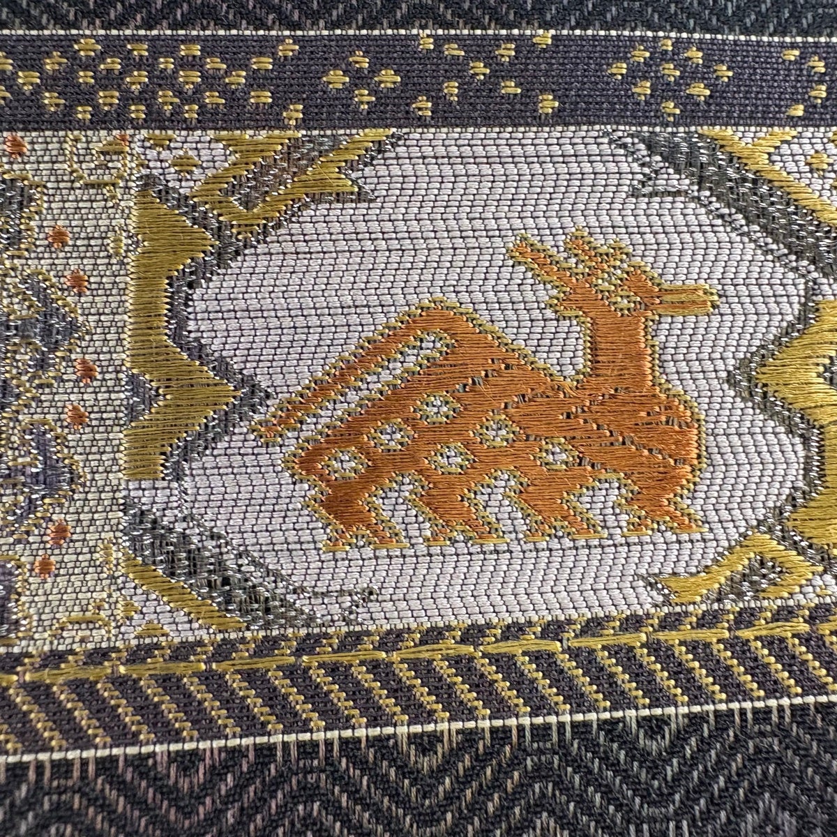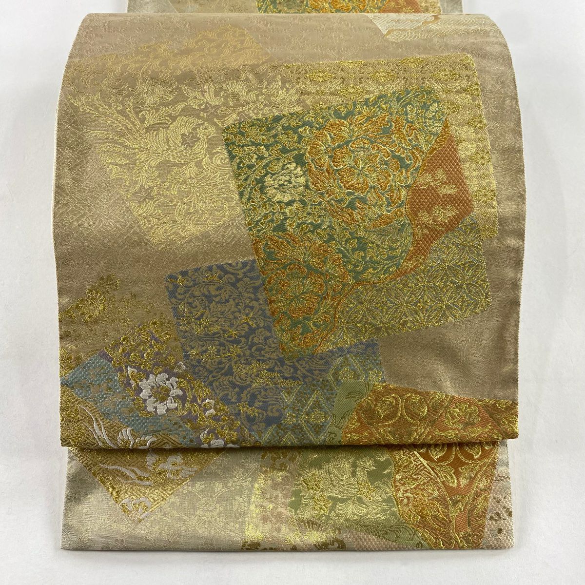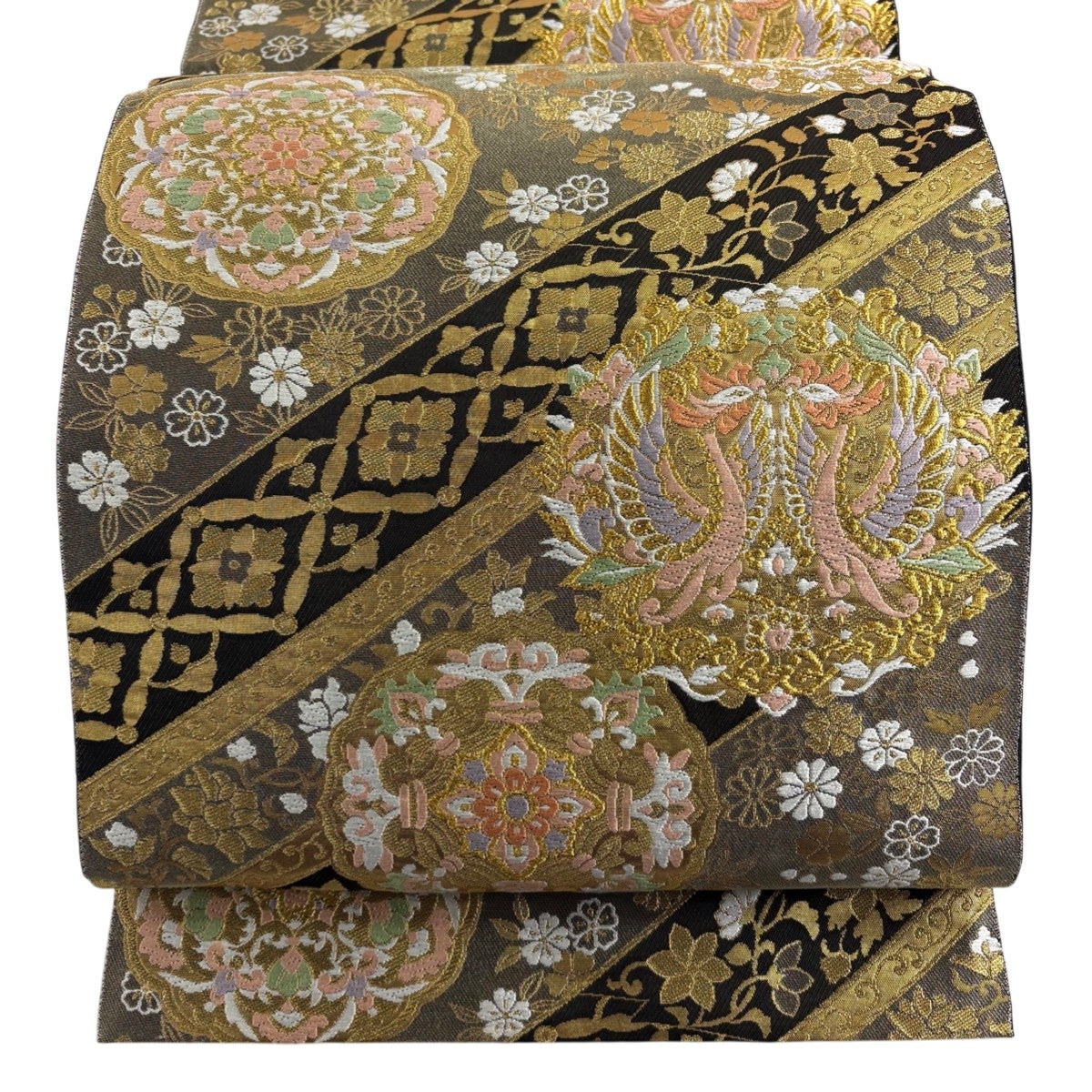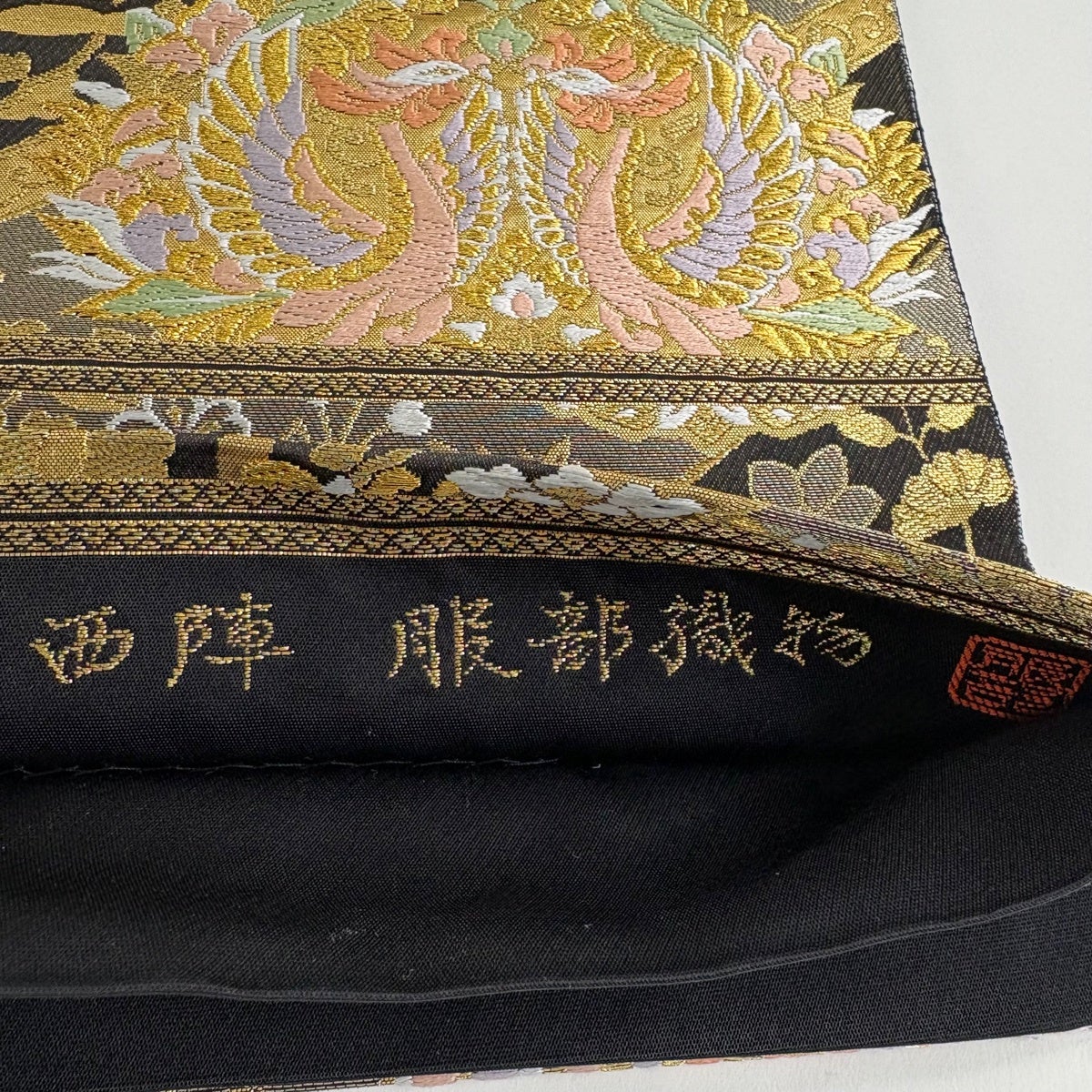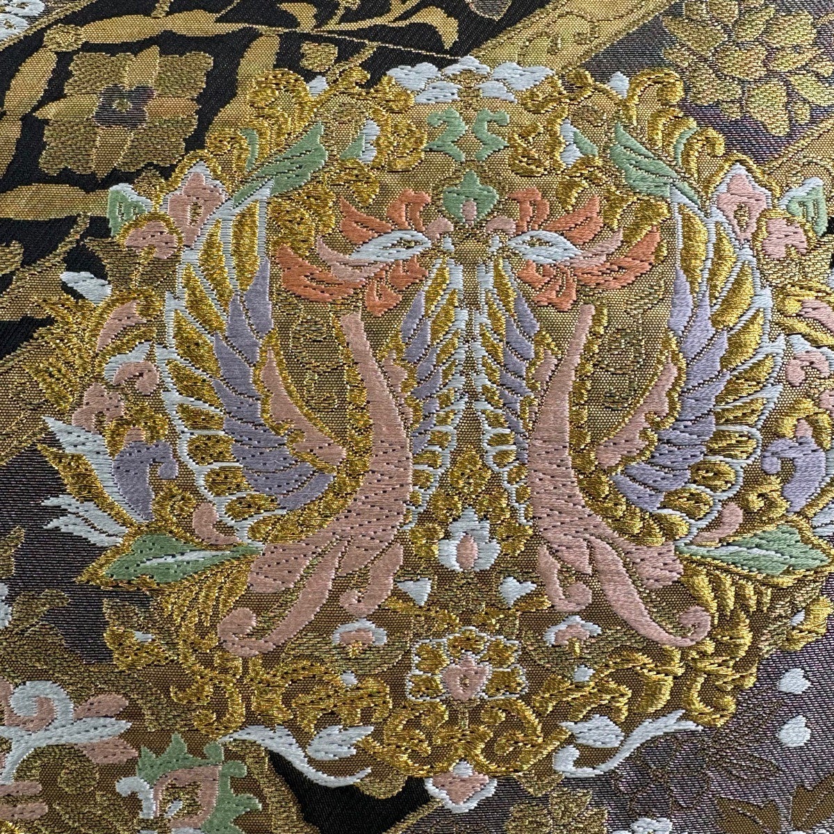 【美品】 袋帯 秀品 服部織物 落款あり 華文 向かい鳥 金糸 箔 金色 六通 正絹
