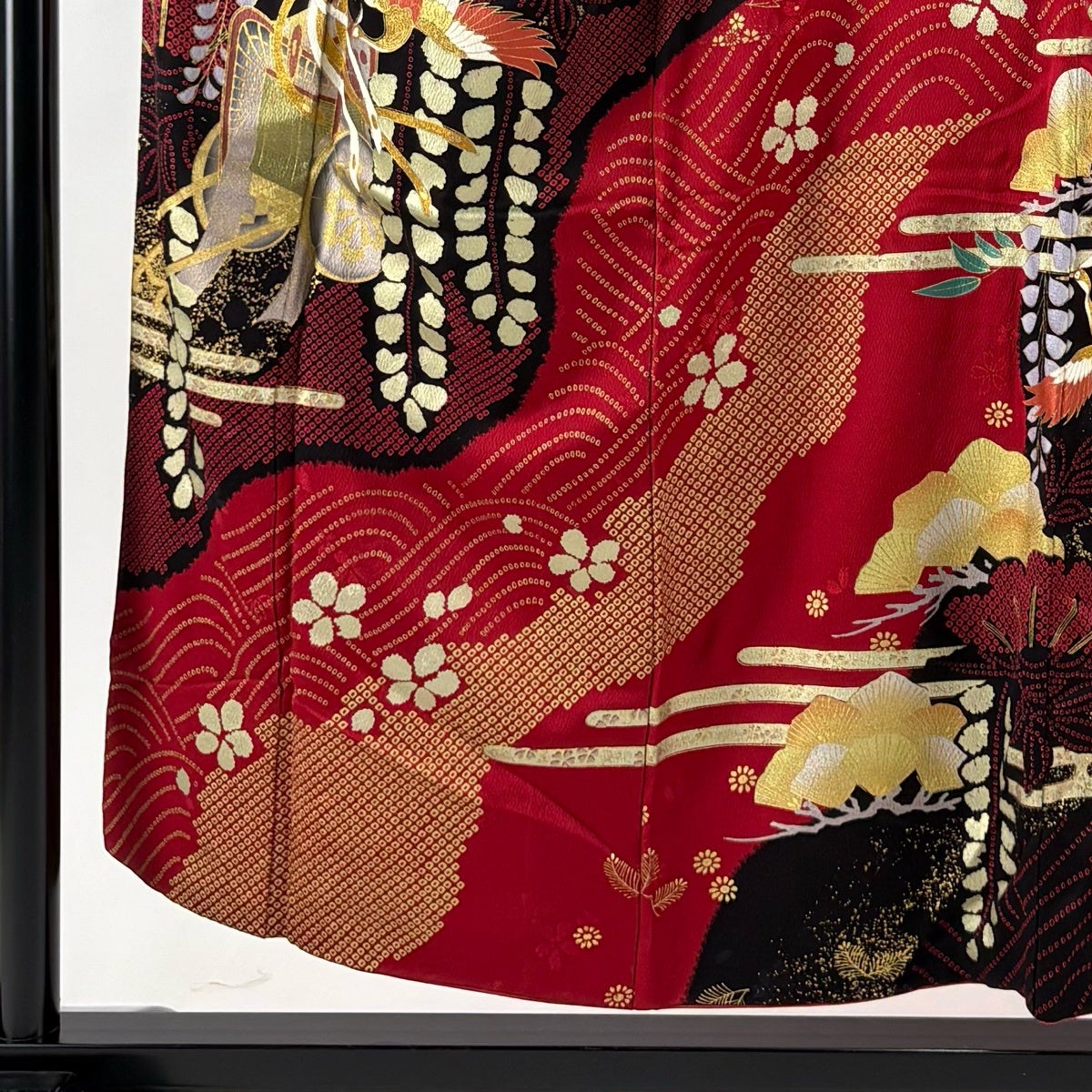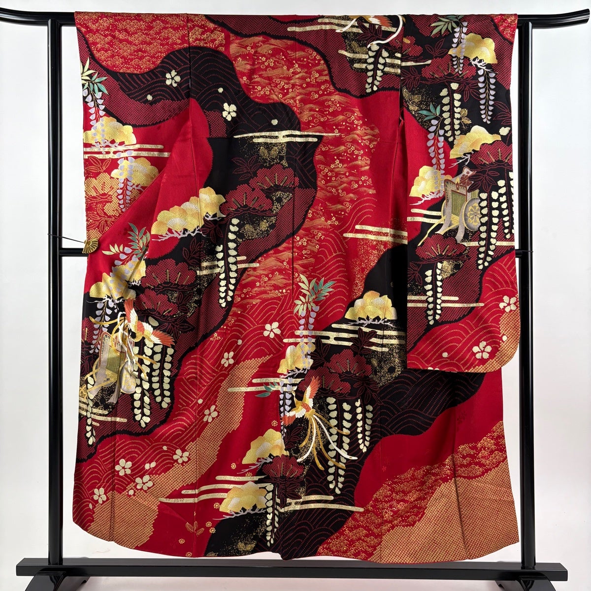 振袖 身丈154cm 裄丈61.5cm S 袷 御所車 尾長鳥 金彩 赤 正絹 秀品