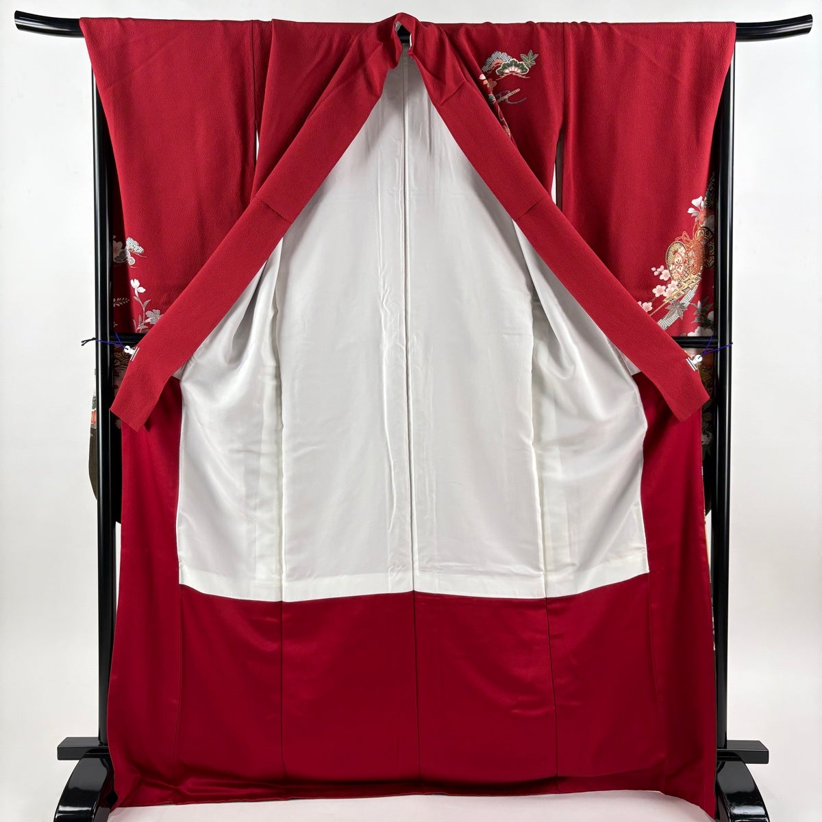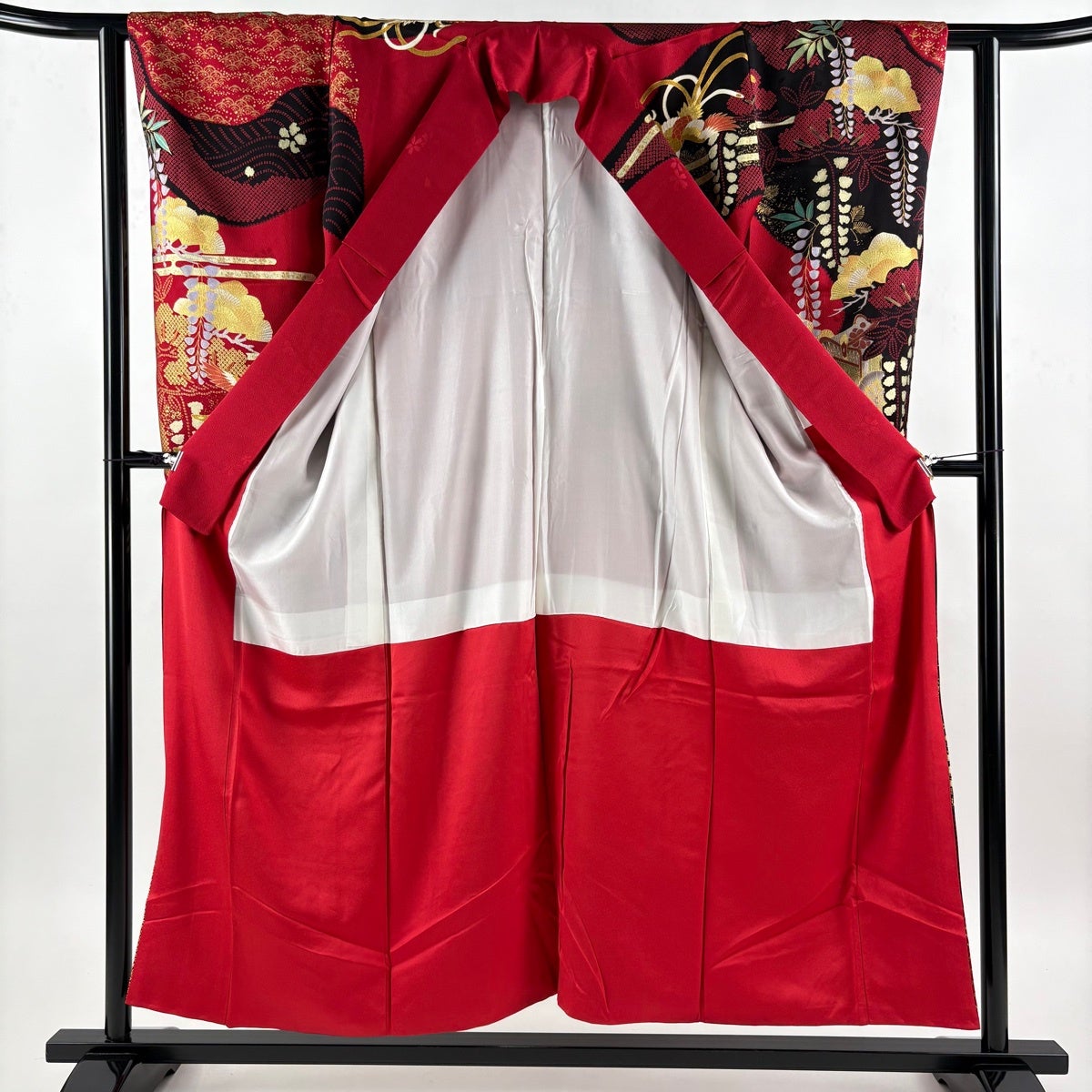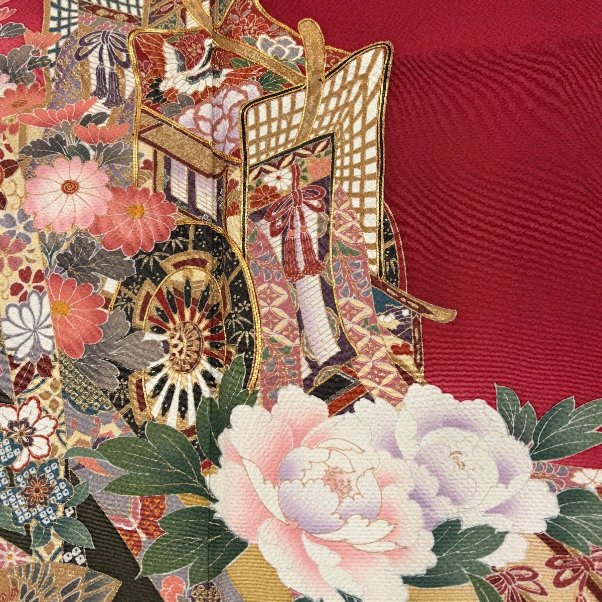 振袖 身丈175cm 裄丈69.5cm L 袷 御所車 牡丹 金糸 金彩 赤 正絹 秀品