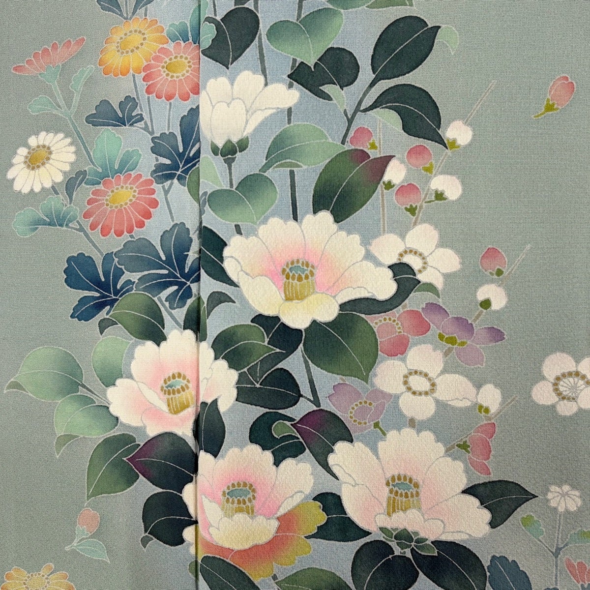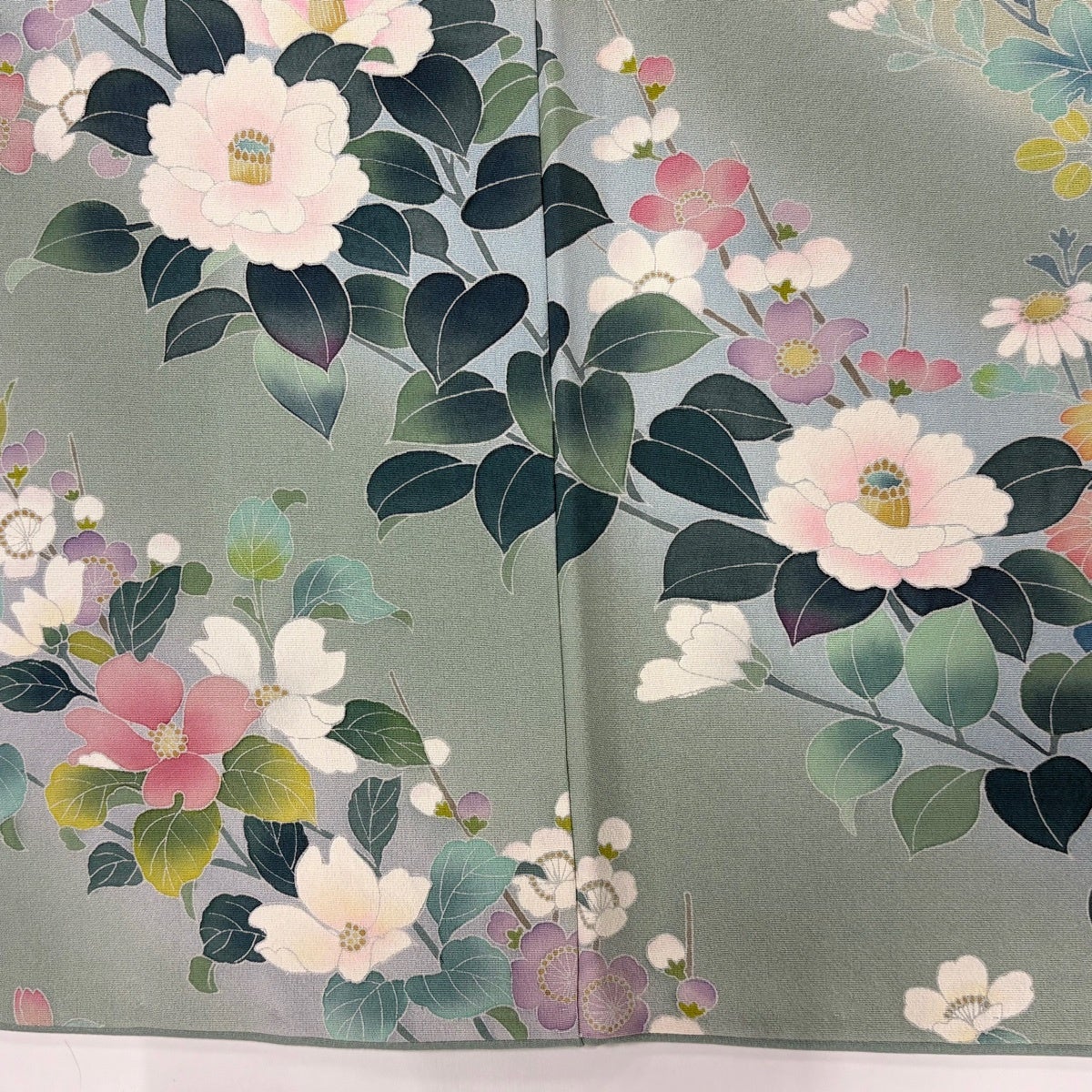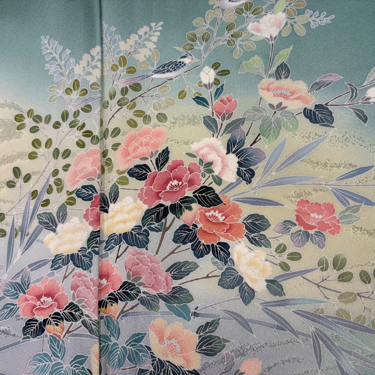 訪問着 身丈155.5cm 裄丈64.5cm M 袷 椿 草花 ぼかし 薄緑 正絹 秀品