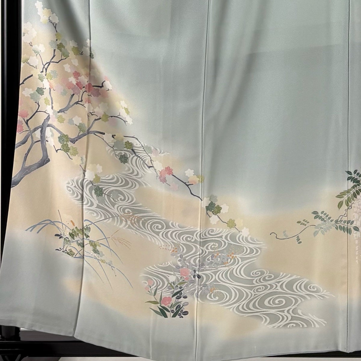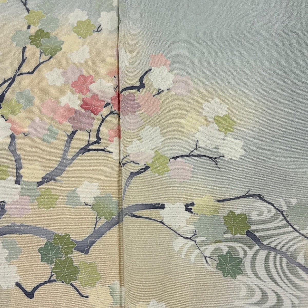 色留袖 身丈159.5cm 裄丈66.5cm M 袷 楓 流水 ぼかし 薄緑 正絹 秀品