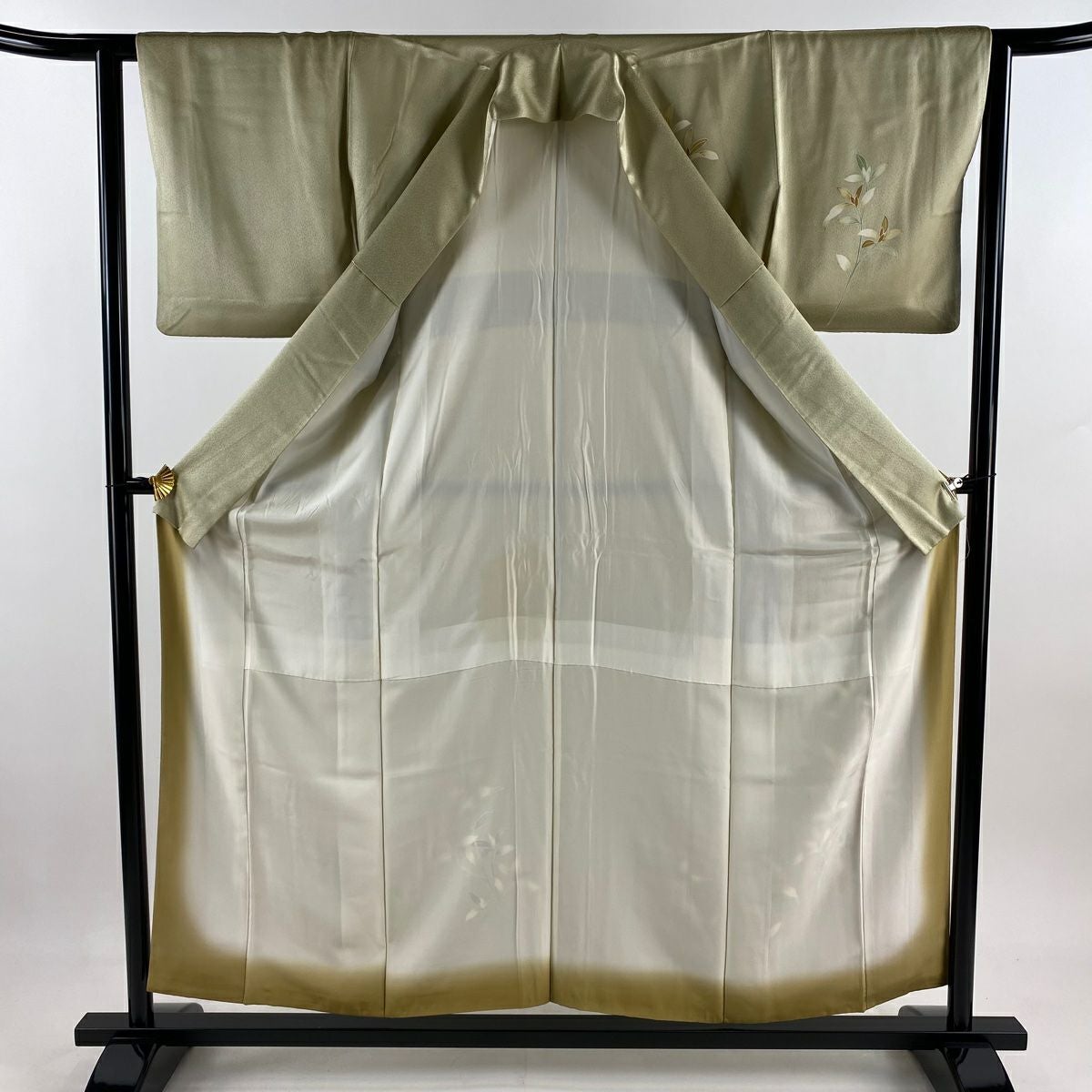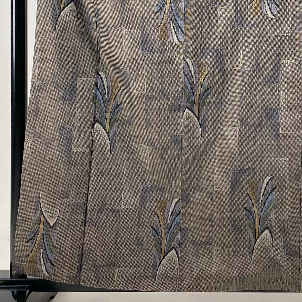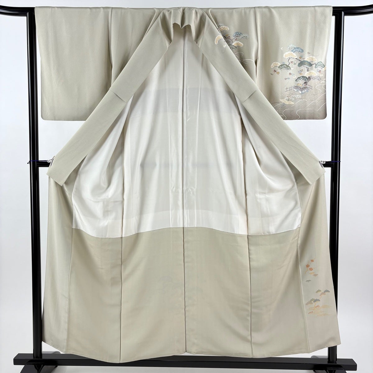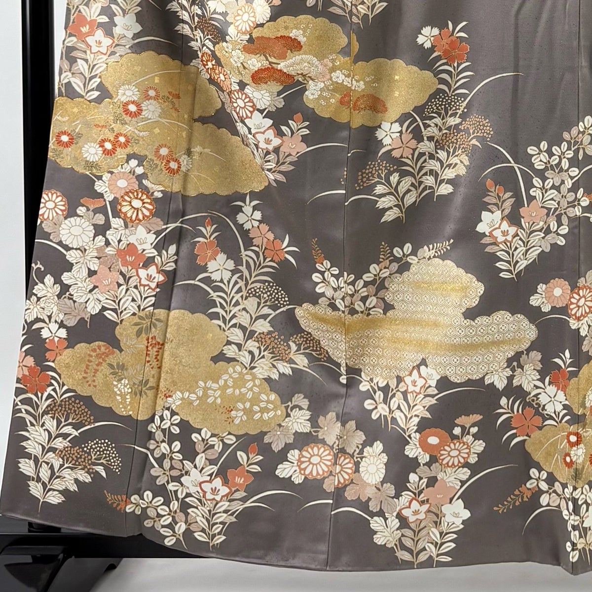 付下げ 身丈160cm 裄丈64cm M 袷 梅 桧扇 金糸 刺繍 灰色 正絹 秀品