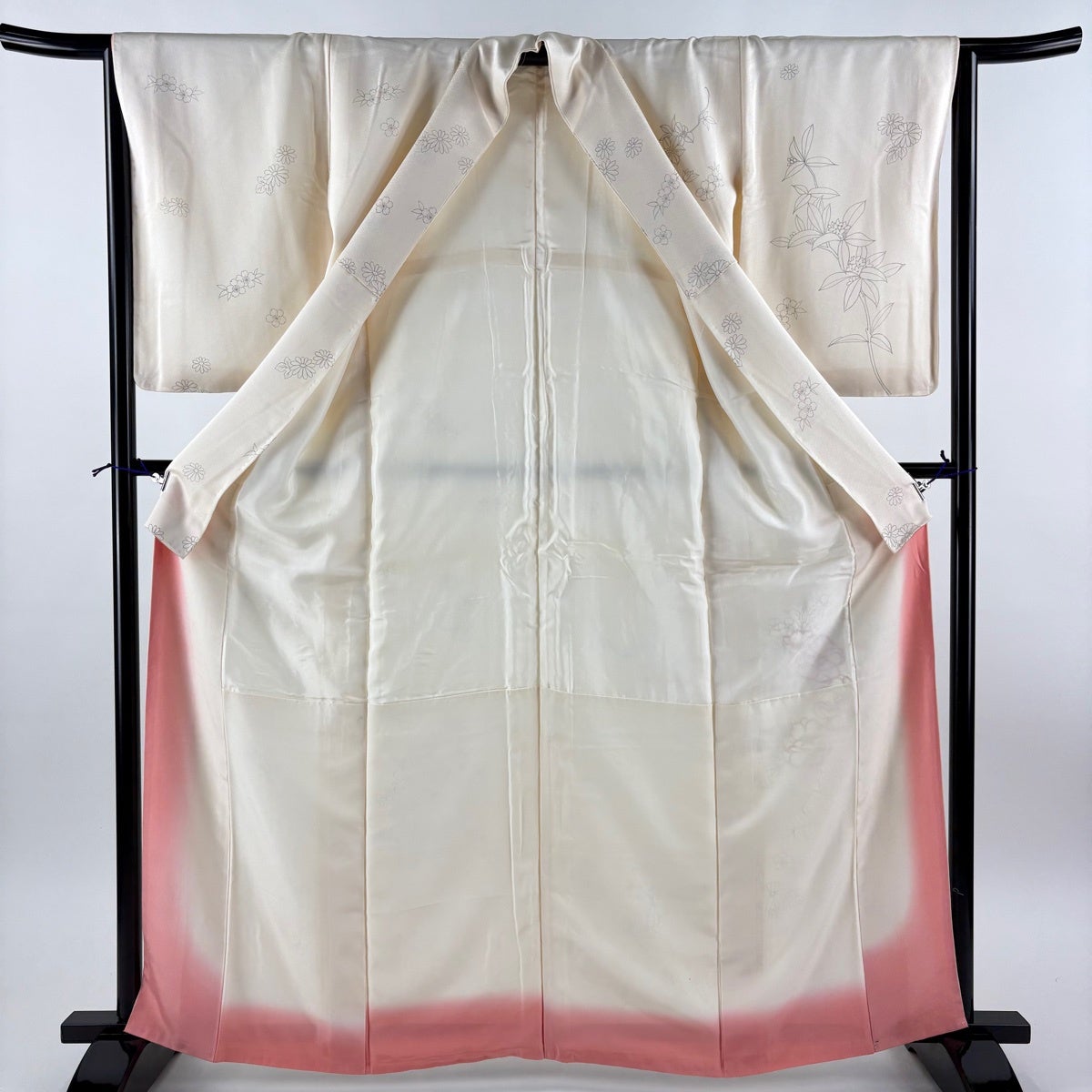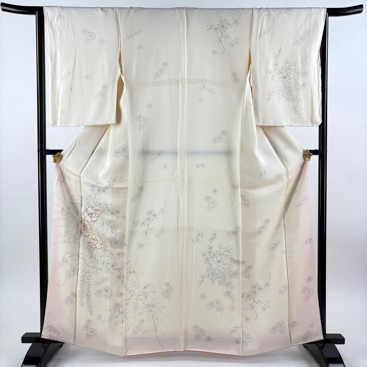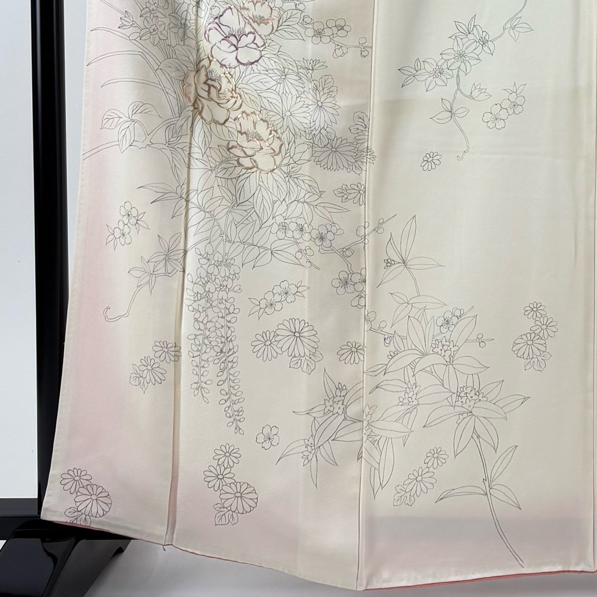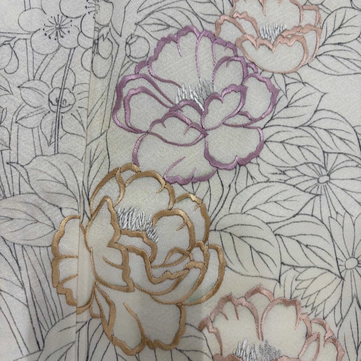 付下げ 身丈165cm 裄丈65cm M 袷 草花 牡丹と梅 刺繍 クリーム 正絹 秀品