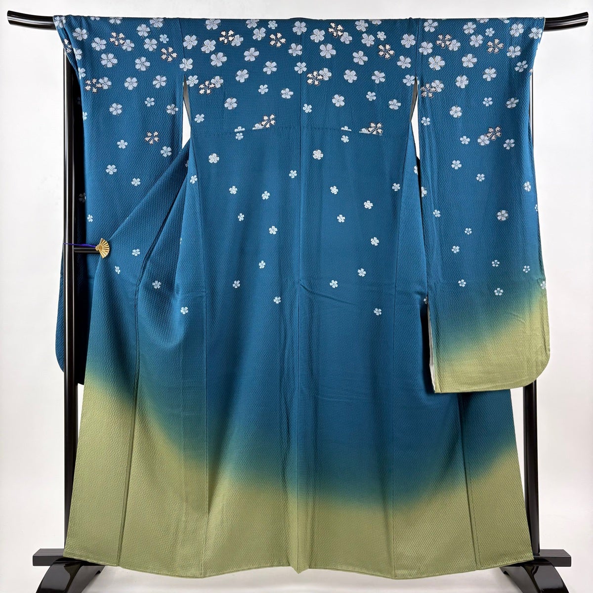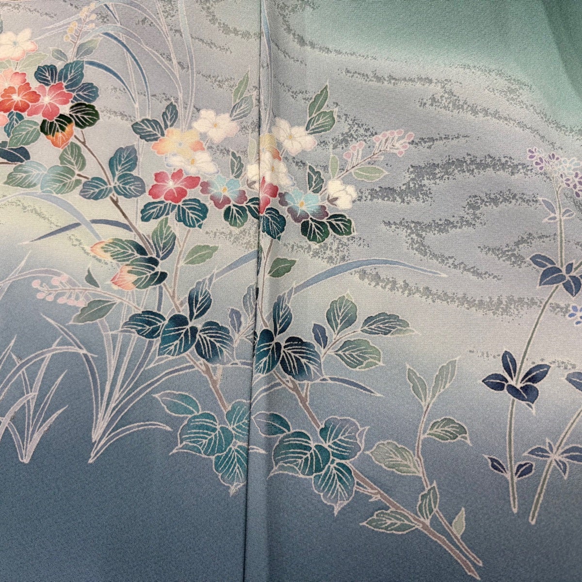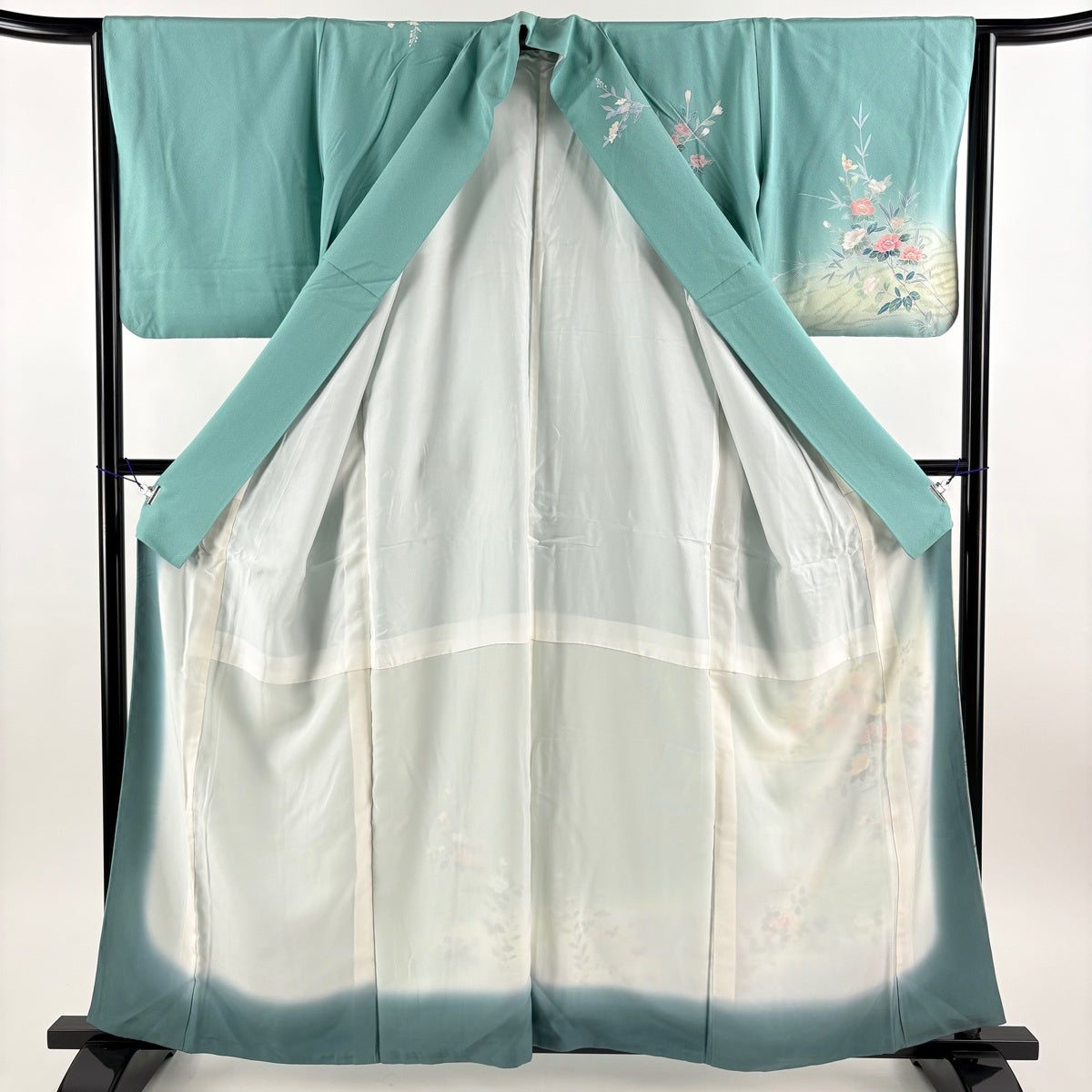 振袖 身丈160.5cm 裄丈70cm L 袷 花 金彩 染め分け 青緑 正絹 秀品
