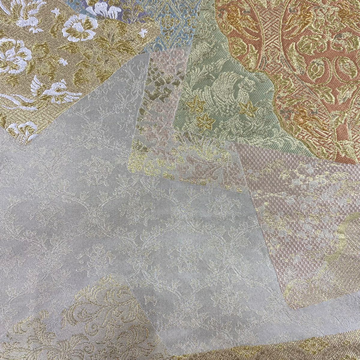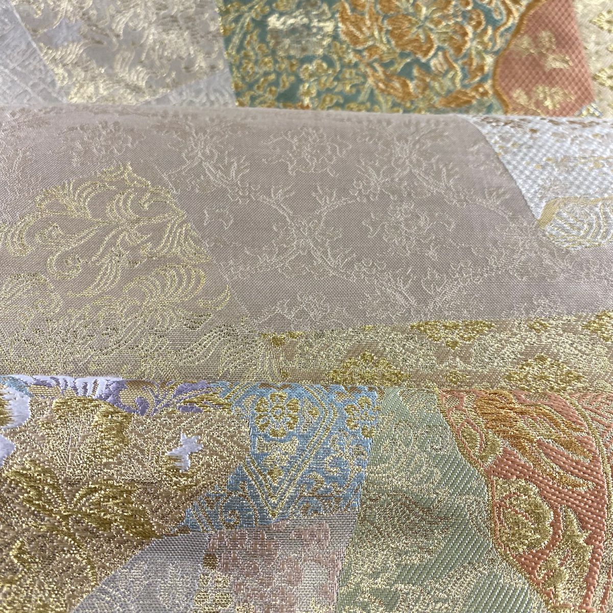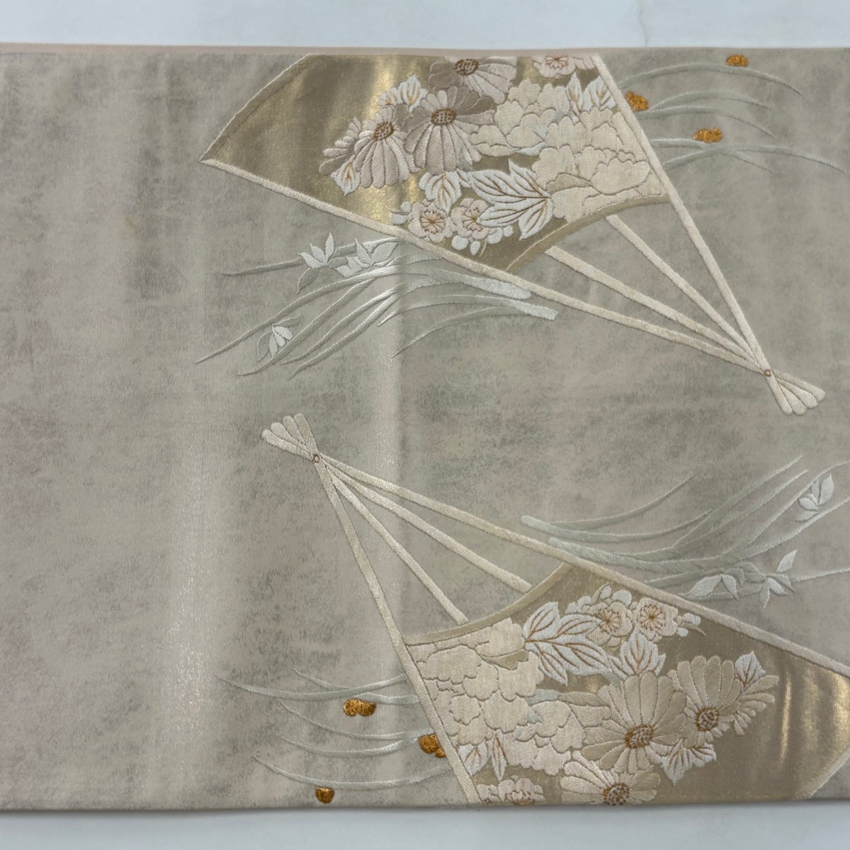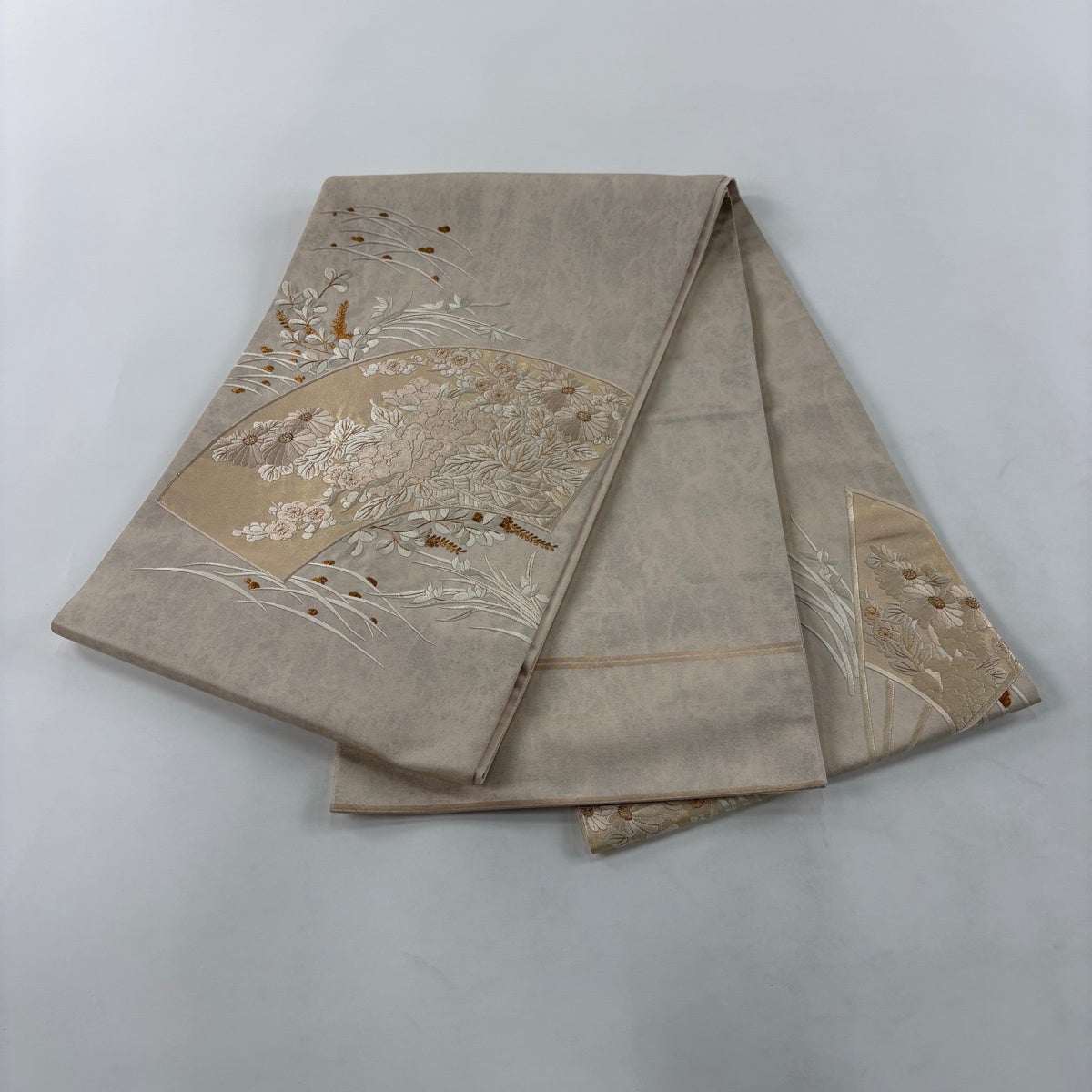 袋帯 秀品 関西仕立て 扇面 牡丹 箔 刺繍 ピンクベージュ お太鼓柄 正絹