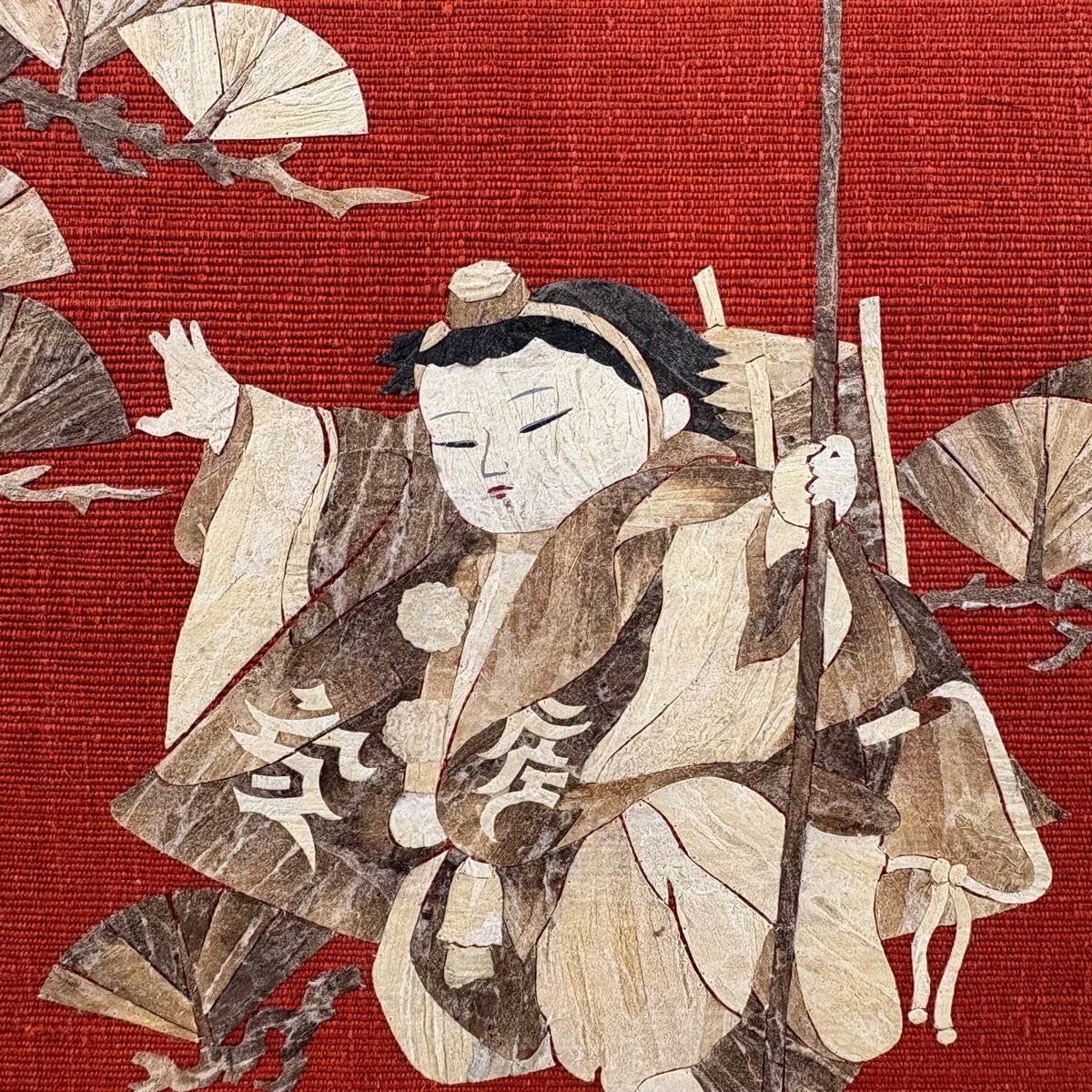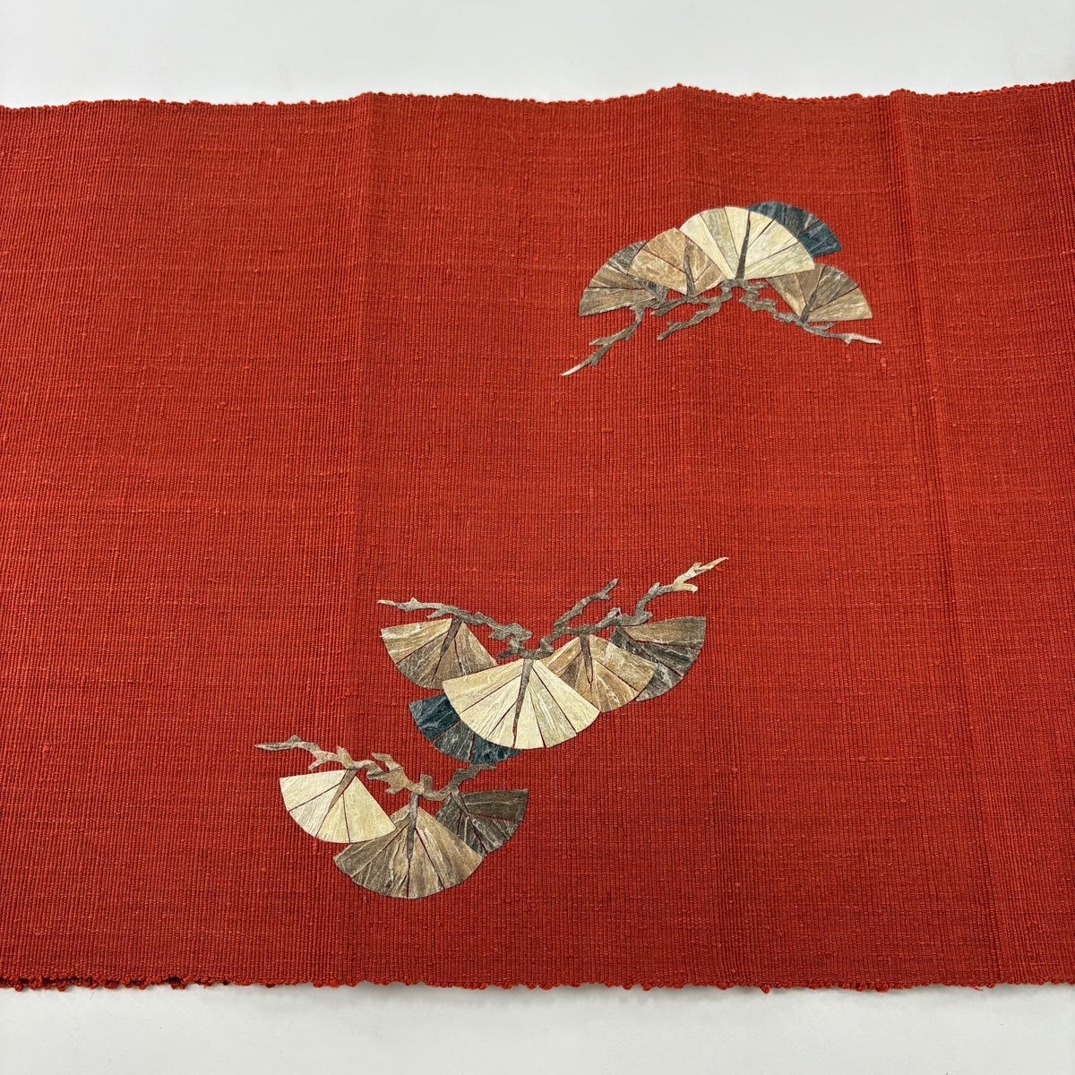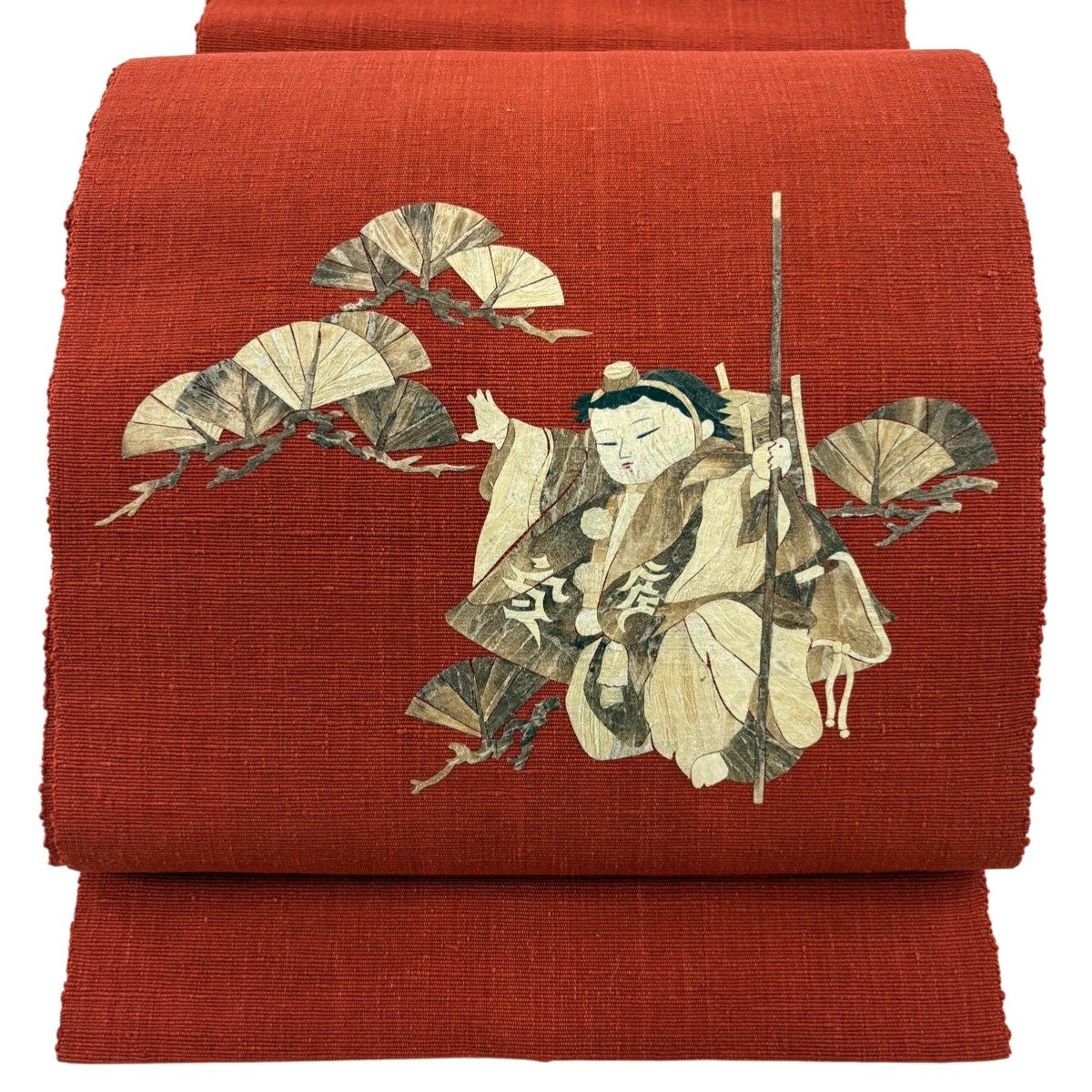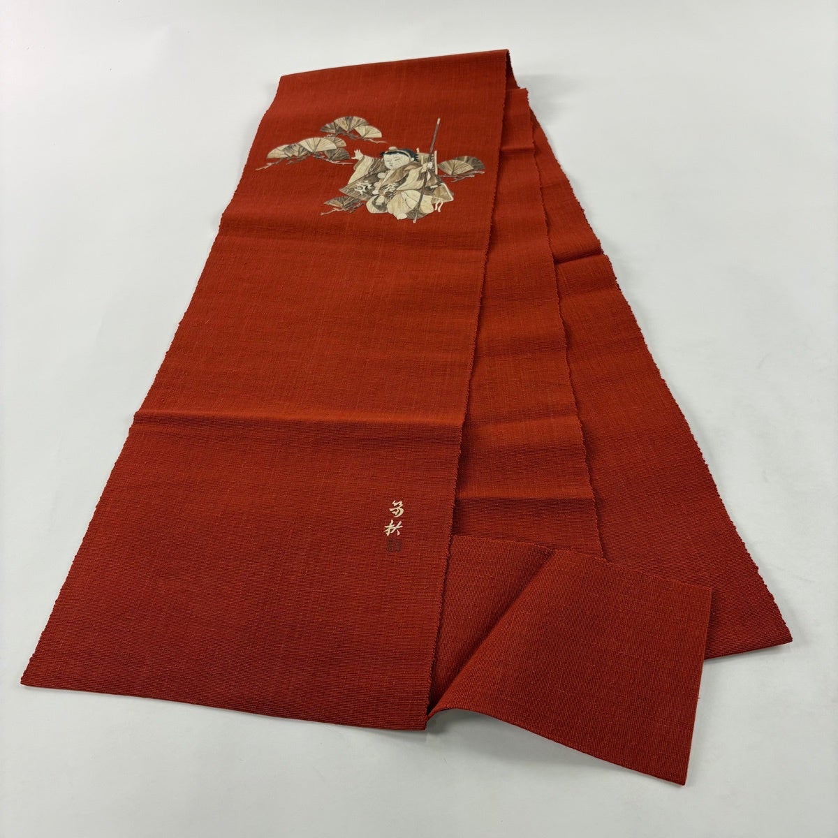 【美品】 名古屋帯 秀品 落款あり 田尾笛秋 松葉仕立て 八寸名古屋帯 童 松 茜色 正絹