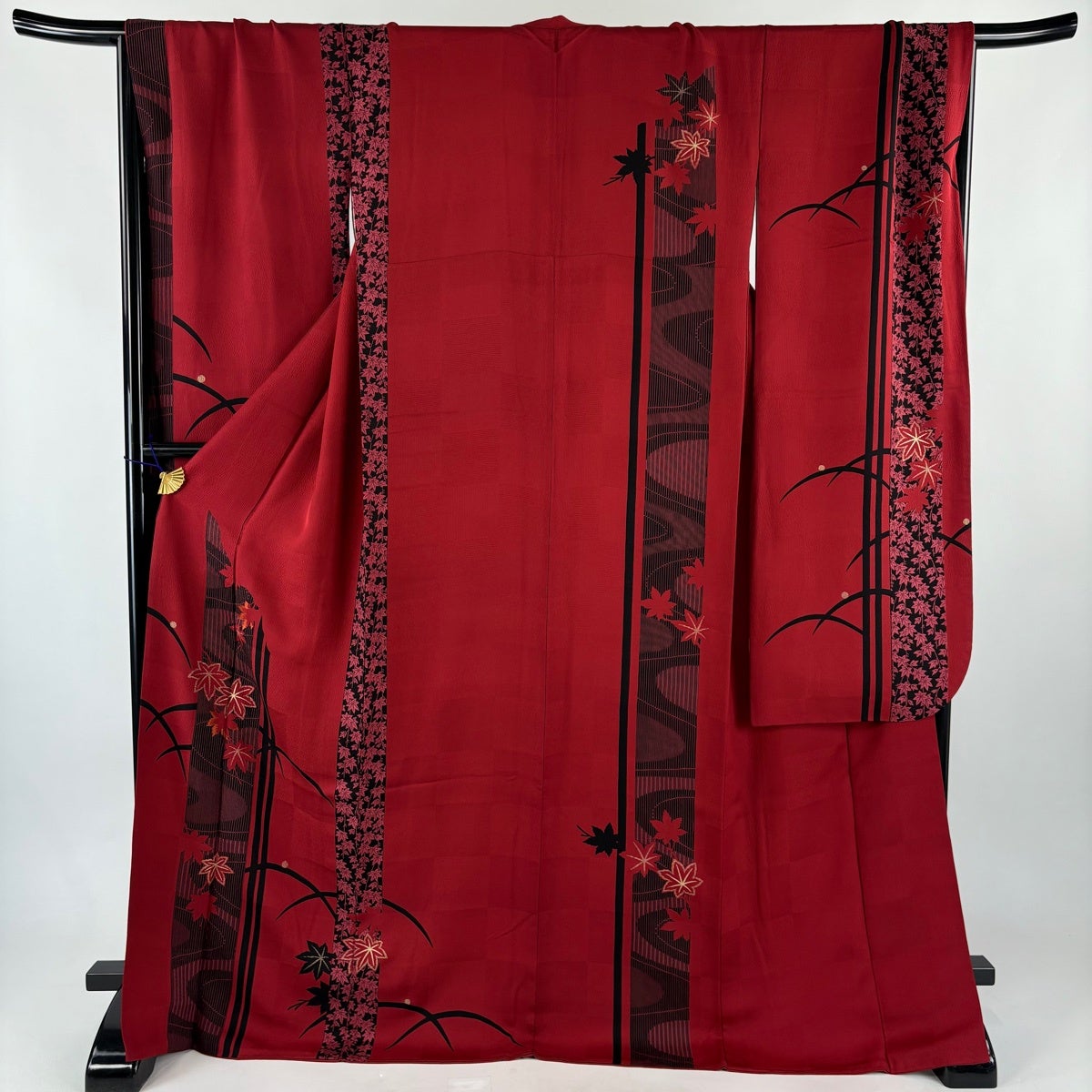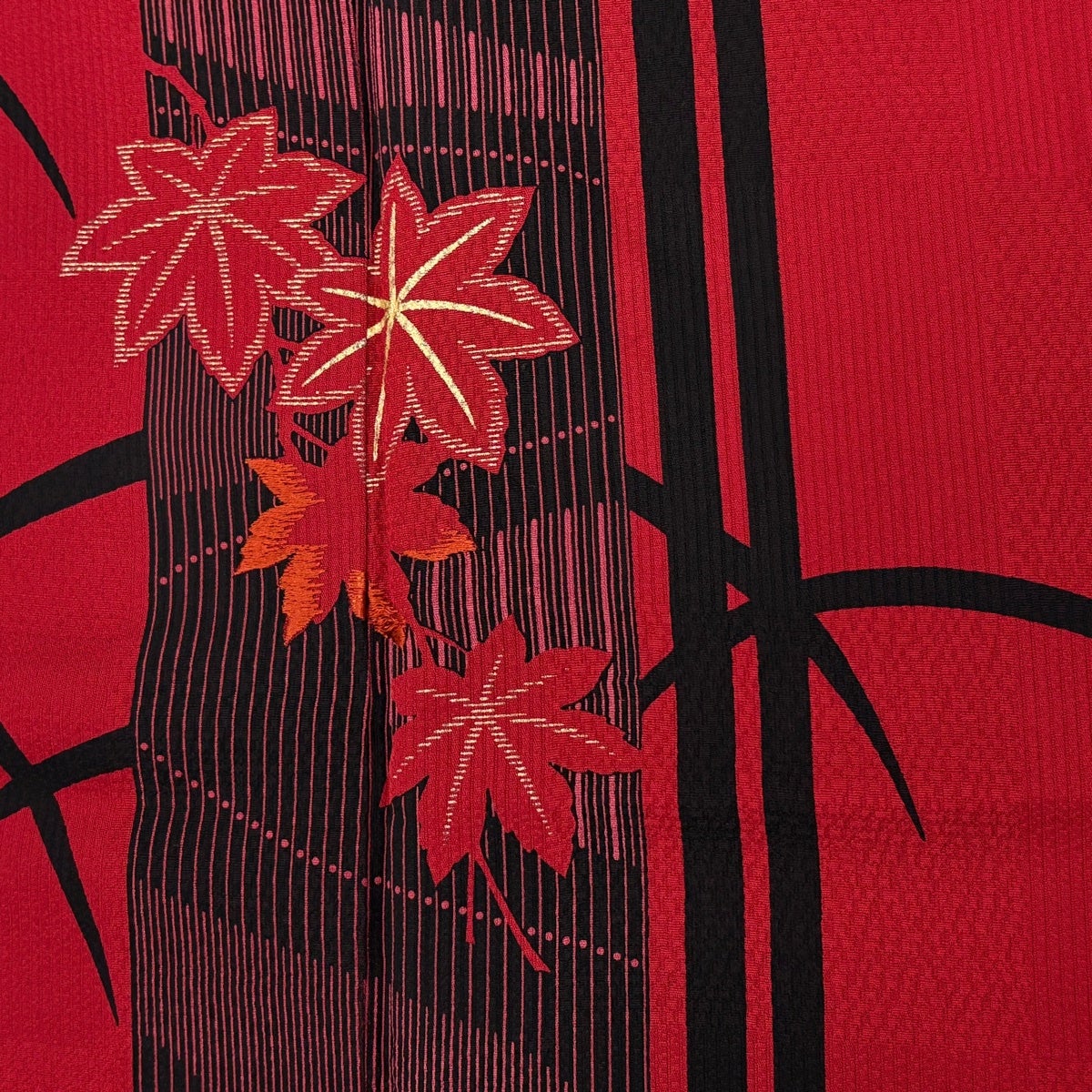 振袖 身丈172.5cm 裄丈70cm L 袷 紅葉 縞 金彩 刺繍 赤 正絹 秀品