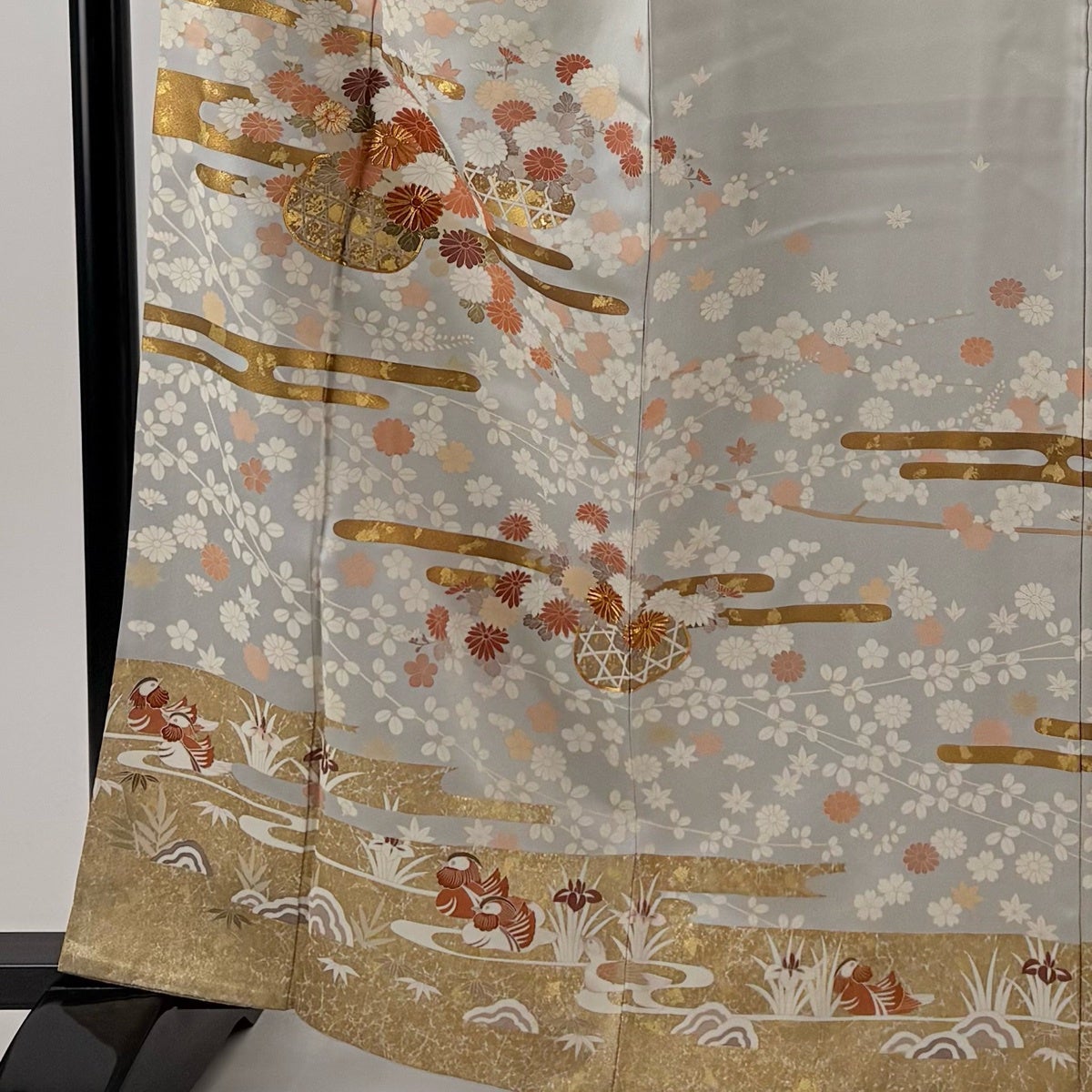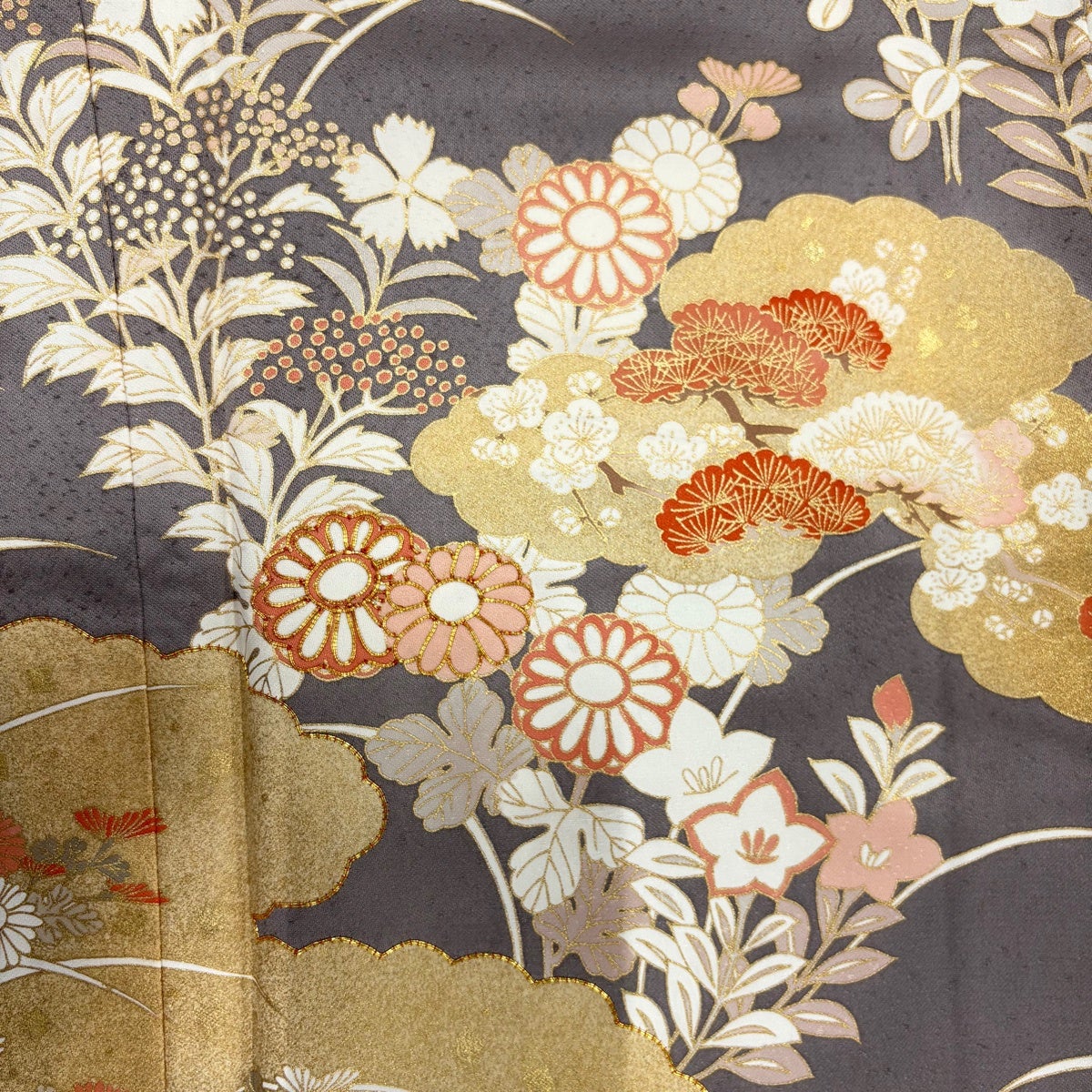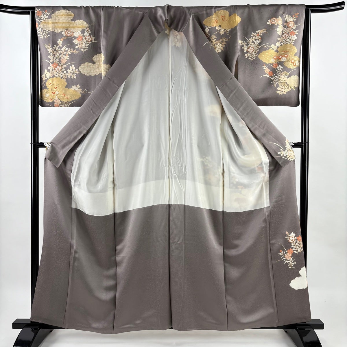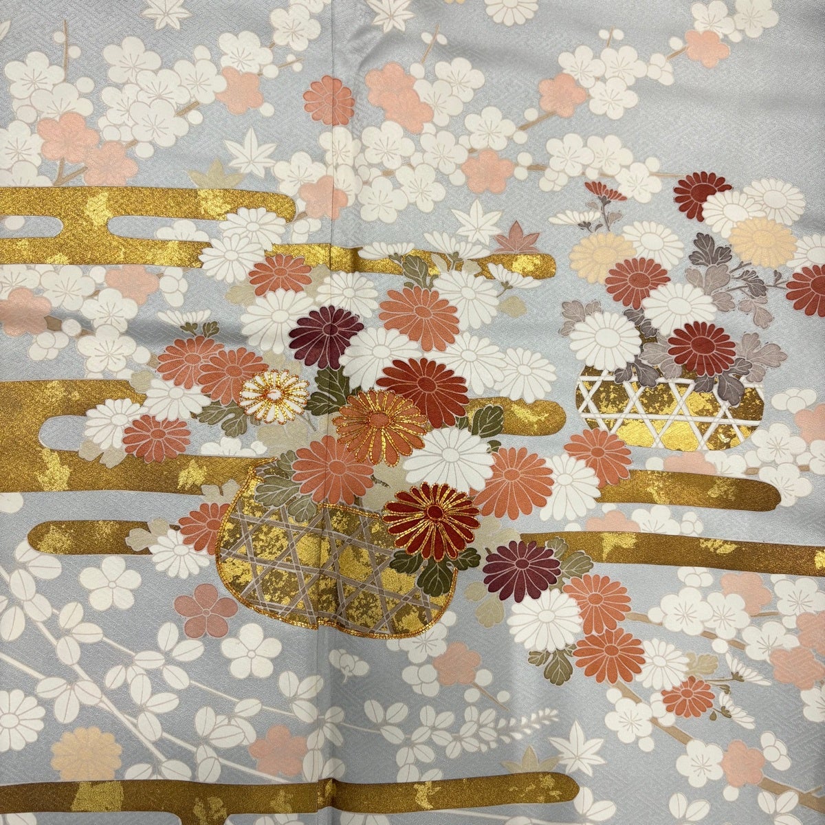 訪問着 身丈164cm 裄丈65cm M 袷 花籠 枝梅 金糸 金彩 灰色 正絹 秀品