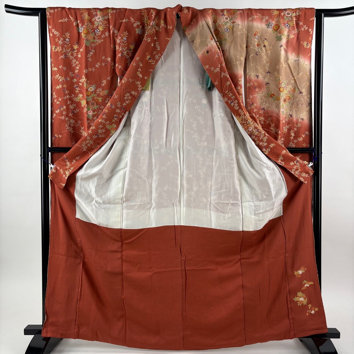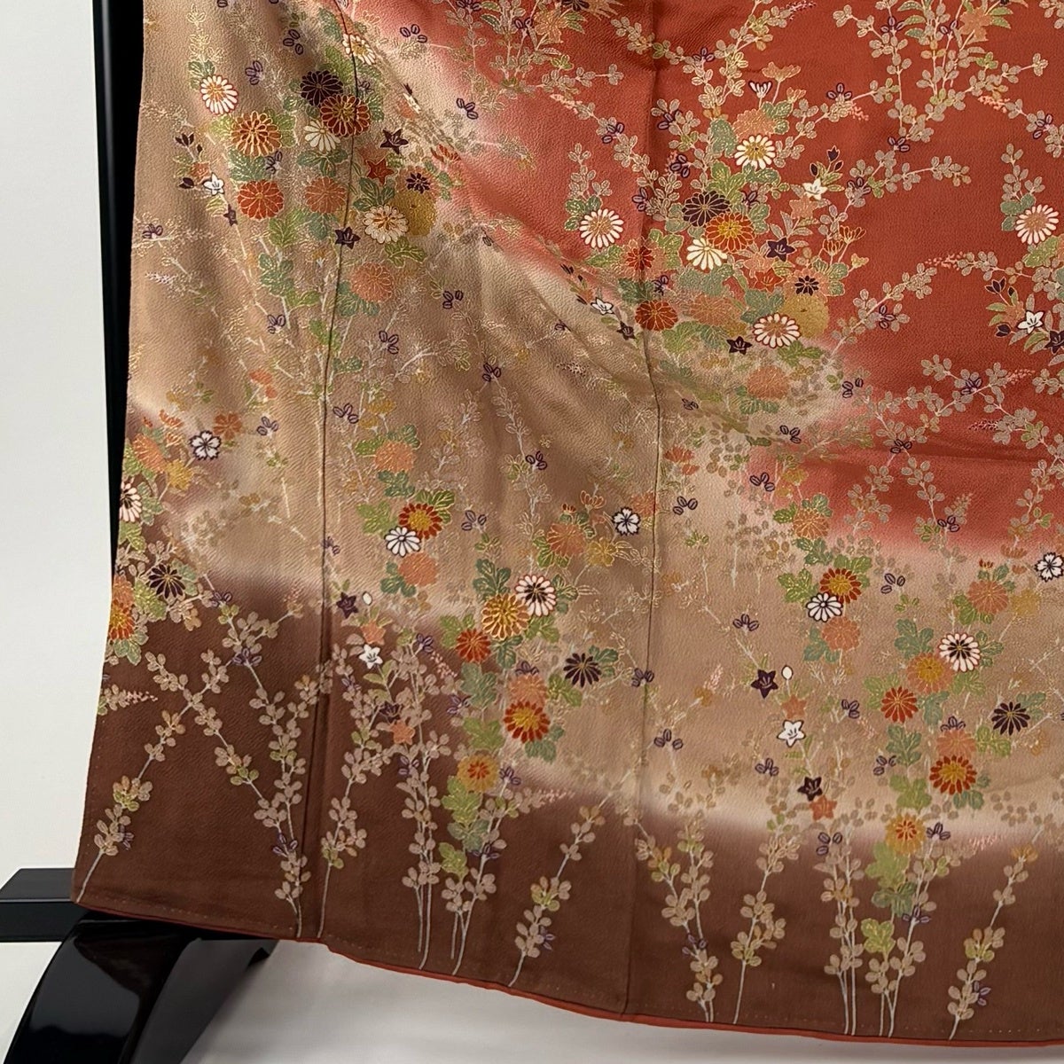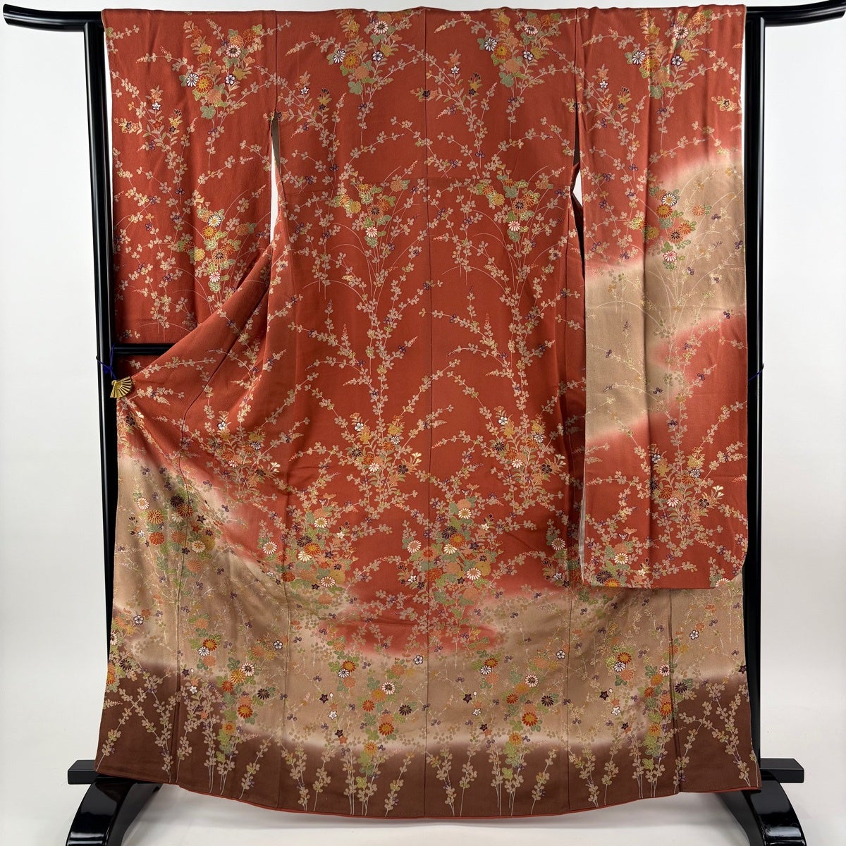 振袖 身丈166cm 裄丈63.5cm S 袷 秋草 霞 金糸 金彩 赤茶 正絹 秀品