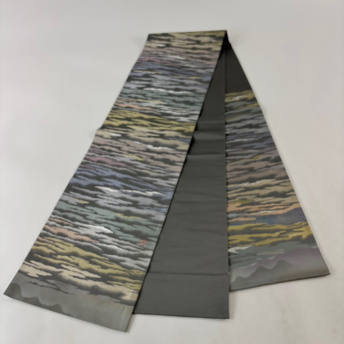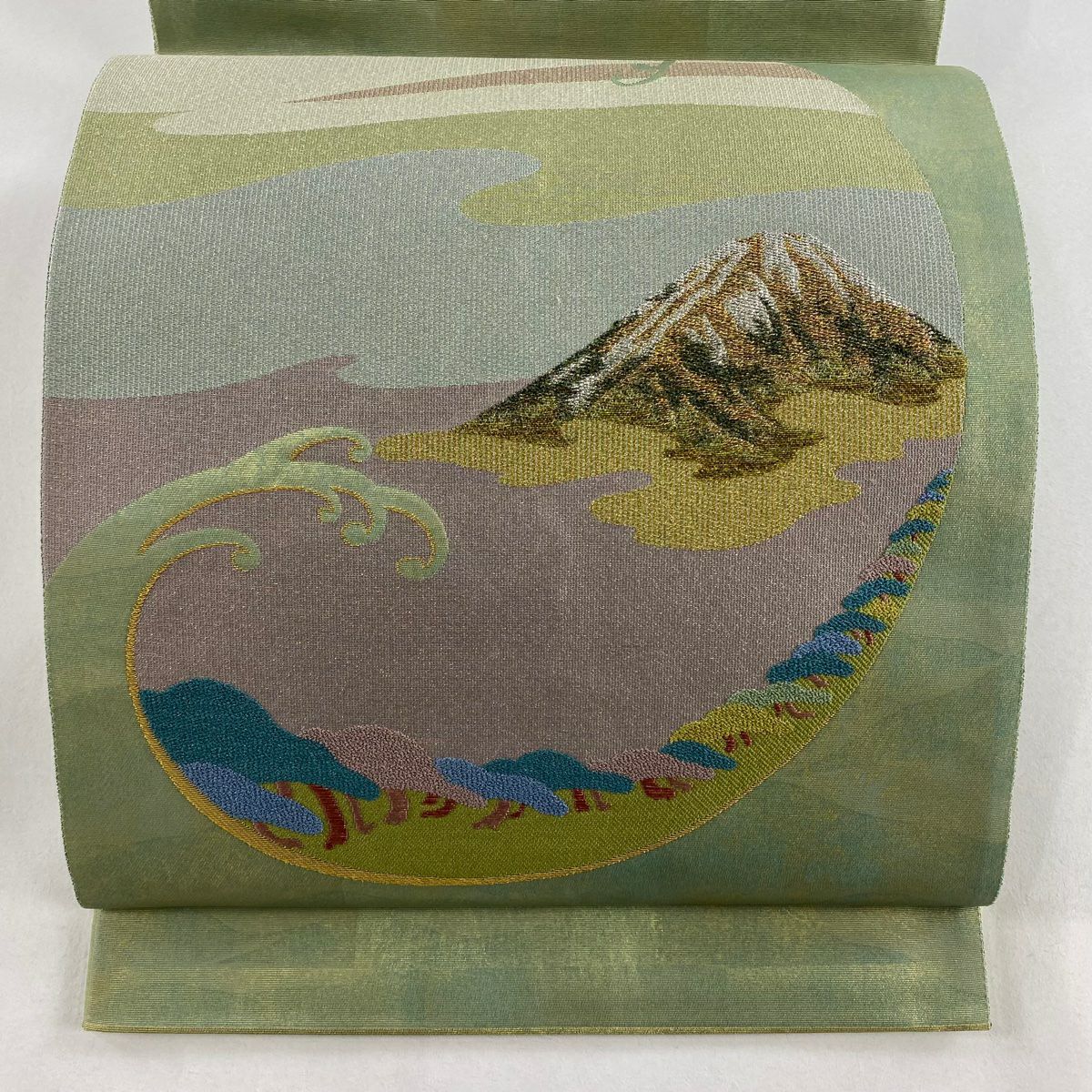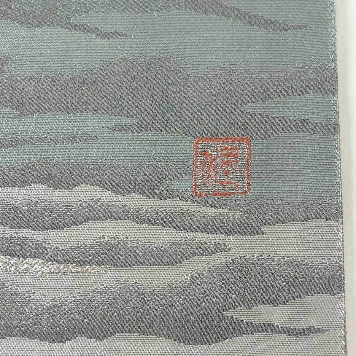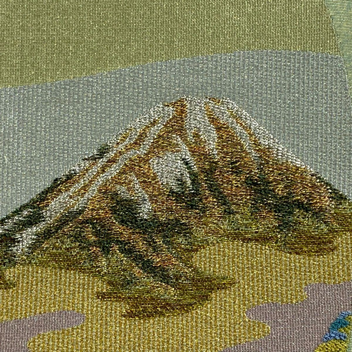 【美品】 袋帯 秀品 落款あり 山並み かすみ雲 金銀糸 箔 灰緑 お太鼓柄 正絹