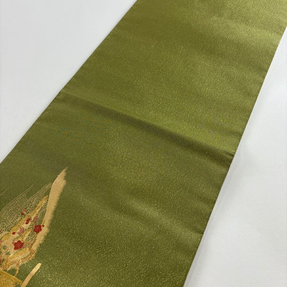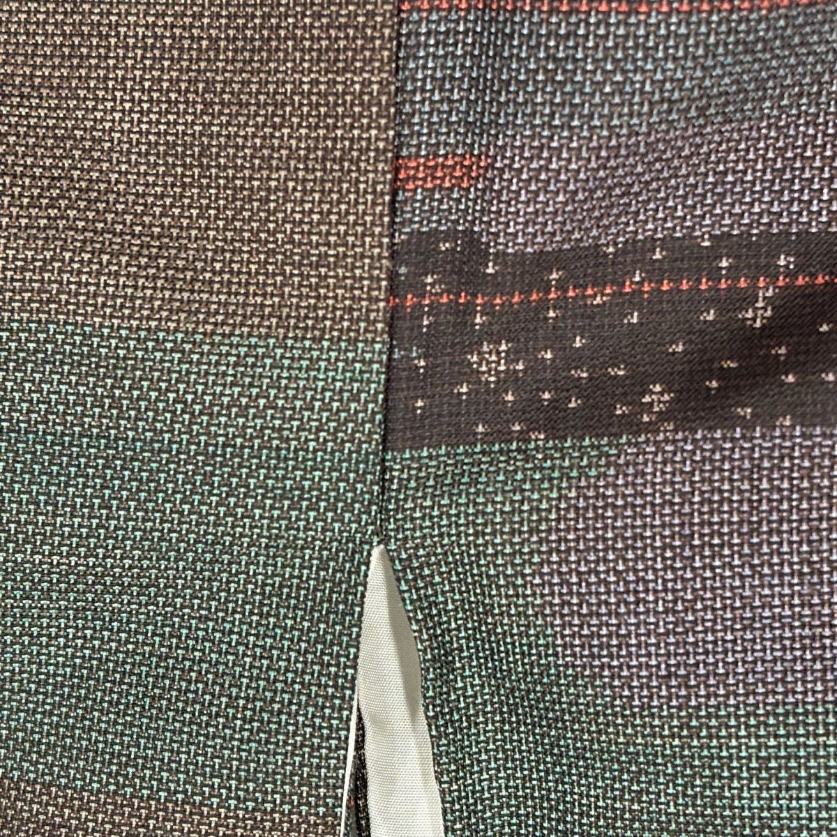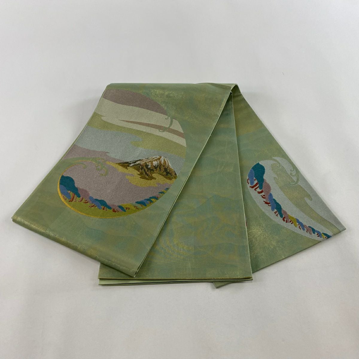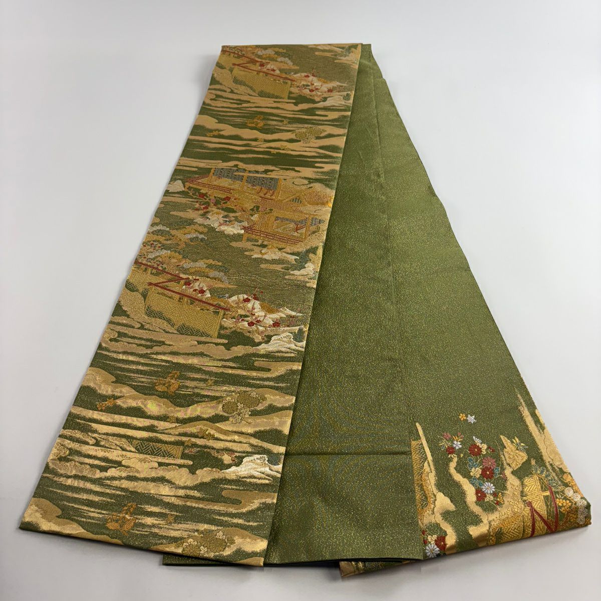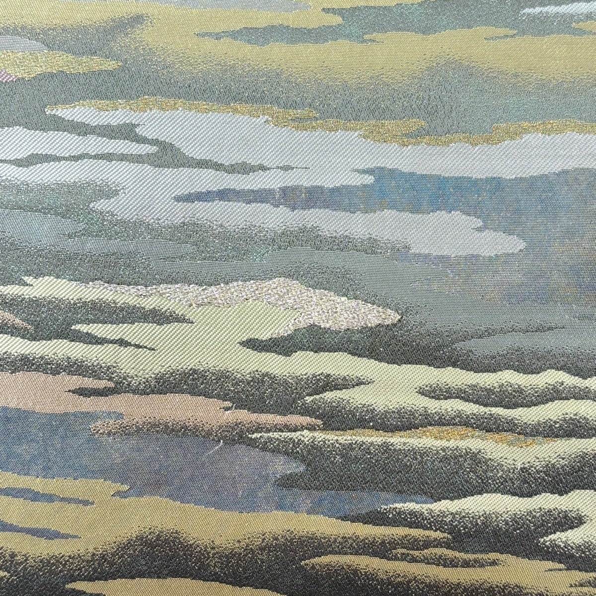 【美品】 袋帯 秀品 落款あり 山並み かすみ雲 金銀糸 箔 灰緑 お太鼓柄 正絹