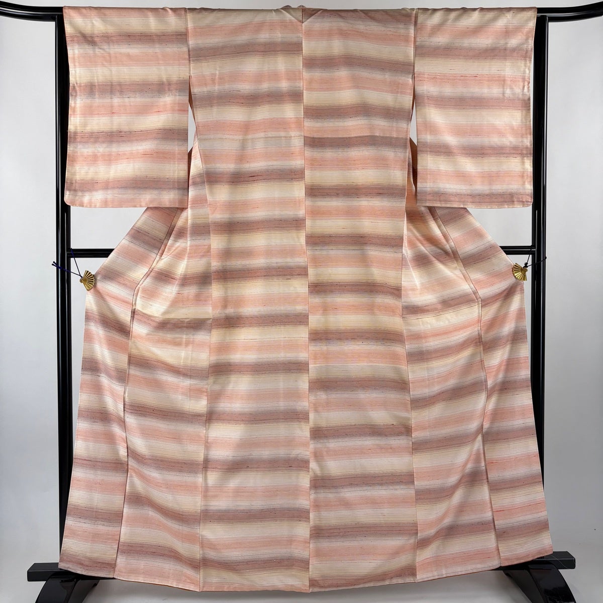 【美品】 紬 身丈162.5cm 裄丈64cm M 袷 段縞 薄オレンジ 正絹 秀品
