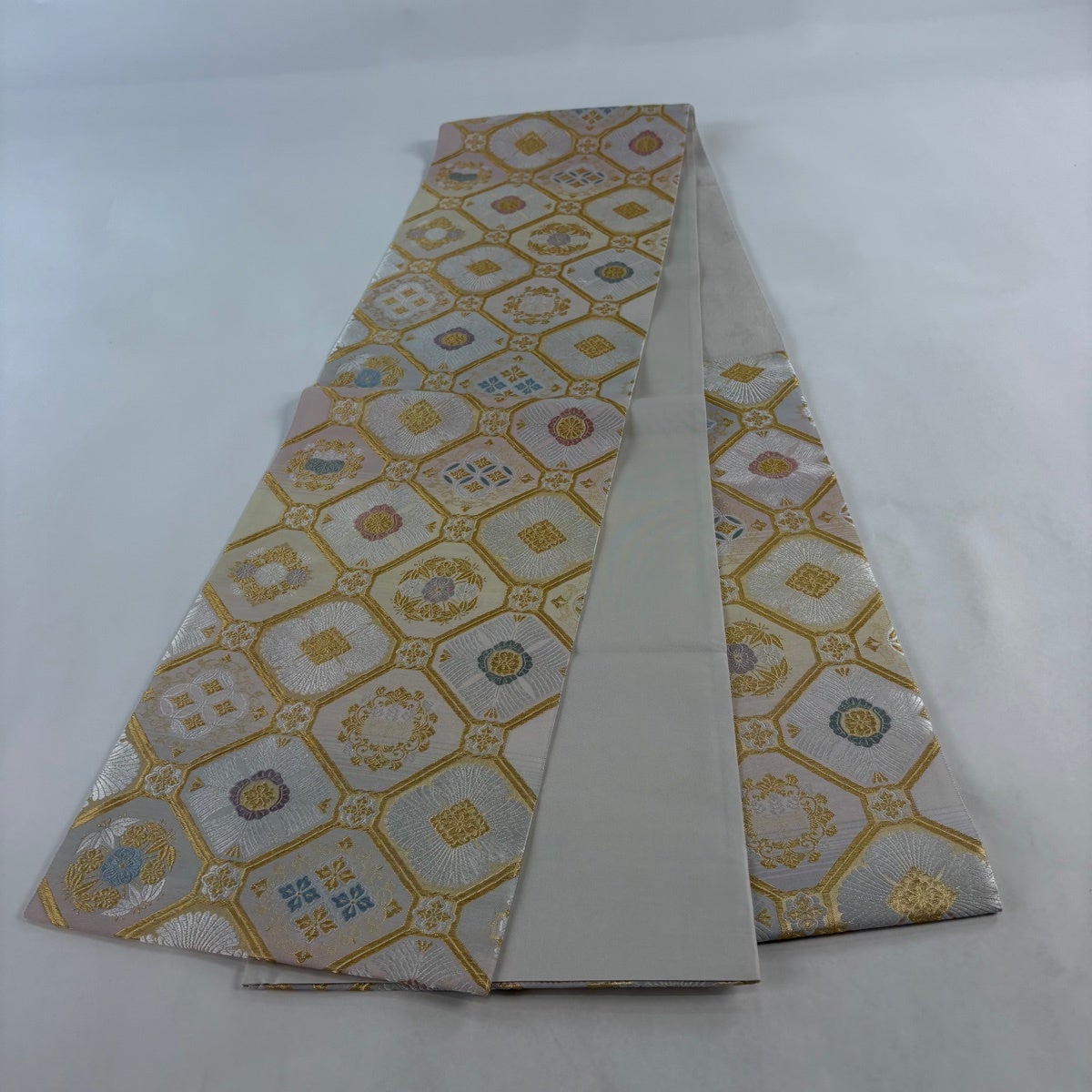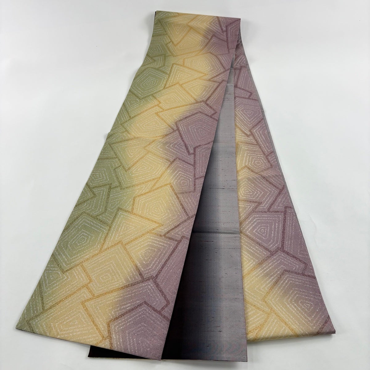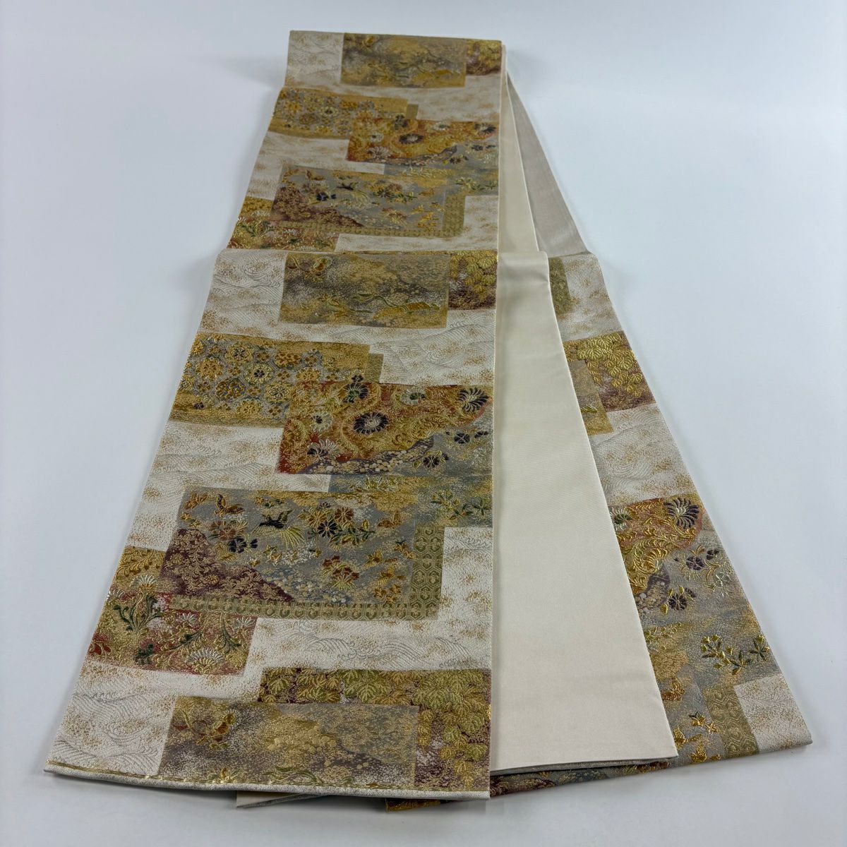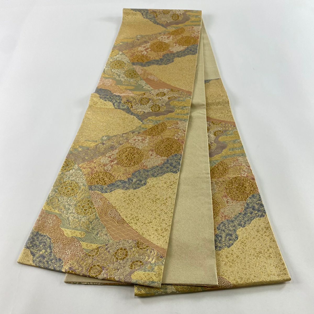 【美品】 袋帯 秀品 紬地 ますいわ屋 幾何学模様 ぼかし ベージュ 全通 正絹