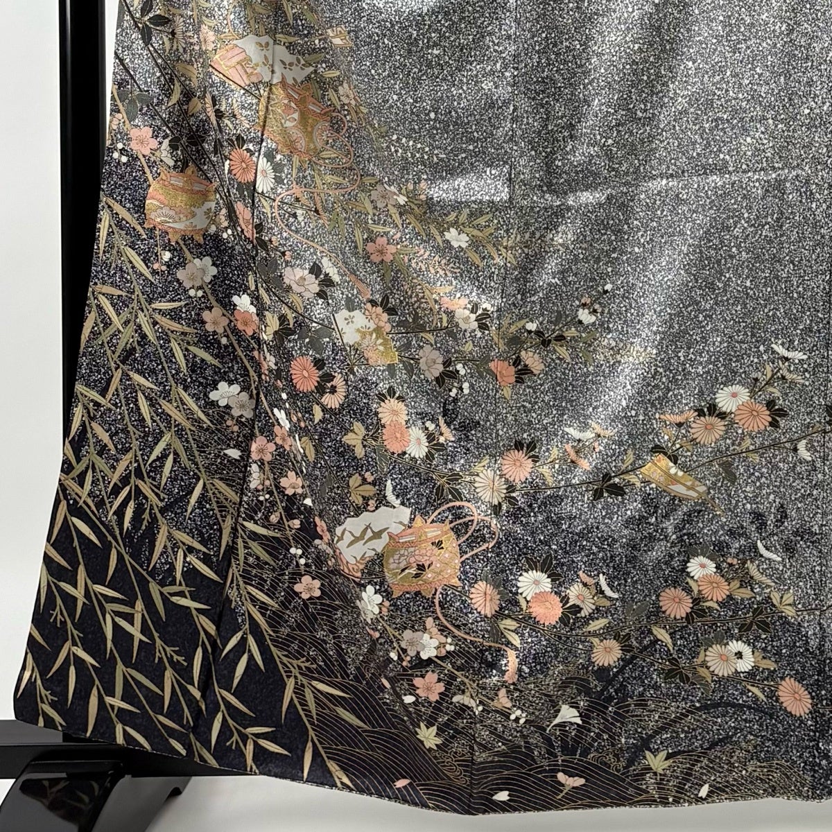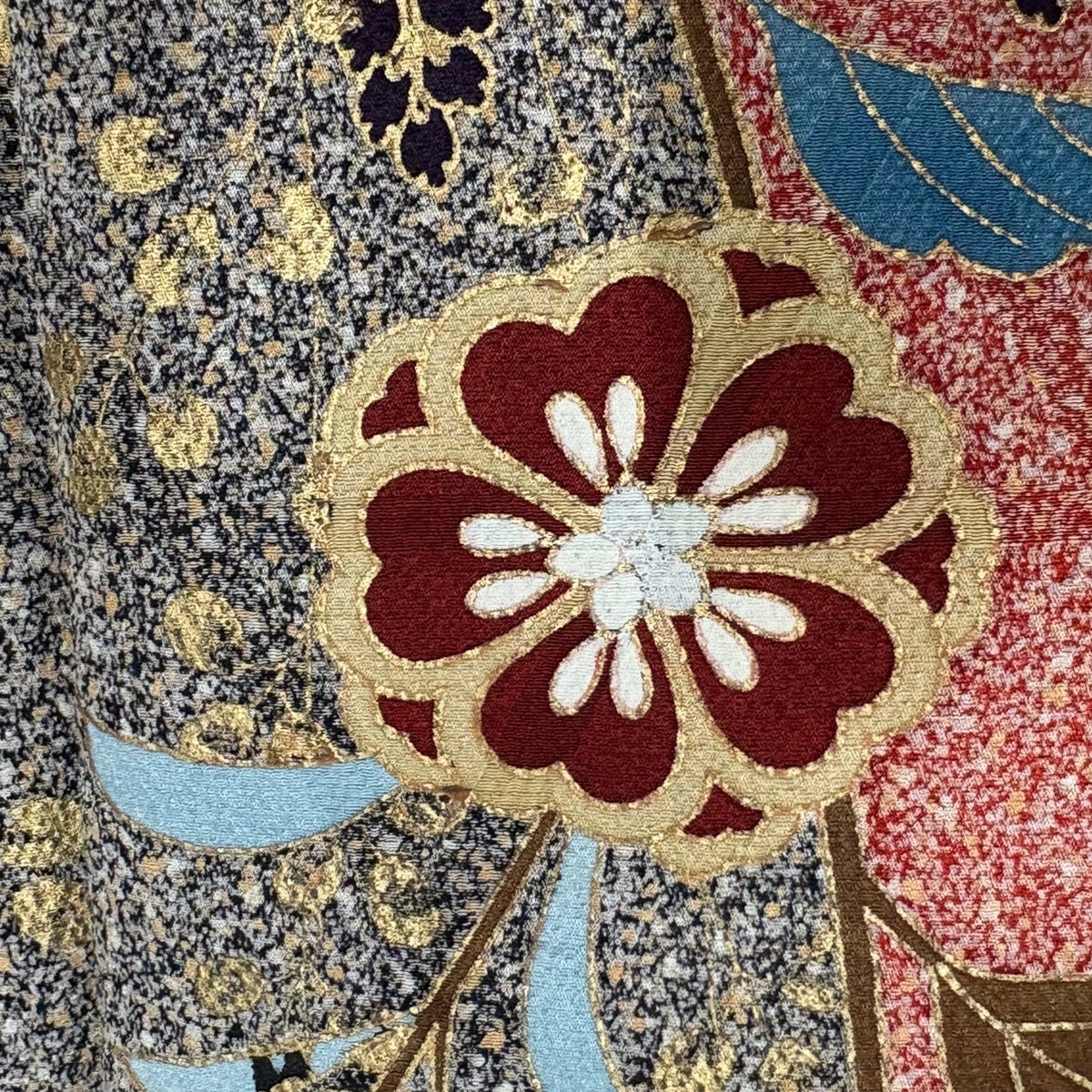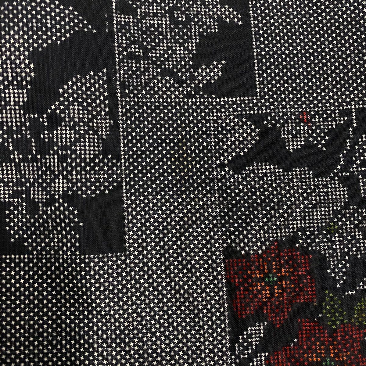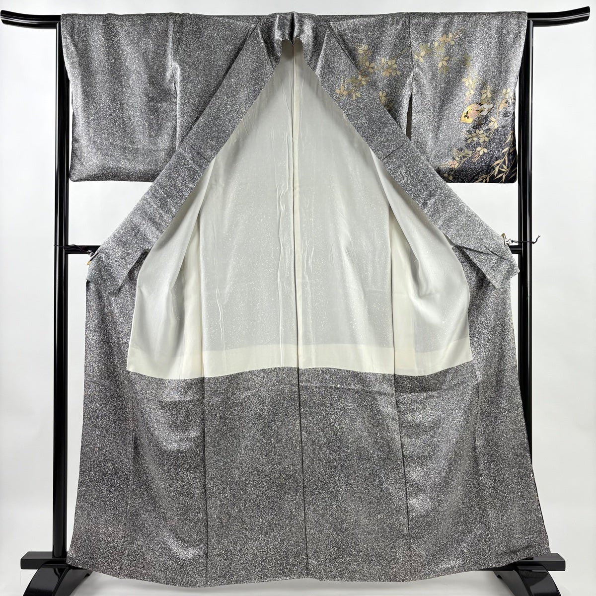 振袖 身丈161.5cm 裄丈66cm M 袷 貝桶 草花 金糸 刺繍 黒 正絹 秀品